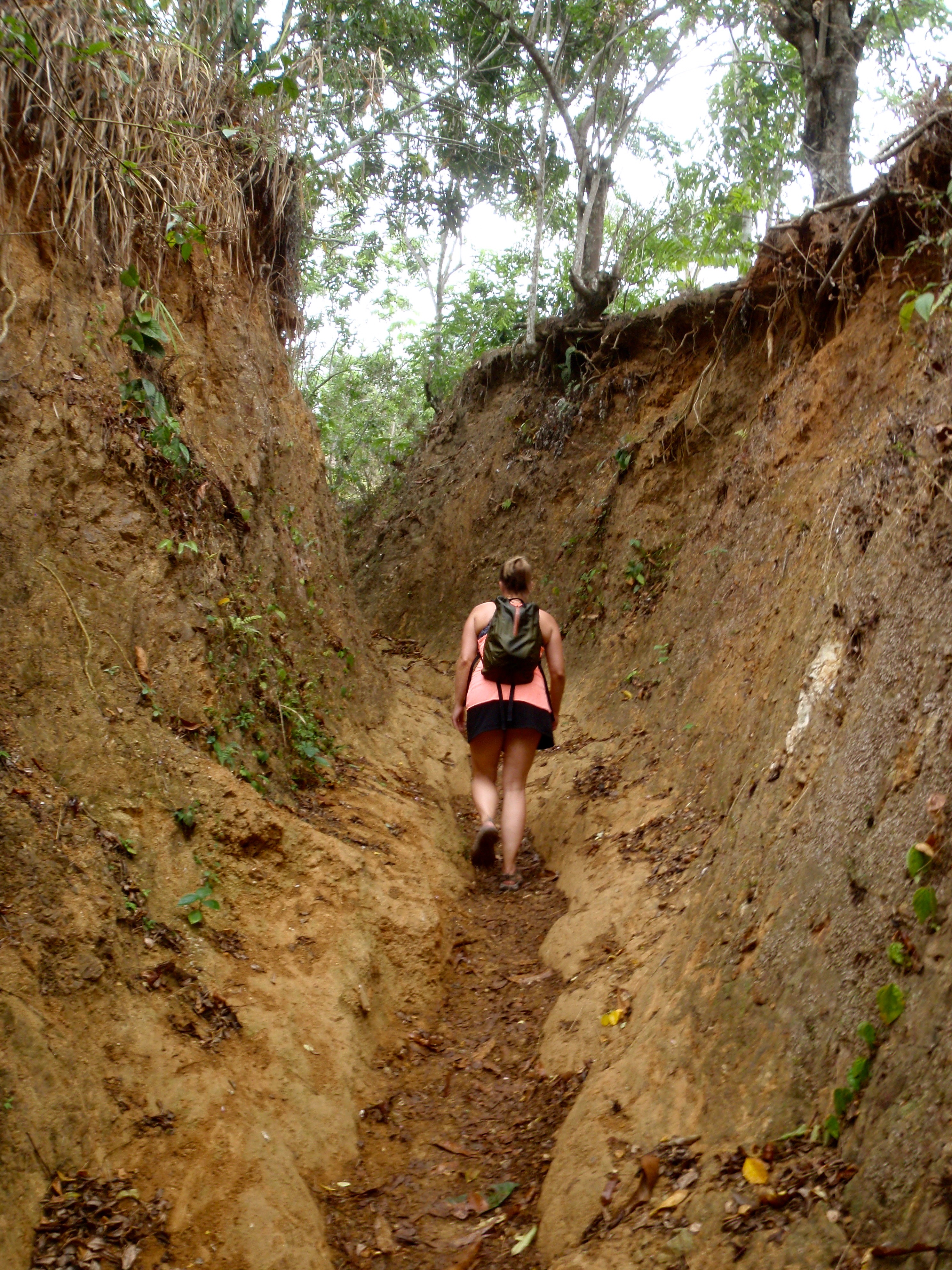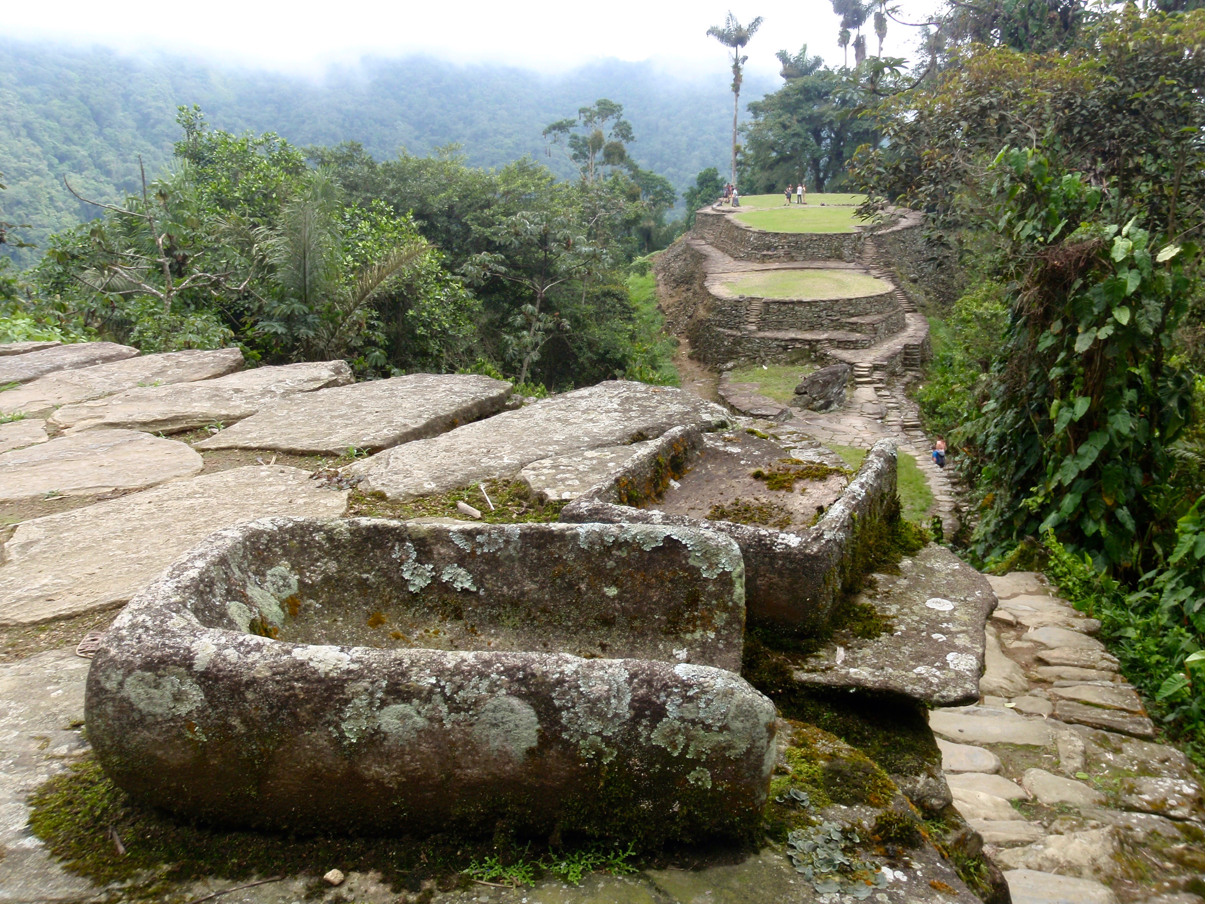 After scuba diving was complete we were off to La Ciudad Perdida (The Lost City) on a 4-day trek for $1,400,000 COP. This was very pricy but claiming to be the next Machu Picchu so we couldn’t miss it. Headed to the office in Santa Marta to pick up a few others (Jasmine, David, and Karen), and drove a couple hours to a big house for lunch of chicken with many people. Met with the Non-English guide then headed out on the hike. It was super hot and sweaty then turned into pouring rain. This occurred every day of our hike; what to expect in the jungle I guess. We went up and down and up and down through the hills that were super muddy and everyone was slipping and falling. Got to the first camp, 7 km hike in, still pouring rain. Changed our clothes, had a nice dinner and then crawled into our open air bunks with mosquito nets. Odd seeing how the locals were all huddled together watching TV way out in this remote area, while we were trying to get away from it all. Early wake up on day two and on the trail by 6:30 am, super hot and sweaty already. Stopped for lunch and had a swim in the river then off to the next camp; 15 km this day. This was where we met “Max” the black dog who stayed with us for the next two days, like an escort. Day three was the Lost City. We started off with a short hike over the river then started up the 1200 stone steps to gain about 200 meters in elevation. Zillions of mosquitos and Shannon forgot the bug spray so no one could stand still. We reached the Lost City and to our surprise there was Military all over it with guns standing guard. There had been reports of grave robbers in the past as the original residents were buried with gold in their graves. We spent about an hour or two up there admiring the stone work and level housing platforms. All the original houses had been destroyed over the years but your imagination could sure run wild in this place. You could just sit in one spot and imagine what it would have been like when this place was bustling. We headed back to camp, grabbed our stuff and hiked all the way to the first camp. As always, a refreshing and rewarding swim in the local watering hole with some cliff jumping as well. One of the local little girls admired Shannon’s sarong a bit more than she should have and it ended up being returned the following day in the next locals village. We also had the privilege of listening to a local man speak of Tayrona culture with the assistance of a translator. Such a great experience and I am so pleased to take it in before the mass of tourism floods the area.
