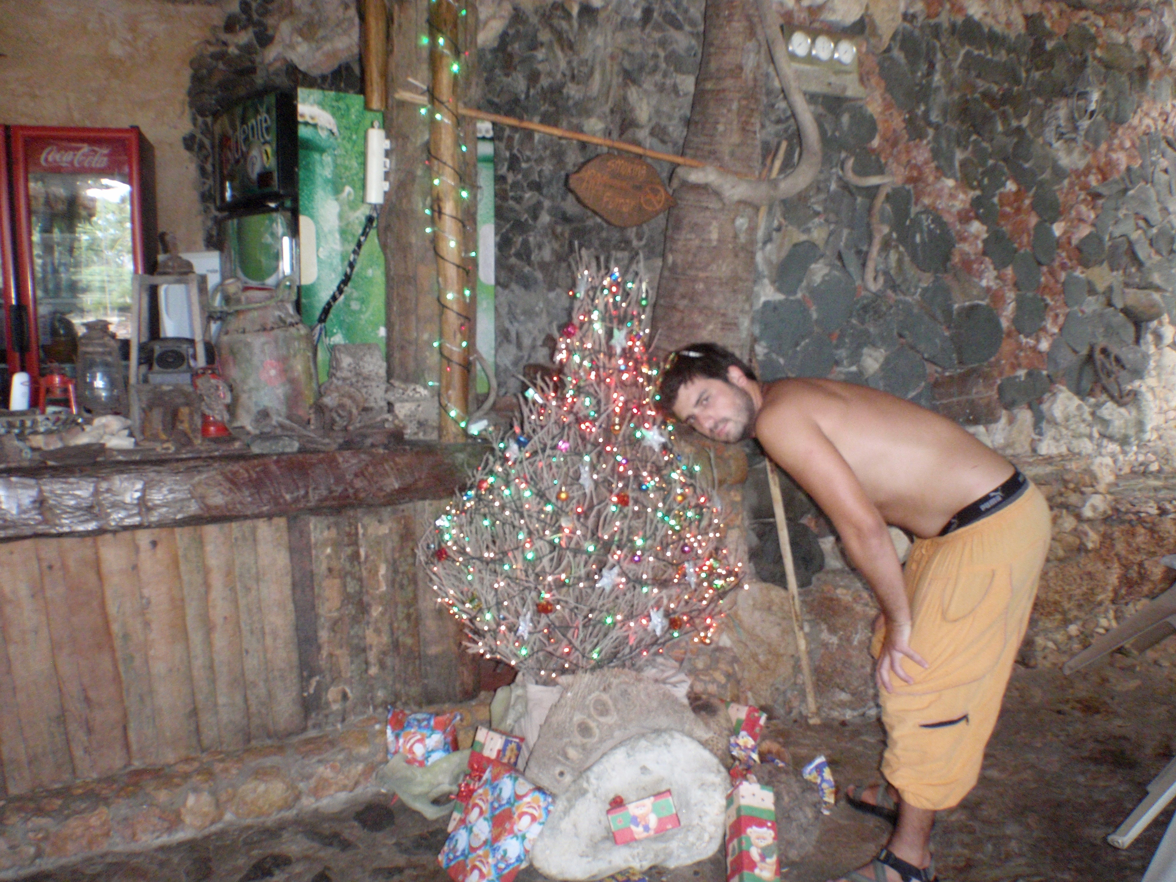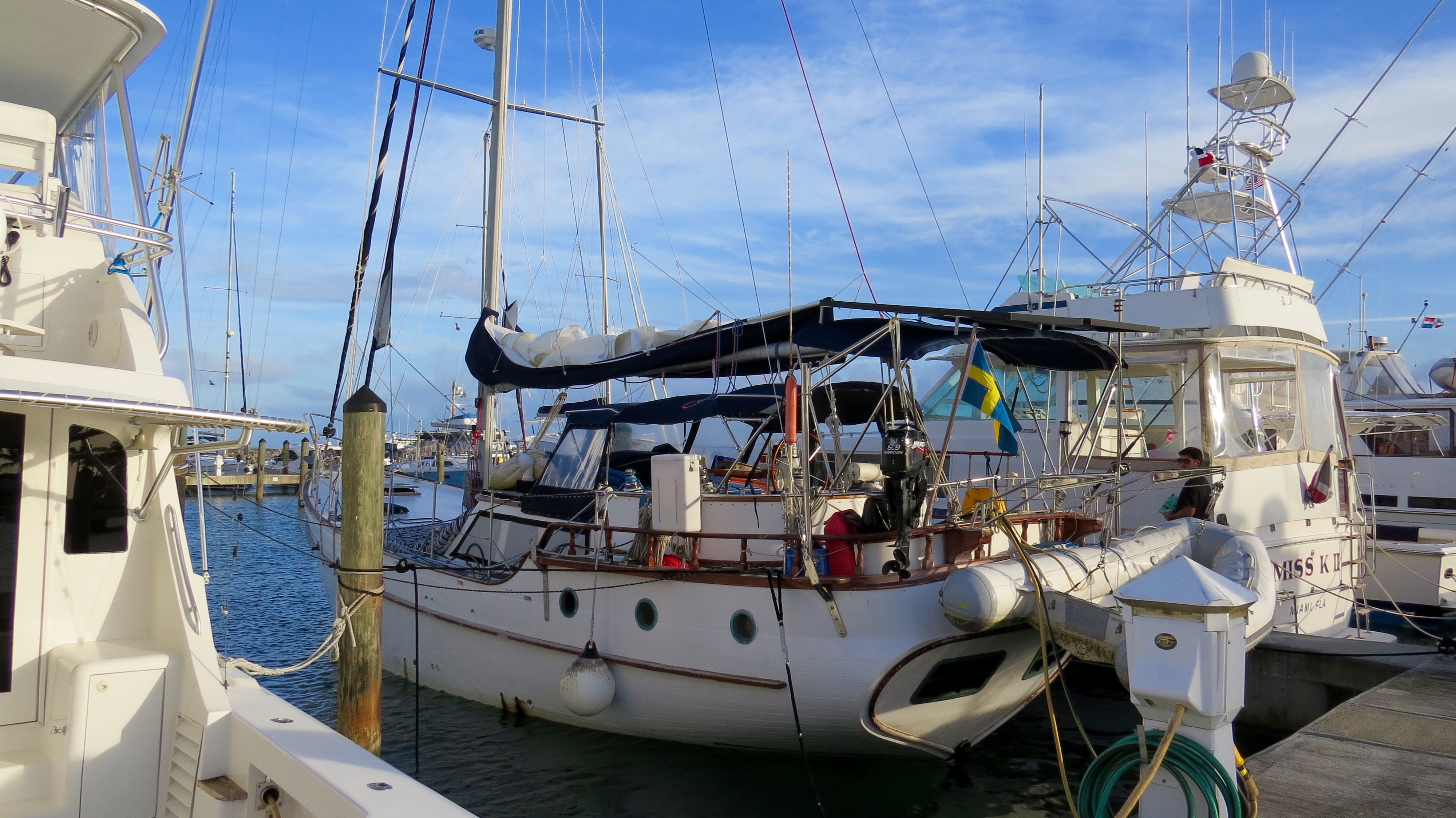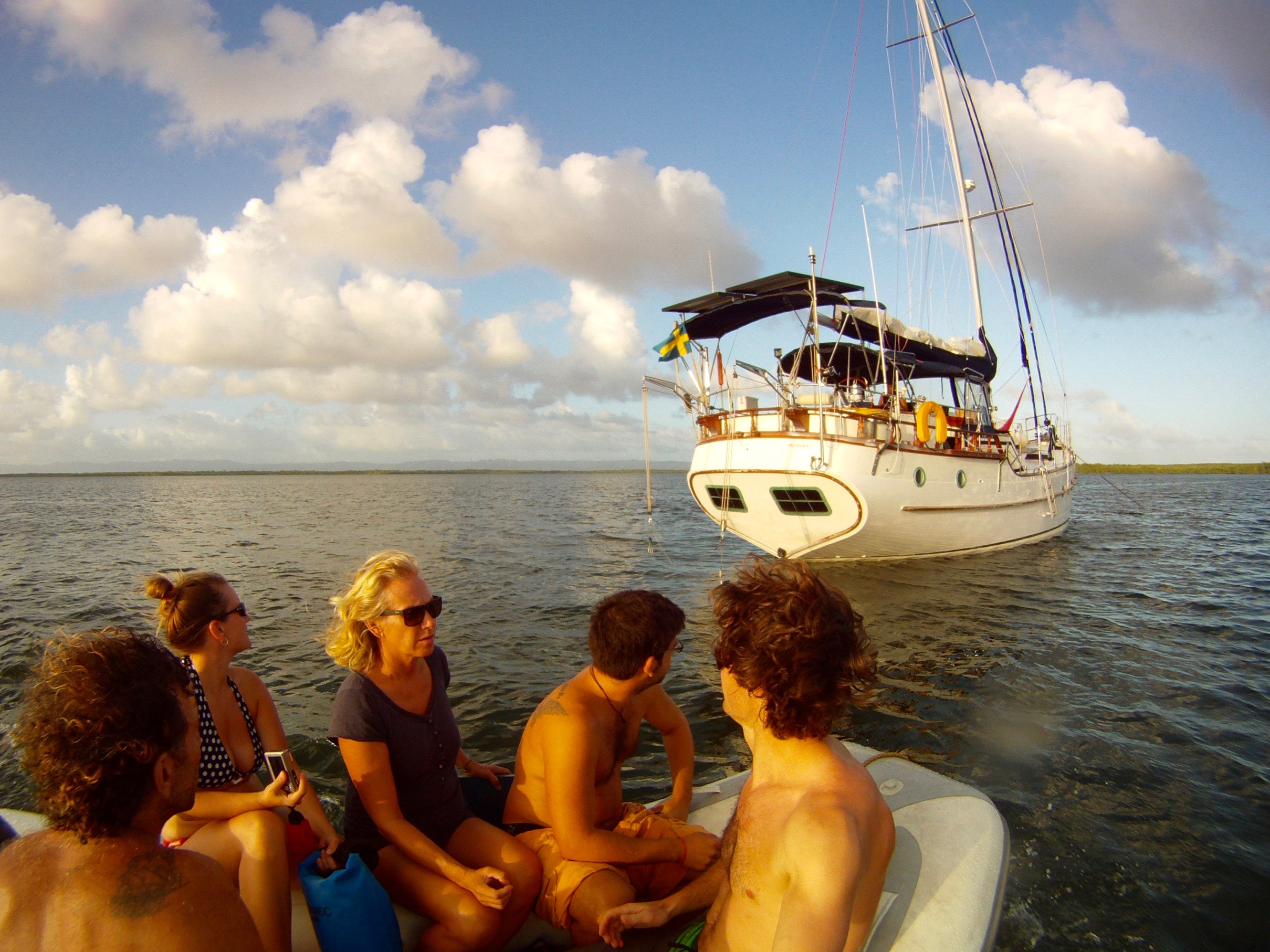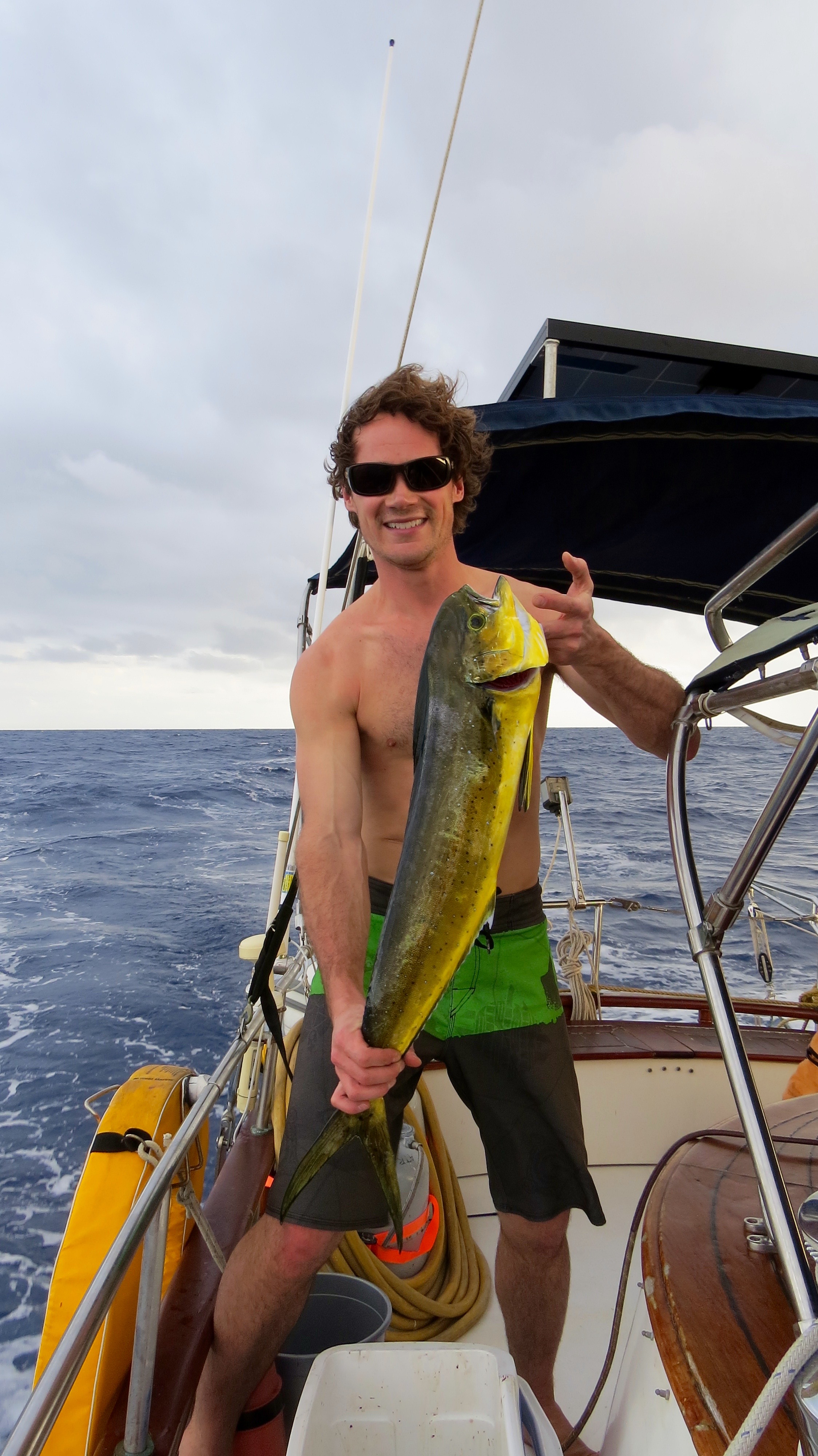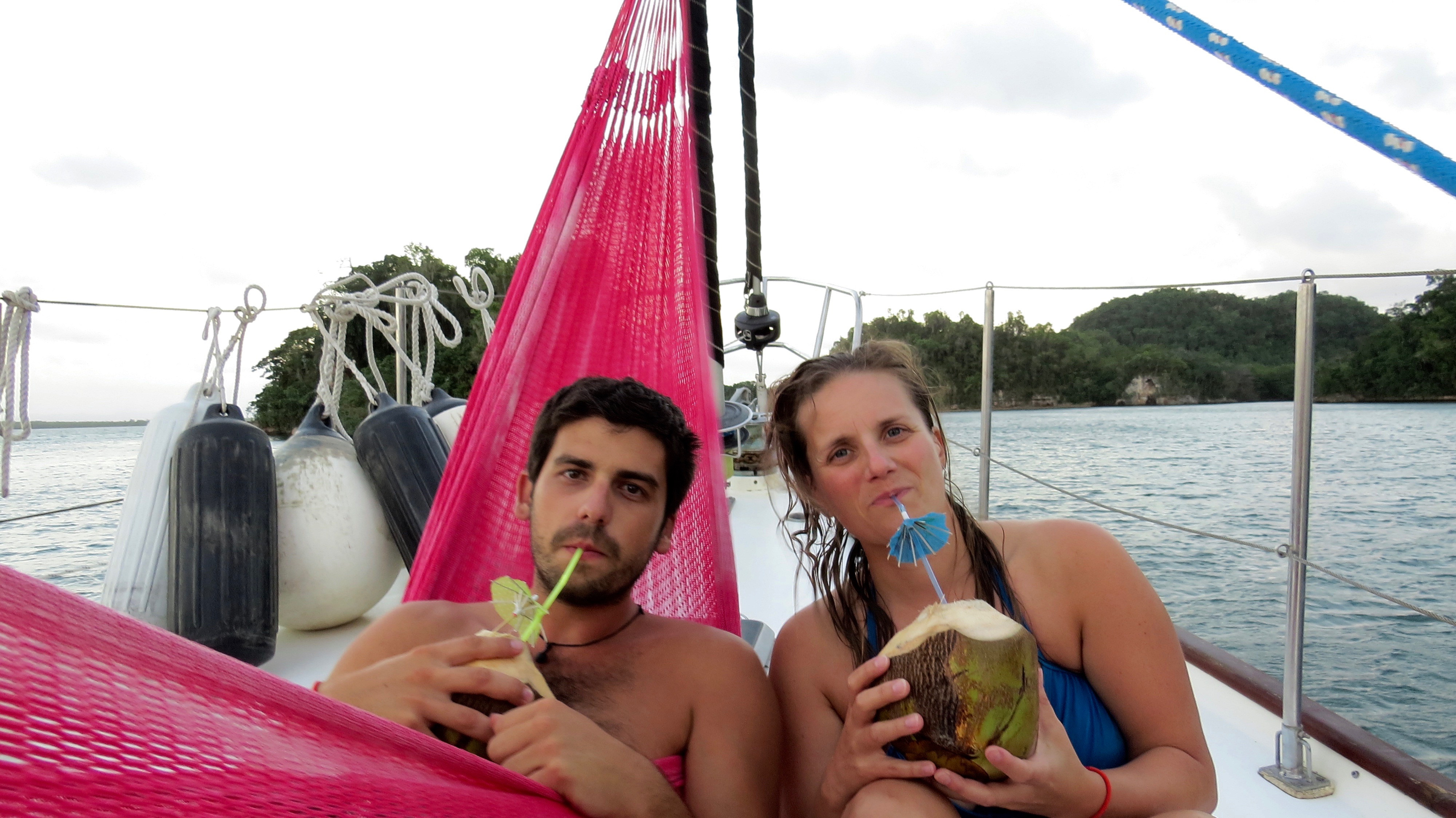 Next day we set sail west again to Aguadilla a further 8 hours by boat. Again, Shannon was still feeling sick. December 19, one of our big sails, we headed from Puerto Rico across the open ocean to Dominican Republic, a 23 hour sail. I felt great, Shannon was ill. Eric threw in a fishing line and caught a 36″ Dorado and then just after that I caught my first ever fish, a 30″ Dorado. Lots of food for us to eat now. During the big crossings everyone took turns doing night watch. We just had make sure we were going the right direction, no boats were in our way, and that the GPS and auto pilot were still doing their job properly. Shannon was exempt from night watch as her stomach was not well. She went to bed and woke up just before we pulled into Samana Bay, Dominican Republic. Throughout the night we also managed to catch about 20 flying fish on the boat deck as they would fly on board and smash into the side. The weather was very cooperative for us as it rained off and on the last few days but temperature was very warm. We pulled into the Puerto Bahia Resort Marina, a 5-star resort, where after a couple short hours after immigration and customs made there rounds we were aloud on solid ground. We got the boat all hooked up to fresh water and power, cleaned all the saltwater off the vessel, gave the insides a wipe down then off to explore the resort. We were granted full access to all the facilities while staying in the marina. Very luxurious with hot showers, infinity pool, fitness centre and even a Christmas tree. It would rain off and on so we were constantly running back and forth to the boat to open and close the roof hatches. Shannon and I found ourselves regularly enjoying the sunset from the pool then relaxing on the boat deck gazing to the sky and watch the stars. We flagged down a rickshaw in the streets and headed into Samana to buy food and supplies for the boat, 45 pesos = $1 US. We spent 3 nights at the marina enjoying life by the pool and relaxing waiting for a sea storms to pass. Ron and I were often tinkering with odd jobs and fixing the boat. The next day we sailed 2 hours across the bay to anchor for a few nights in the National Park, Los Haitises. There was lots to explore here. Eric, Pnina, Shannon, and I jumped in the dingy and went to find a place to get on shore. We came across a small dock and there was one little shack with someone selling coconuts. We walked down some trails within the park where we came across some caves with more paintings and carvings etched on the walls. Things were a bit challenging as we were mostly stumbling around in the dark though. A flash light would have been ideal in this situation really. After a couple hours we puttered back to the sailboat where Jo and Ron made us umbrella rum drinks with the coconuts we brought back. The evening consisted of a swim, a lay in the hammock, a tasty meal and then we watched the movie Dead Calm under the stars before bed. In the morning we took the dingy for a couple hours to some different caves and brought lights this time so we could see where we were going. Once back on the boat we saw loads of tourists passing by us on catamarans and large speedboats off to see the caves etc which we had already explored by ourselves. I was having quite the trouble sleeping at night as it was super hot and humid. I was stuck in a circle of opening and closing the hatch as the heat would build with the hatch closed and the rain falling down on my face when the hatch was open.