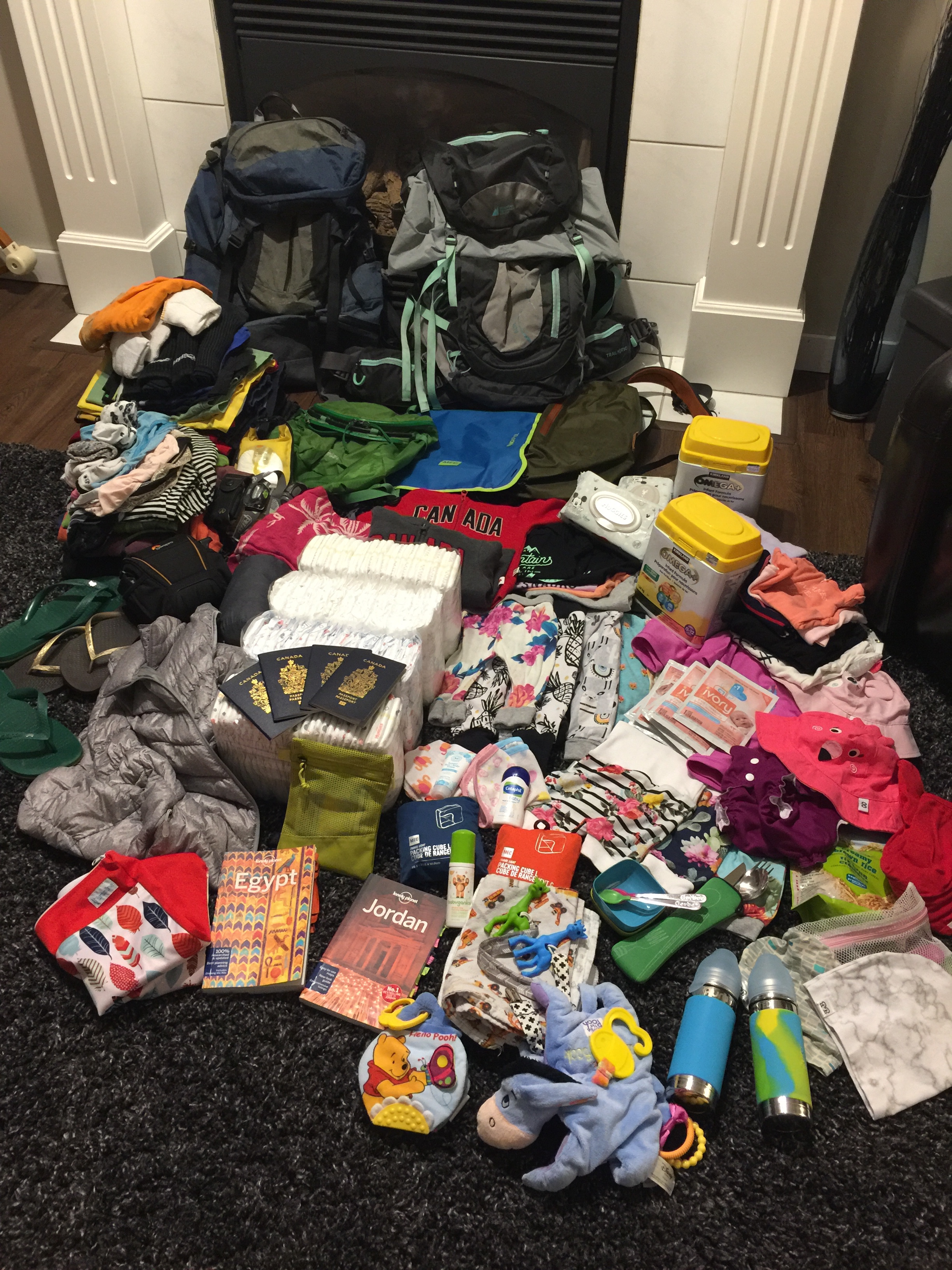 We are heading on our trip in just under a week and thought it was about time to work on our packing.  Trying to fit all 4 of us into two 70-L packs for our 2-month adventure will be our first challenge.  The girls’ clothes are small and pack down quite easily but the diapers and formula are what will take up most of the space.  We will probably need close to 40 diapers before even arriving in Cairo, and who wants to go shopping for those when we land when there are sites to be seen.