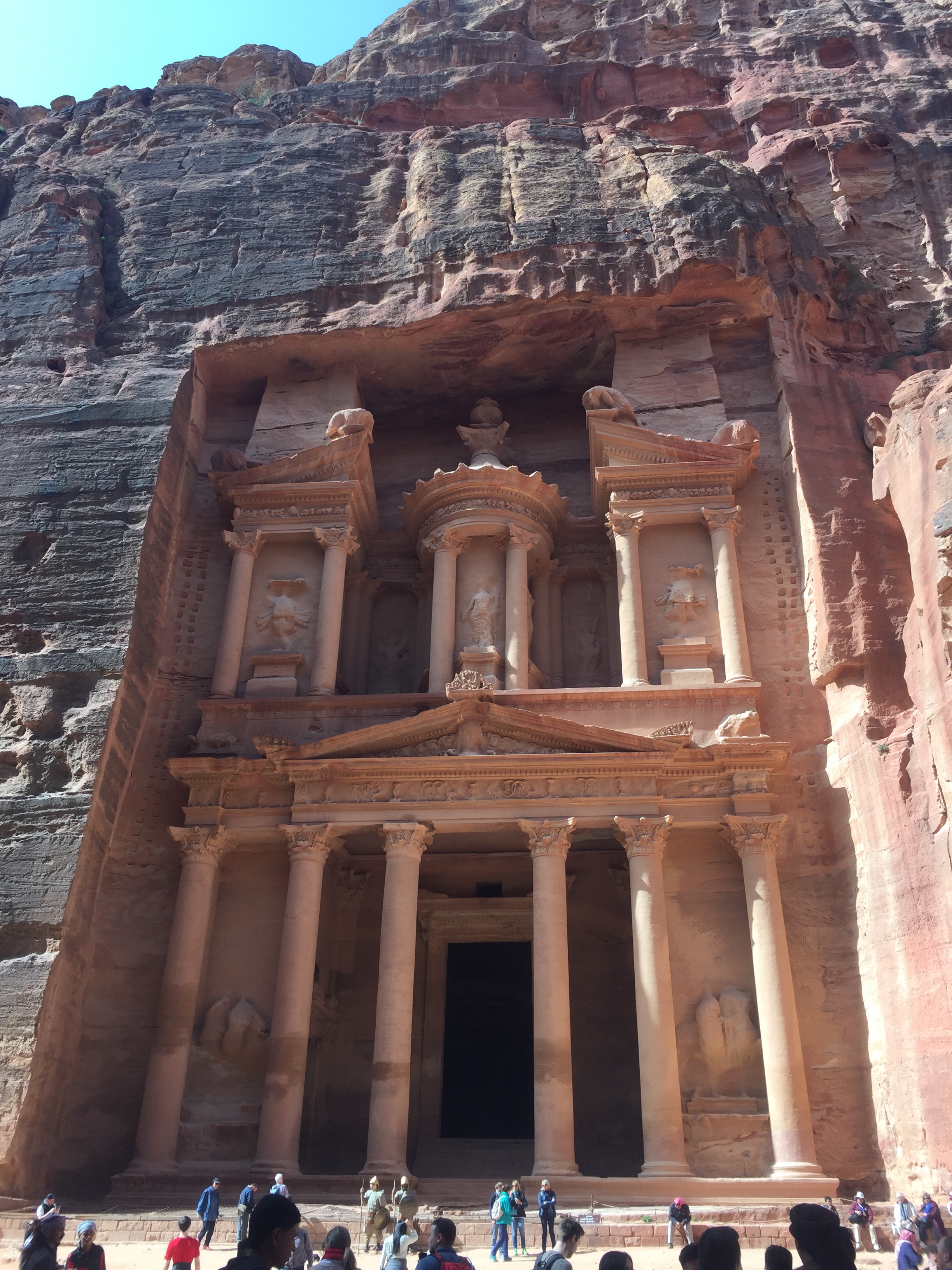 We arrived in the early afternoon after the 2.5 hour bus trip from Wadi Rum, 7 JD, got settled in our hotel which was nothing special but in a great location, had a quick feed then ventured to the gates of Petra. I was already so excited at this point, I could hardly wait to start the 1.2 km walk through the siq (canyon) with its colourful and narrow vertical walls. Around every corner I was waiting in anticipation for the view of the treasury. Indiana Jones flash backs had been running through Tyson’s mind for days. There were horse carriages flying by at a high rate of speed so you had to be careful as they didn’t give that much grace to the pedestrians. The siq walls eventually opened and we found ourselves standing face to face with this famous facade, the treasury, not to mention the hundreds of other tourists, guides, camels, donkeys, horses and vendors. We took it all in for 10 minutes then decided to explore further down the valley knowing fully we would cross paths a few more times with the ancient craftsmanship in the future.