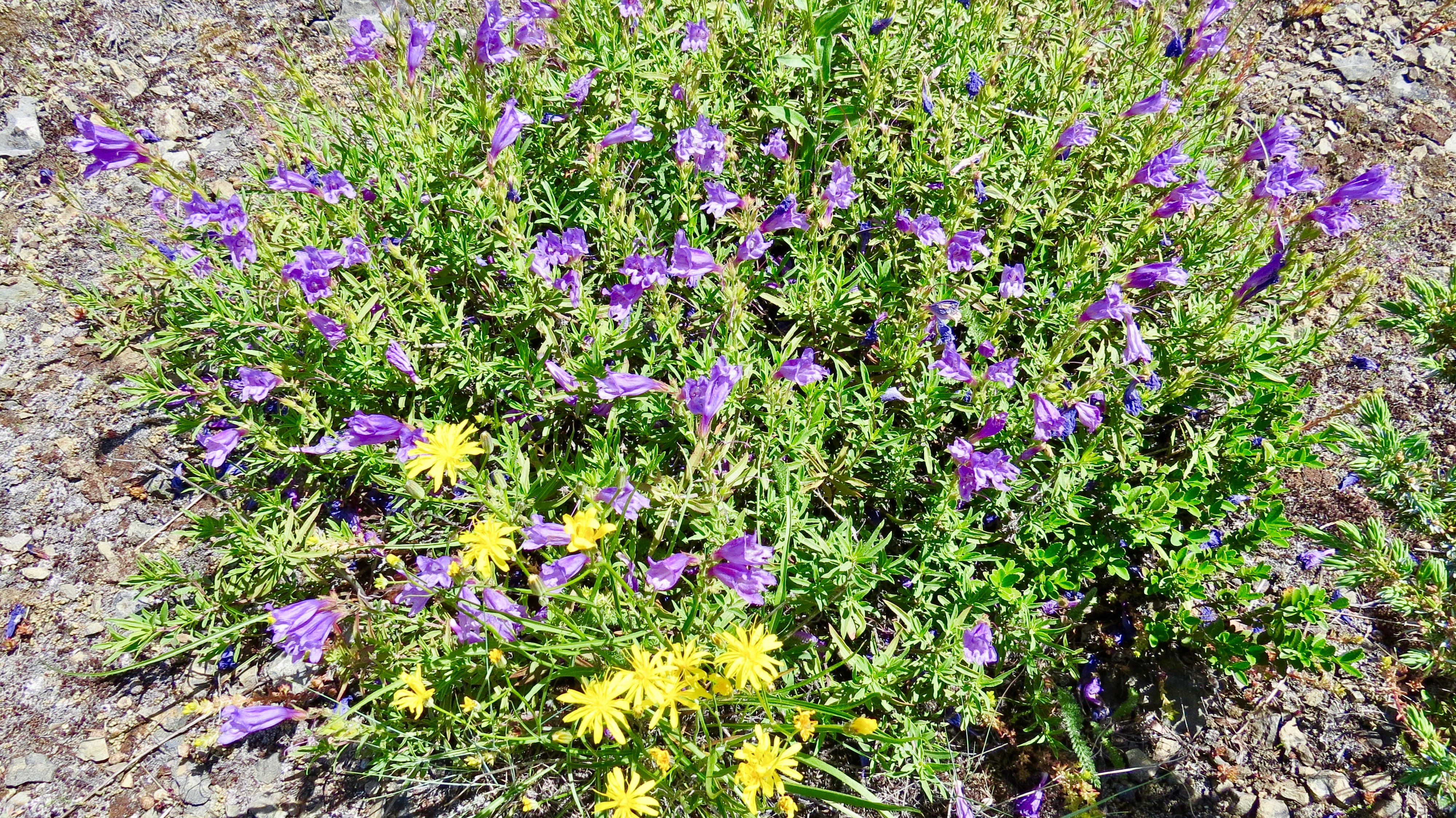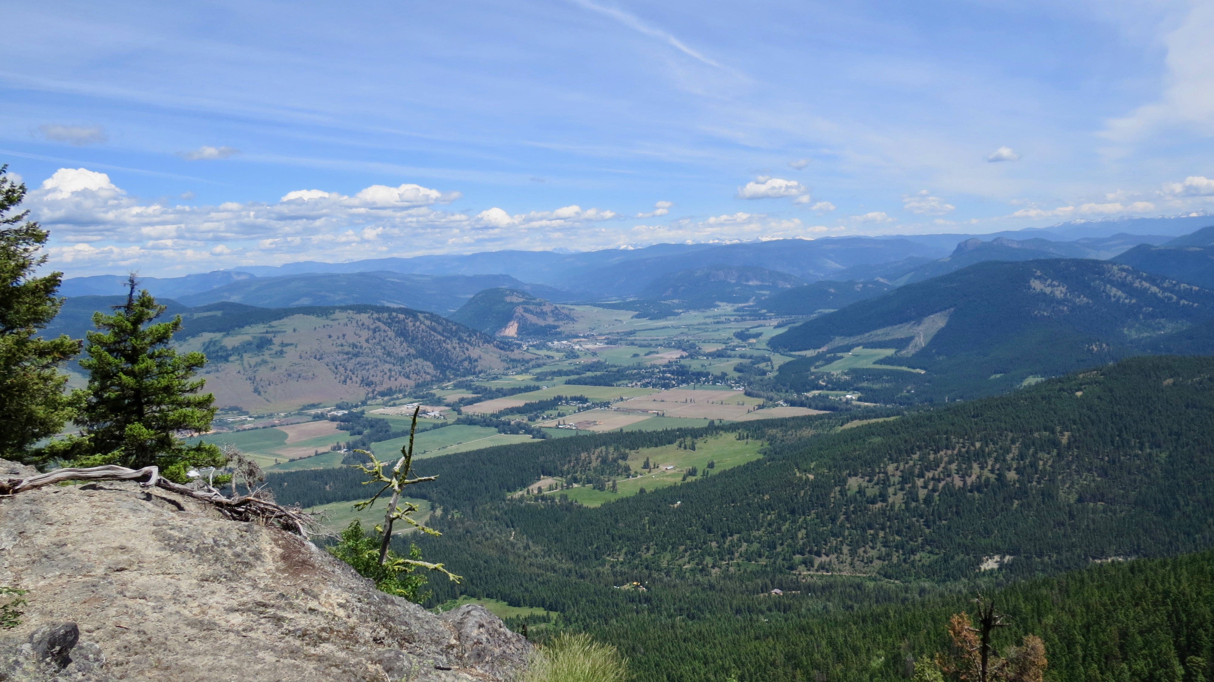 With the girls in the Onyas we hit the dirt. The hike starts fairly flat for the first 200m, then as volcanos go, climbs steeply via switchbacks. This continues that way until you reach the summit roughly 30 minutes later. You do however get the chance to stop and enjoy the wildflowers and use this as an excuse to take a breather. The footing on the trail is a bit unsure as the dry soil and steep nature results in some loose slippery sections. Once you have reached the pinnacle you can enjoy stunning views of the rural Coldstream valley to the west and the snow capped Monashee mountain range to the east. An old surveying pin can be found imbedded in the rock at the highest point on this peak.