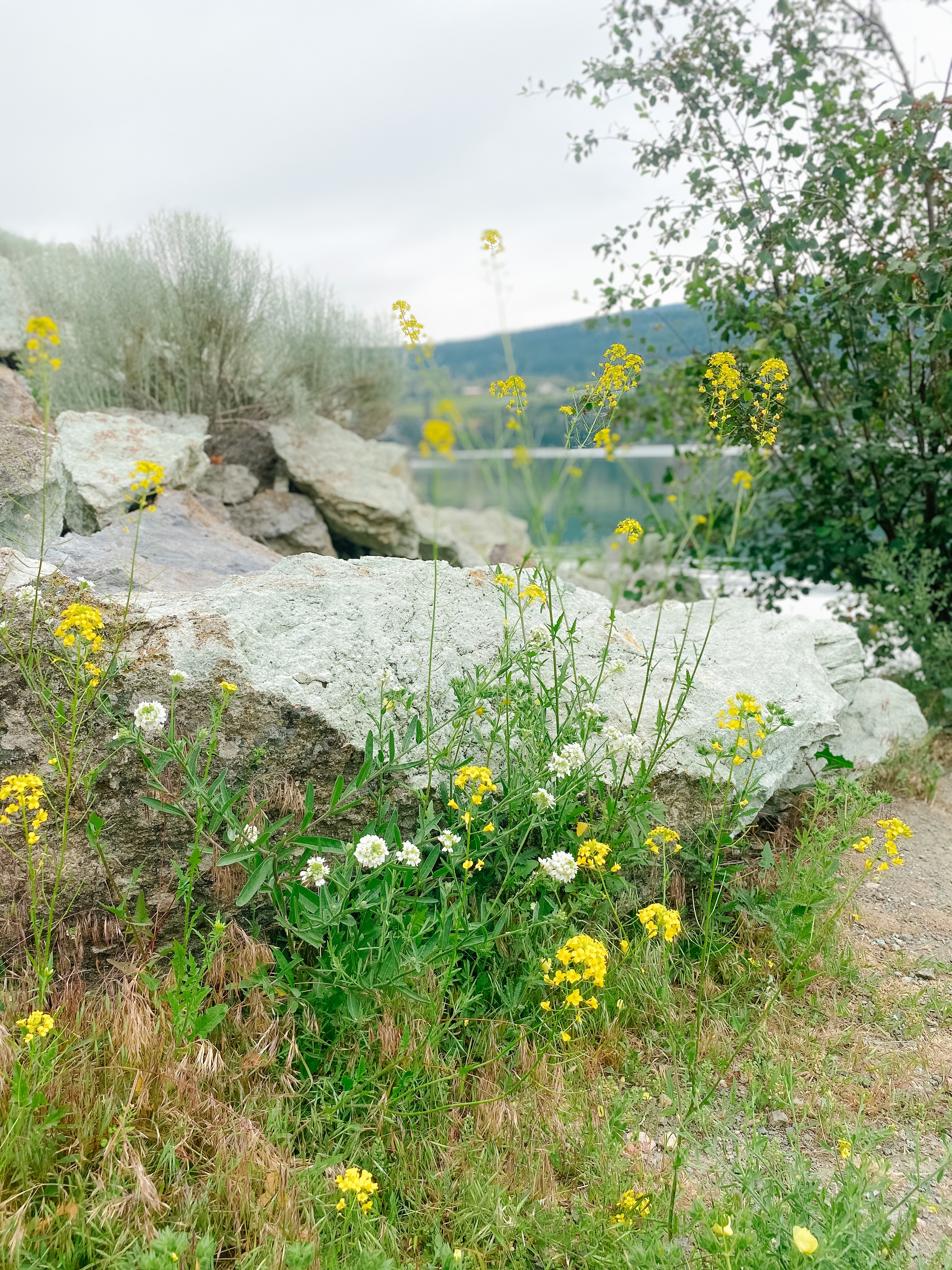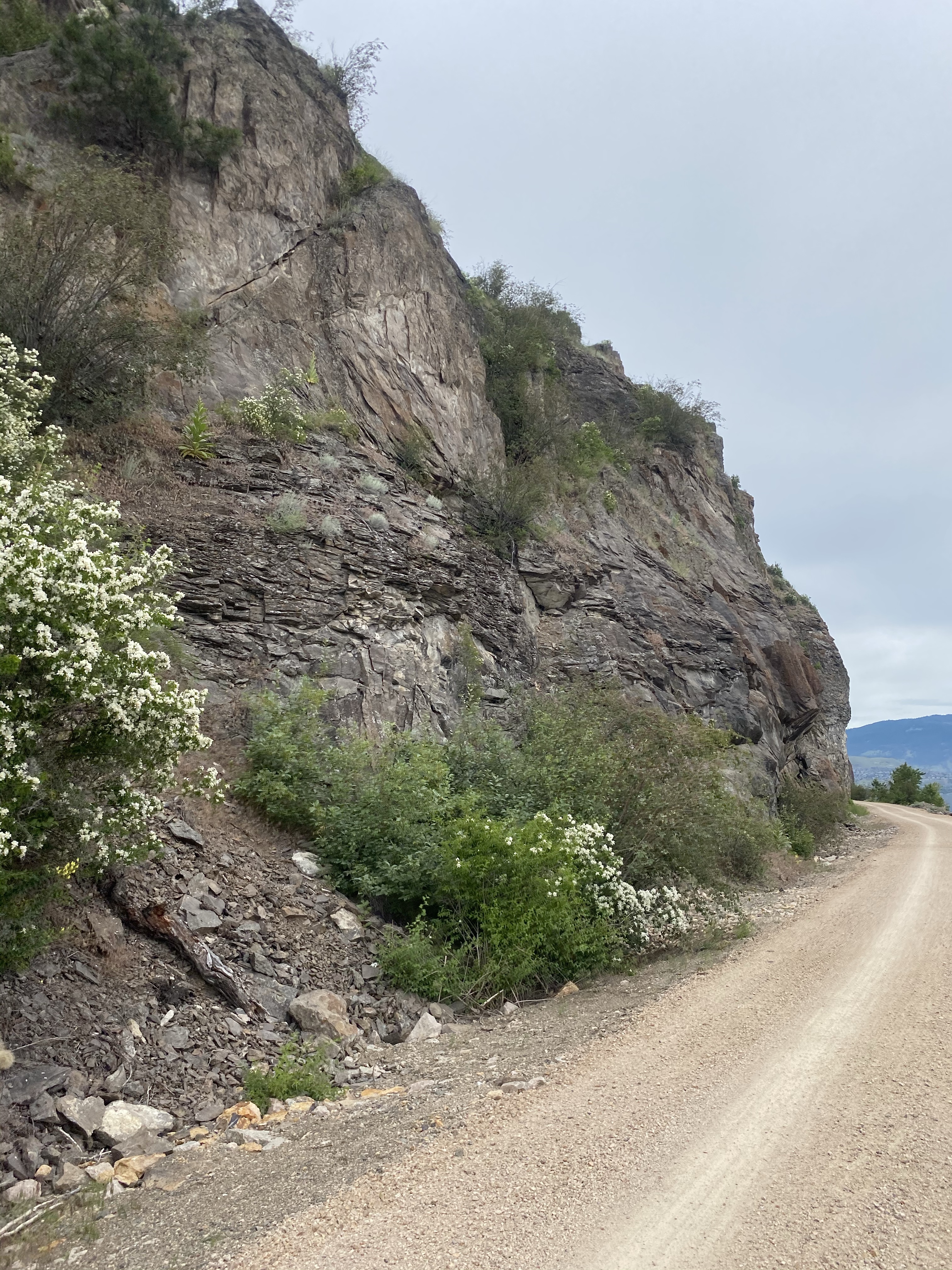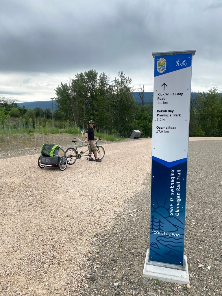 We attached the trailer to our tandem bike and started at Km 0 in Coldstream heading south around 8:45am. With snacks and water in check we were set for a morning of fresh air and exercise. The first 2 kms have limited views due to the trail proximity and residential houses. Once you get past this point the crush rock path is only meters away from the beautiful shore line and the views vary from cyan water to steep rock face outcrops, grassy fields and the distant snow capped Monashee Mountains.