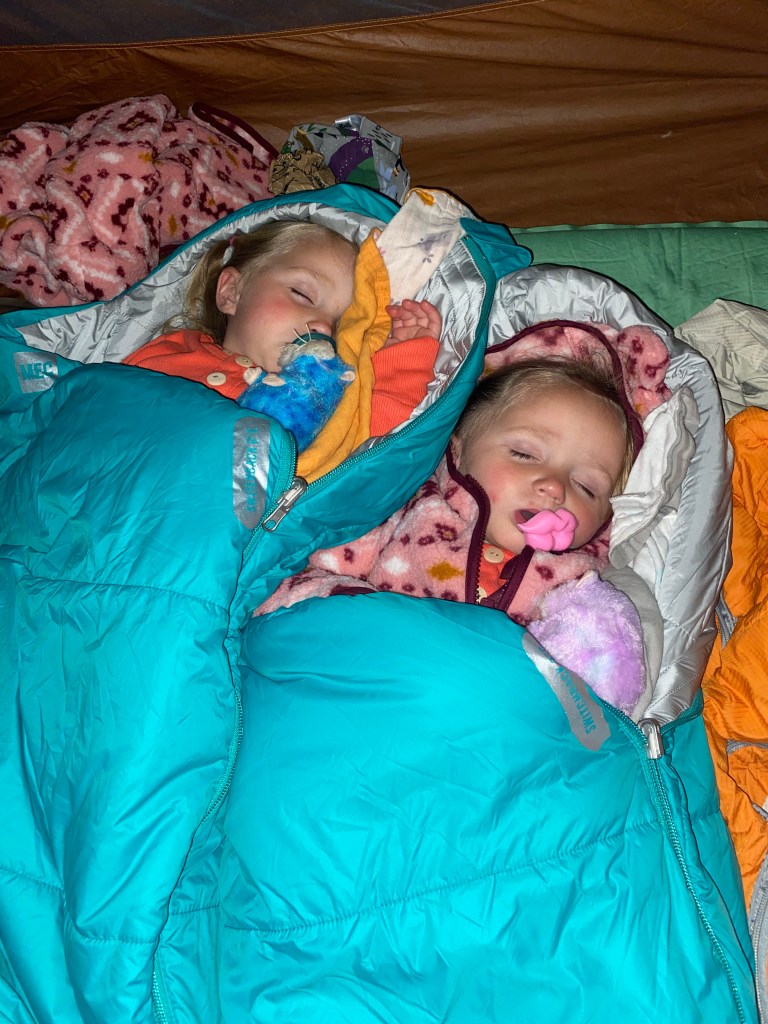 The girls spend hours just circling the group site climbing over logs, digging in the muck and unsuccessfully chasing chipmunks. They had a few spills, shed some tears but come dinner time they were all smiles while eating our home made, previously dehydrated chicken chilli. Around 7 we cleaned them up as best we could and attempted to settle them into the tent and their mini sleeping bags for the night. They were extremely excited about staying over and took a bit of coaxing to get them to fall asleep.