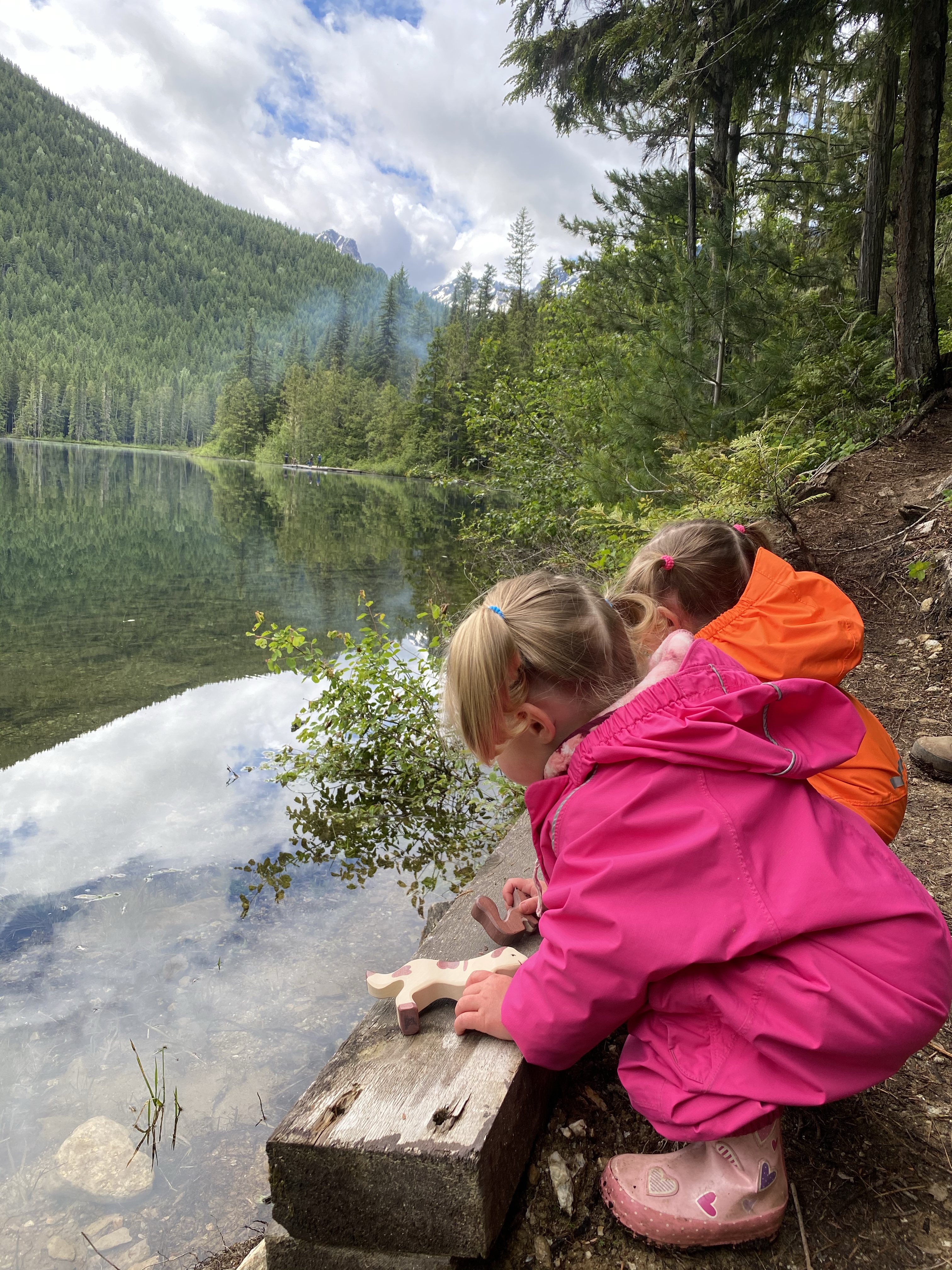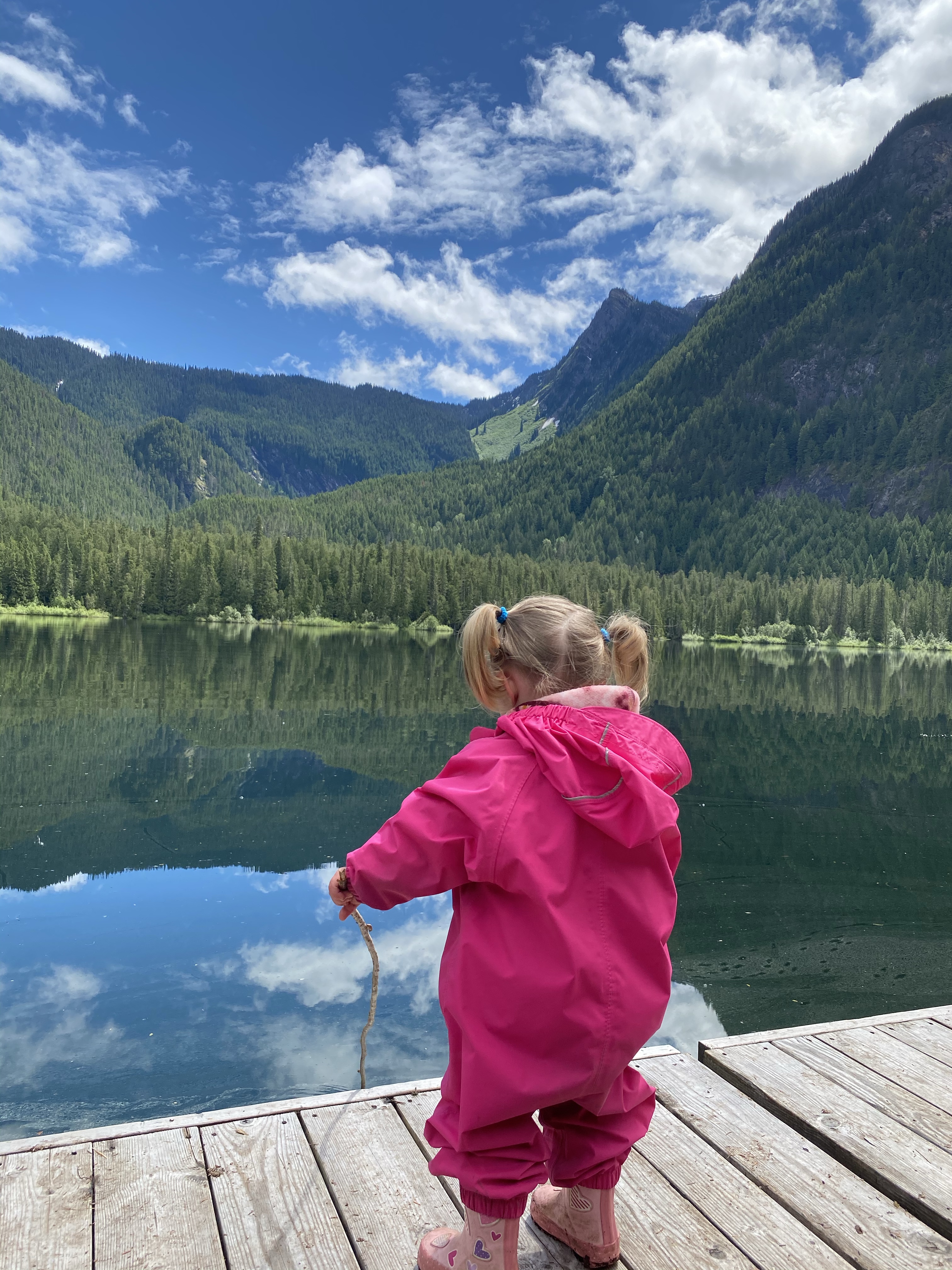 The following morning the little ladies were back in their suits and continuing where they had left off from the day previous. Many of the hikers were now packing up and heading back to their vehicles at this point so the free space was starting to expand. The skies were mostly cloud covered but no rain and we even enjoyed moments when we could feel some of the heat from the sun burning through. Bexley and Lidija made the very slow and often distracted walk back to the main camping area to venture out onto the dock to watch others fishing. Sitting down and relaxing as best as we could while keeping a tight leash on the girls. They didn’t understand the ramifications of falling into a mountain lake and not knowing how to swim, and we were not keen on letting them learn a life lesson today.