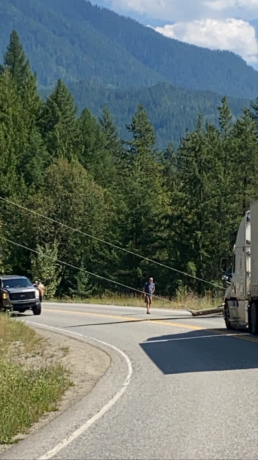 After a hour or so of catching up with Bill we decided to push on east towards New Denver. We made it all of 10kms before we came across a truck with travel trailer on its side and in the ditch. There was no emergency vehicle on the scene yet but a handful of passerbyers had stopped to help where they could. We continued on. 3kms outside of New Denver us and the two vehicles infront come to a grinding halt. I could see from the drivers seat that there seemed to be a power line only a meter or so above the road surface. A car from the other direction crossed the lane on the corner, plowed through the pole and came to rest tendering on the bank on the hill with the power pole on its roof.