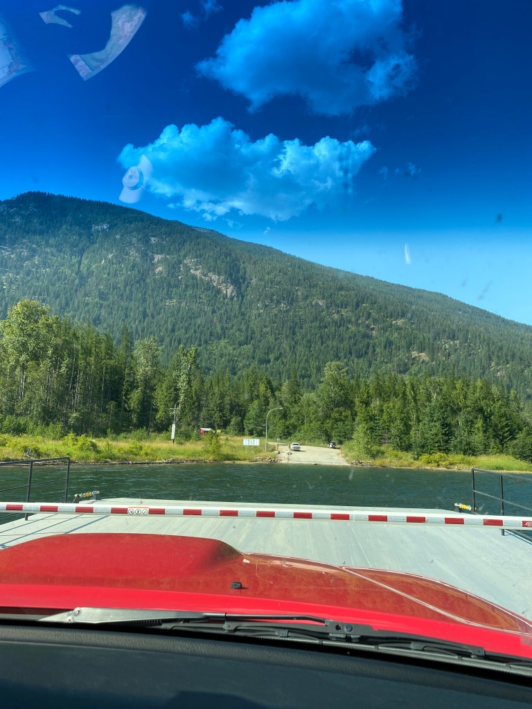 Soon on the scene were the emergency vehicles. After 45 mins of lingering around in the 37 degree heat the local authorities communicated that it will be at least 3 hours before the road was open again. Huh, now what should we do. We turned around and headed back to Nakusp. By now Carla was off work and we met up with them for a visit. They live slightly out of town so this entitled another ferry different from the first.