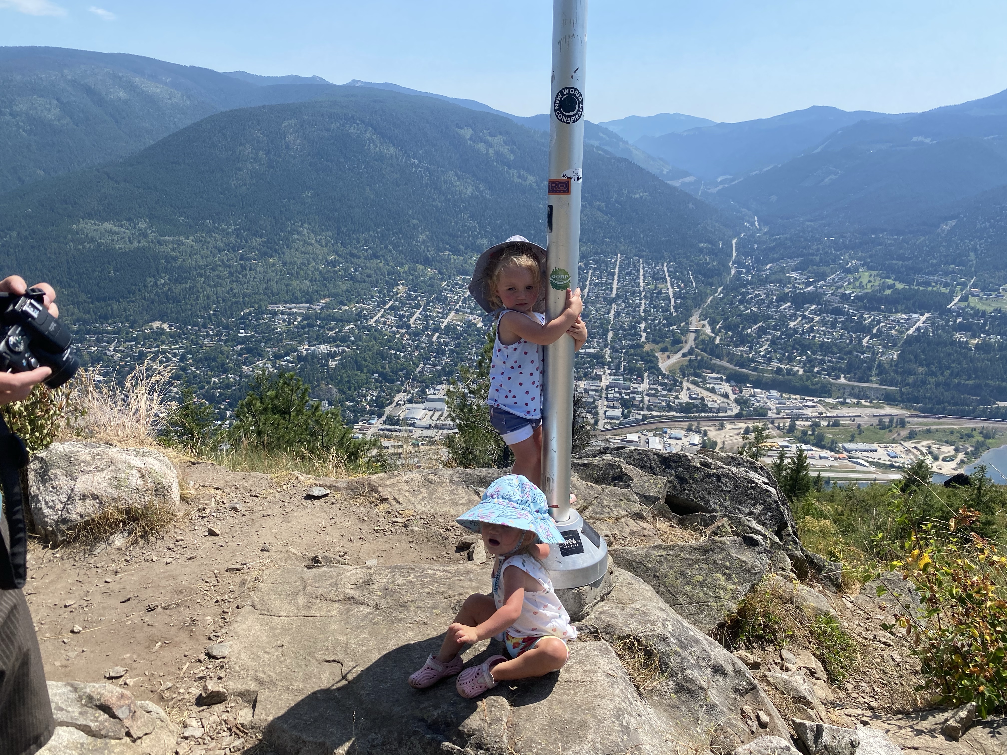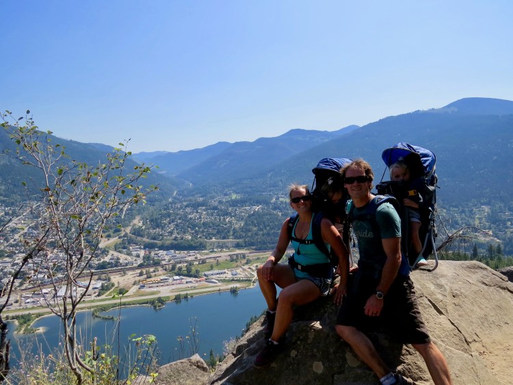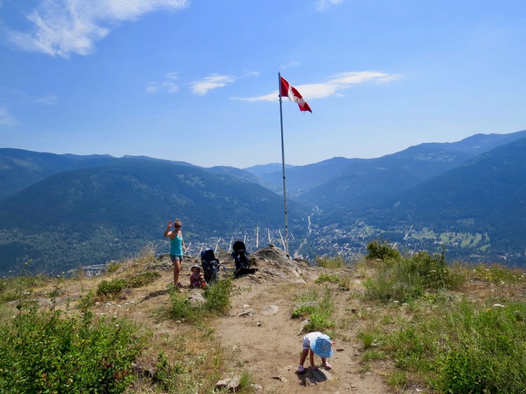 Around 8am we are woken to Bretnay having a breakfast of pancakes, scrambled eggs, bacon and fresh fruit waiting for us. By 10:00 were now out the door with intentions of hiking up to one of Nelson’s notorious hiking lookout spots, Pulpit Rock. Pulpit is not a very long hike but a steep one indeed, 1.8kms with a 400m elevation gain to the rock lookout. From here you also have another option to hike up to the flag pole which is apparently a parasailing take off point. This continuation is another 0.9kms on the black diamond route or 1.1kms on the blue square, depending on your trail selection. Either way you have to gain another 260m of elevation. That totals 660m of elevation change in just under 3kms. Once we got to the rock we made a quick decision to push on to the flag pole and as we don’t always like back tracking so we decided to go up the difficult route and down the easier route. This was indeed the best choice for us, especially with having the girls on our backs. Carrying the extra 30lbs or so was just adding to the challenging decision and there were a few sections near the top where we had to use our hand to help climb some small rock bluffs. By the time we crested the last bluff and saw sight to the Canadian flag flying in the wind we were both exhausted. It was now nearly 2:00, it was the hottest day of the summer so far and our food and water stores were near empty. We let the girls run around, rested our legs then loaded back up to head to the truck. The descend took about half as long as the ascend and the truck thermostat read 41 degrees C. We were wiped. The girls on the other hand, barely broke a sweat, never stopped talking on repeat and Lidija even managed to catch a little shut eye on the way down.