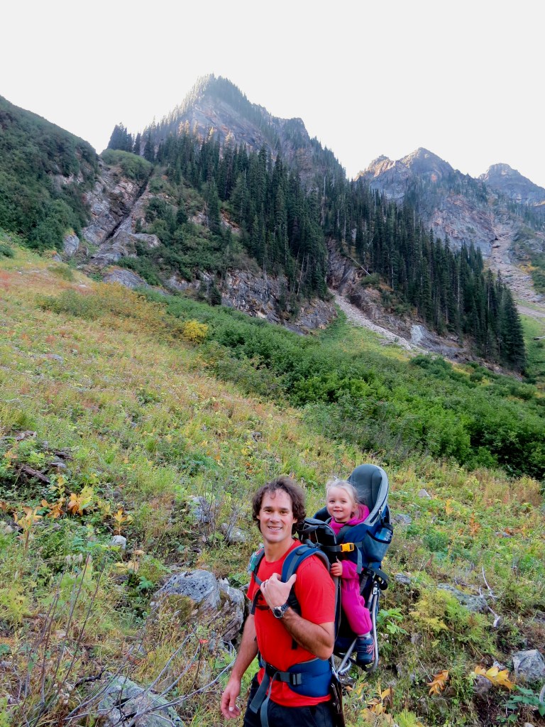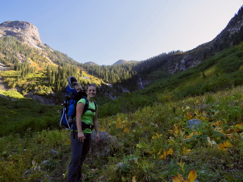 It was 6 degrees out to start, but with clear skies we knew we were going to be in for a beauty of a day. We let the girls walk the first 20 minutes or so before the ground got a bit to technical for their little legs and dramatically slowed down he pace. With them in the Deuter carriers we were now trucking along at our usual pace. The first 2 kms or so had us wandering through some old growth cedar forests with its massive heights and minimal undergrowth. Then proceeding out into the sunlight as we were introduced into a large slide area with low vegetation. We could see the remanence of the summer seasons stinging nettle, but luckily being October they had all wilted up so it was free and easy to proceed though the area. Mother natures canvas was really starting to be on display by this point. A 250m elevation gain from the parking lot and another 1 km we reached the bottom of the waterfall.