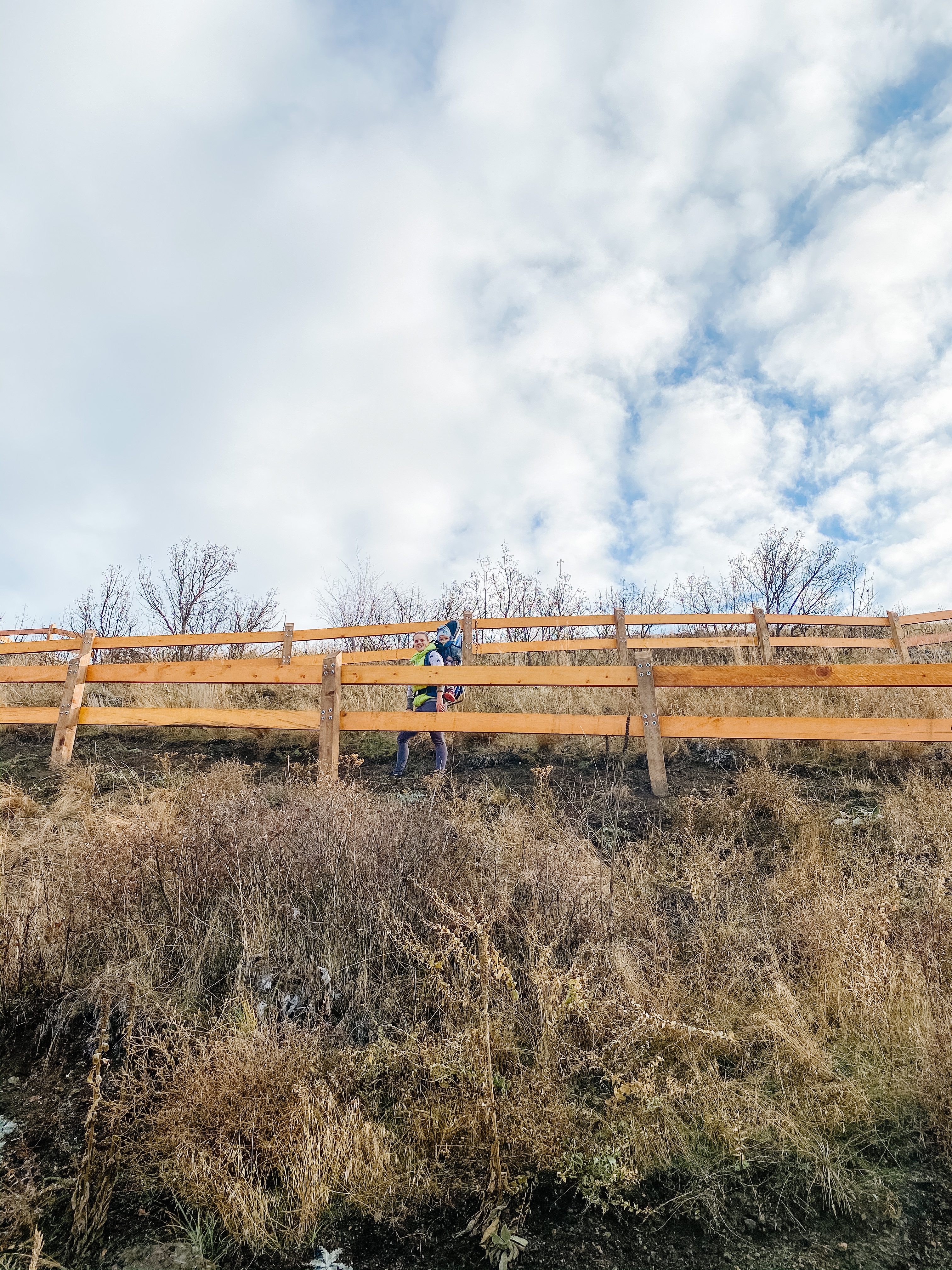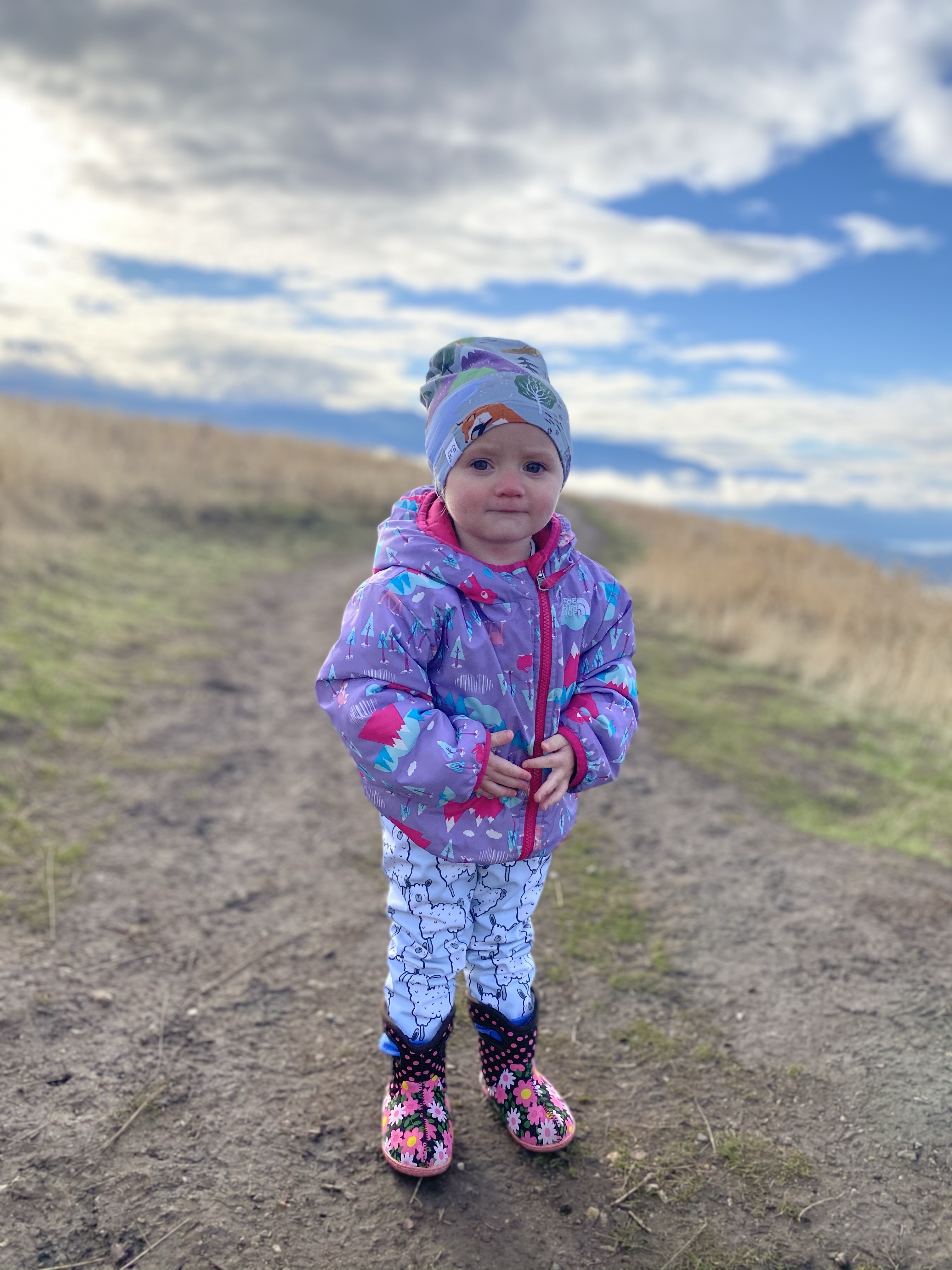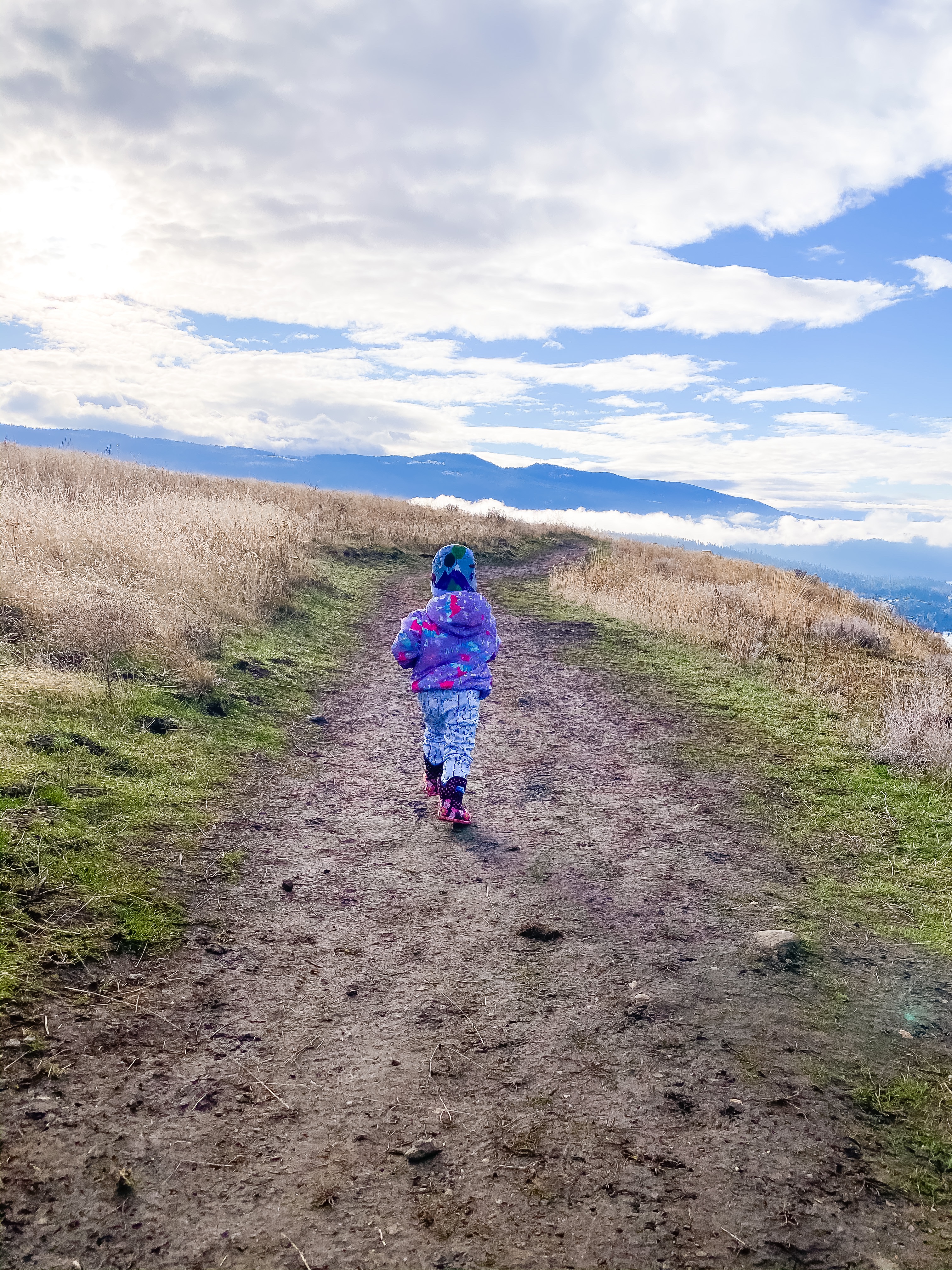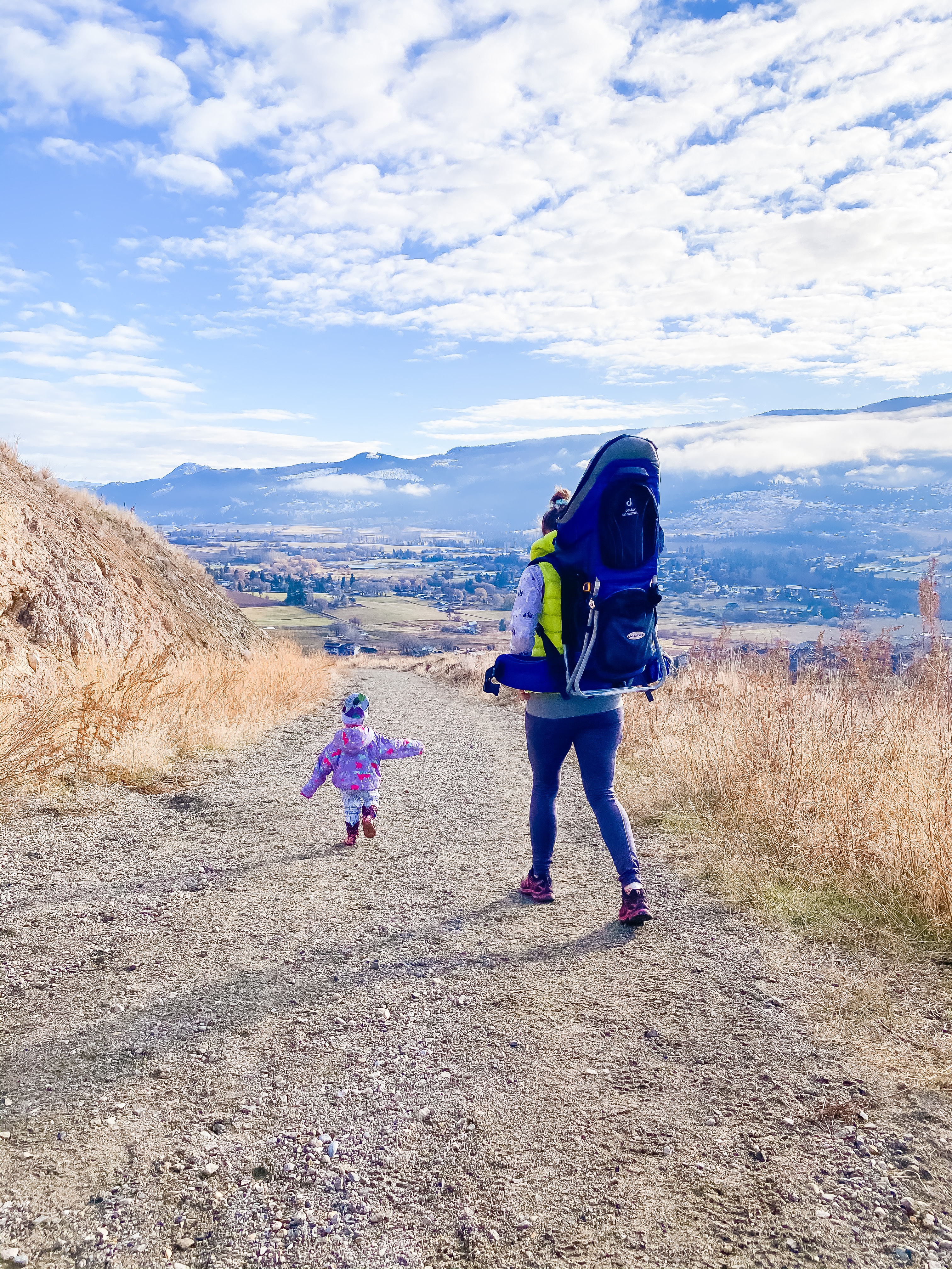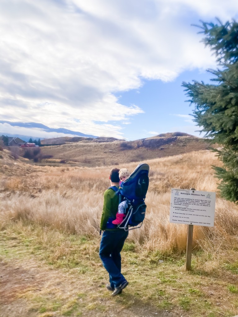 Walking south now on Bluebird trail you change perspective as you start to overlook the Coldstream Valley and Kalamalka Provincial Park on the opposite side. The trail now winds up, down and around leaving you with astounding views of the Lavington valley and the snow capped Monashee Mountains further east. There are various trails throughout the area, everything is very well signed and nothing is really long enough to have you lost or exhausted. We took a steep descent from the plateau and popped back out among the houses on Mt. Tanner Pl. The littles ladies did very well on their own but by now wanted back in the packs to rest their mini legs. This ended up being very short lived as we soon passed a play ground and they couldn’t get out of the bags fast enough. A further 15 minute walk had us back on our door step where it all began.