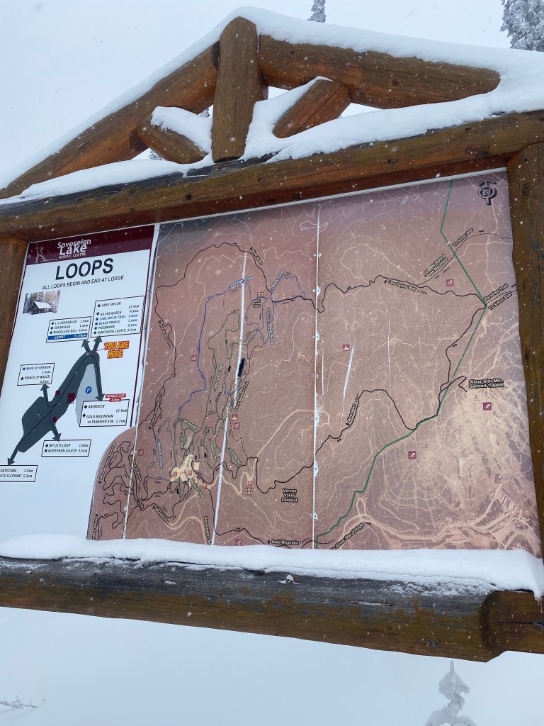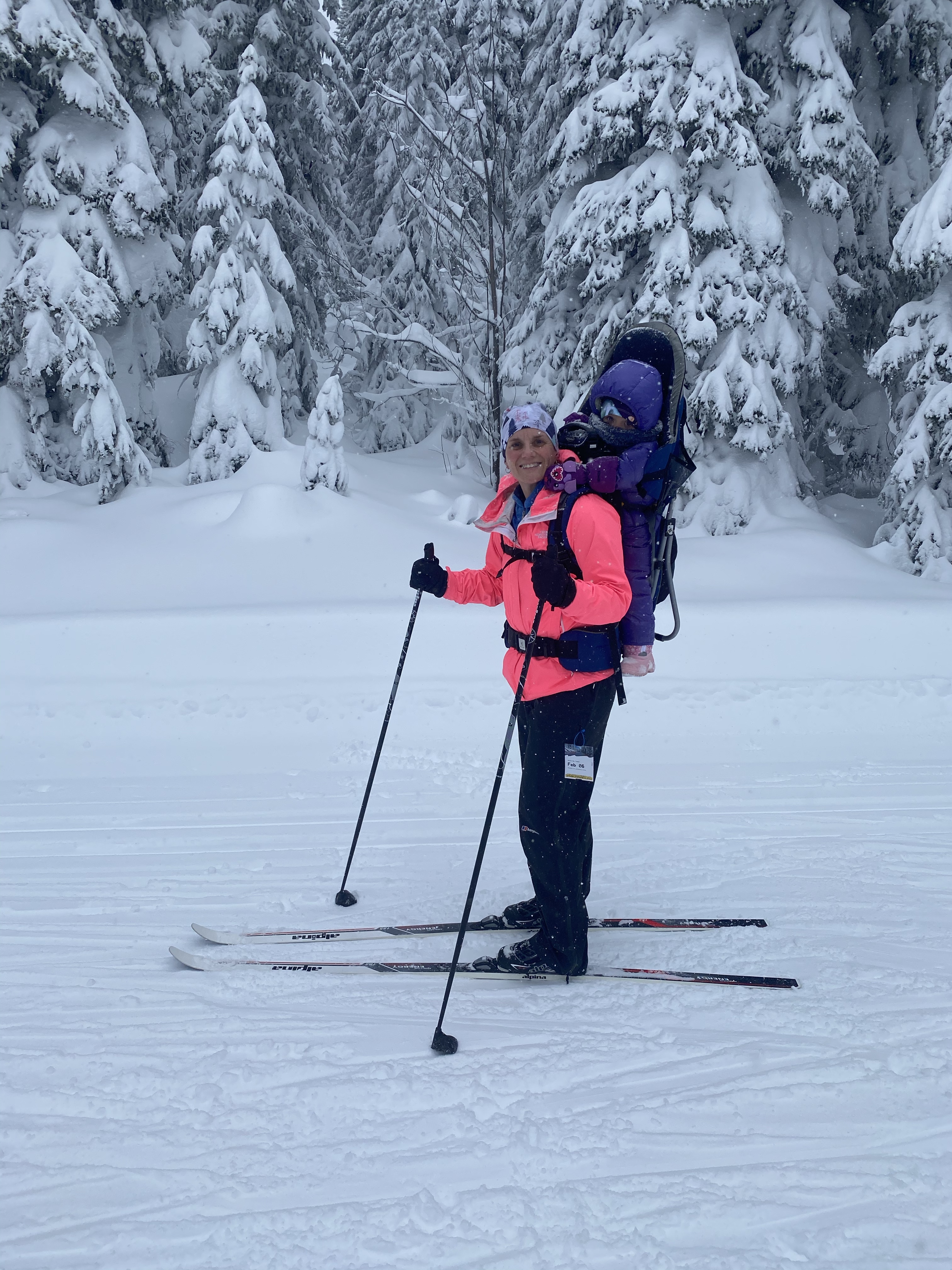 The forecast predicted a cold spell heading our direction over the next few days so we chose to get out now. The weather was mild, -5°C, so we drove the 25kms up to Sovereign Lake Nordic Centre to get the family out for some fresh air. It was now snowing when we arrived. Covid protocols were in place so we pre-paid for our day passes online then activated them at the outside counter upon arrival. Once the girls were all bundled up and loaded into the Dueter packs we clicked into our skis and headed onto the freshly groomed trails.