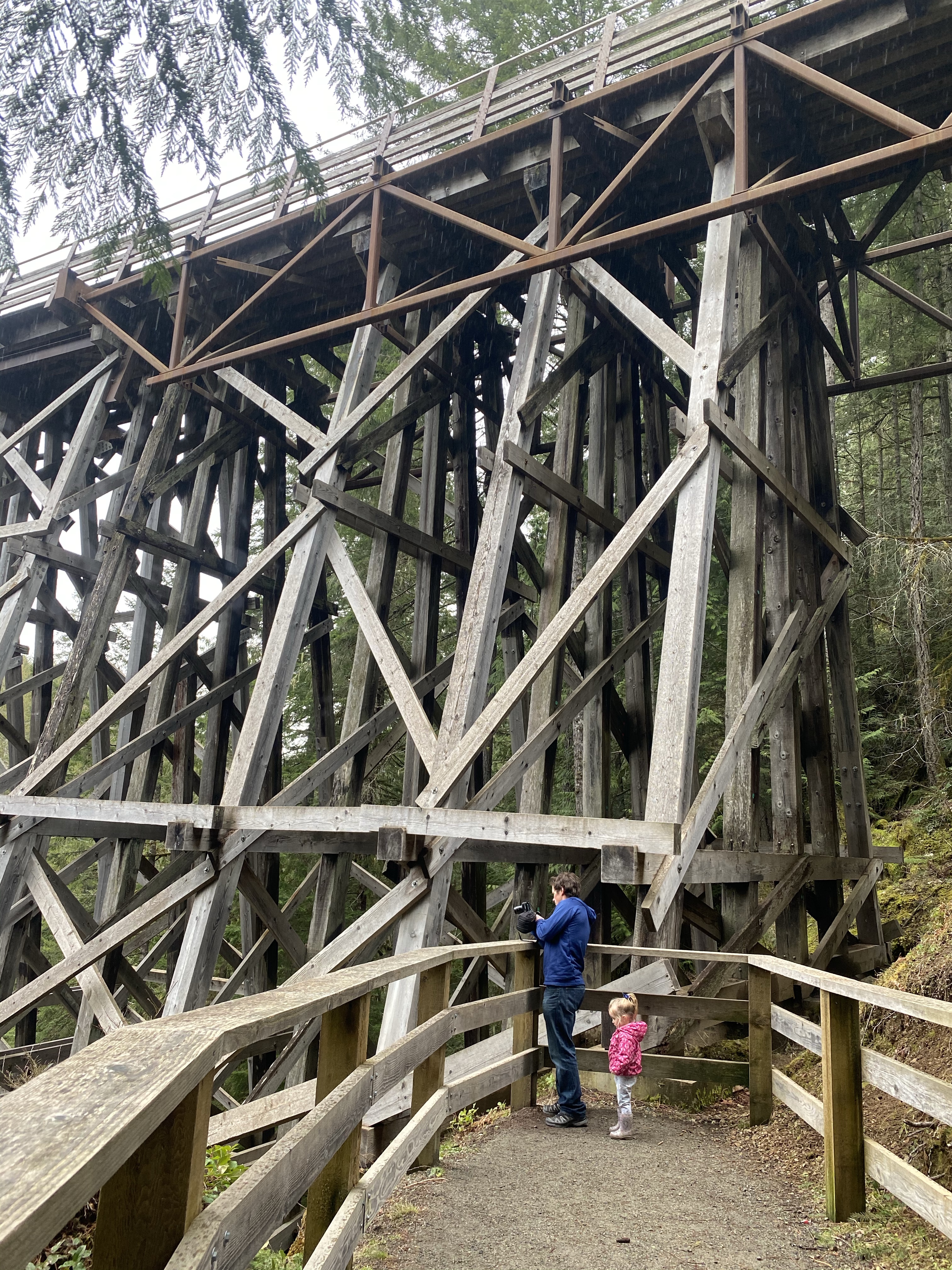 After a short 15 minute walk from the main parking lot our views opened up as we reached the trestle. Full handrails and equipped with extruding viewpoints make for excellent opportunities to see the masterpiece from all different angles. The rain started to fall for us at this point and as our luck had it, the CVTD had a crew on the trestle doing some cleaning and pressure washing. There are trails on either side that can take you to the underside of the supports and north side of the bridge has a path that descends all the way down to the river below where a picnic table awaits.