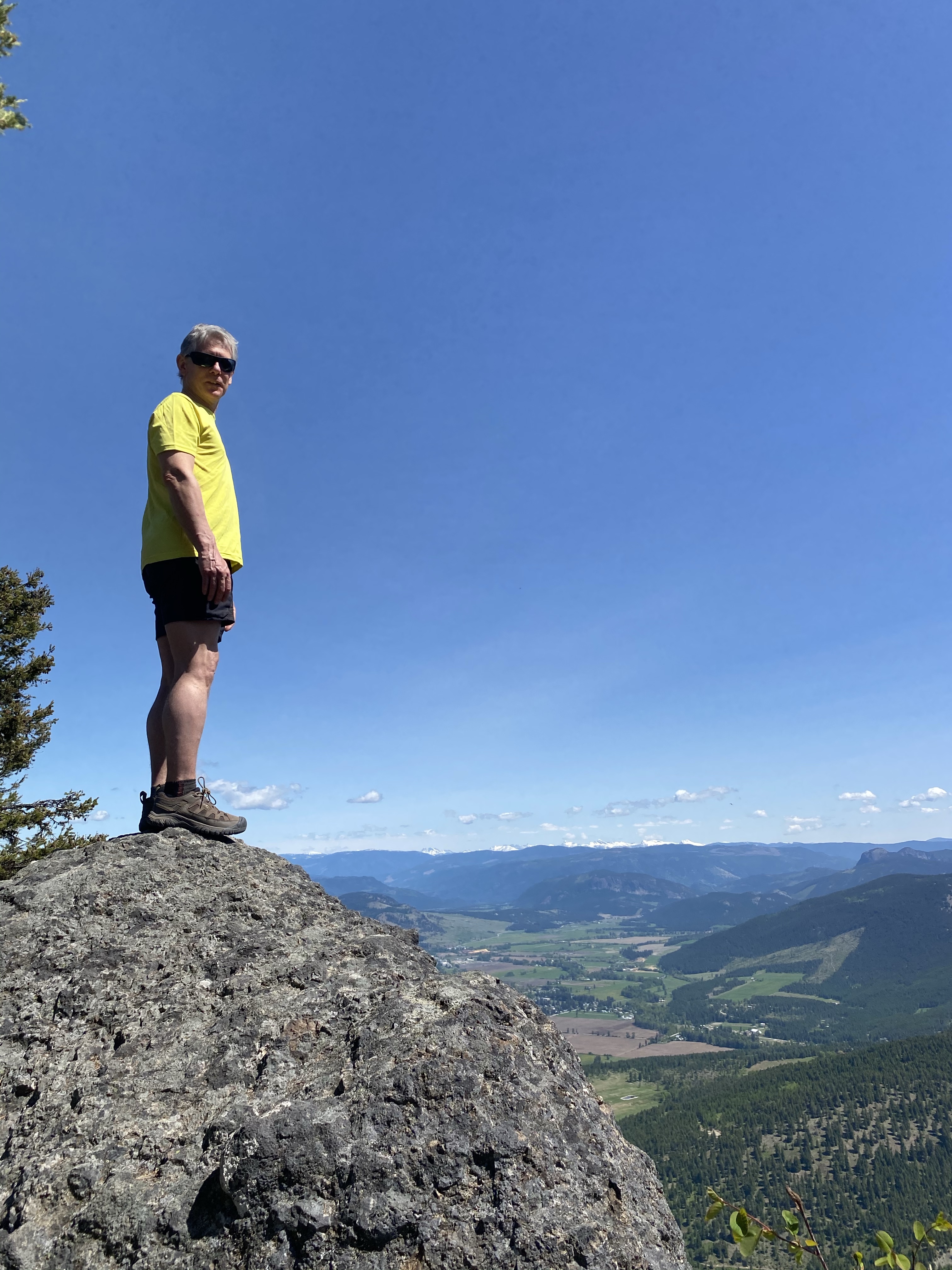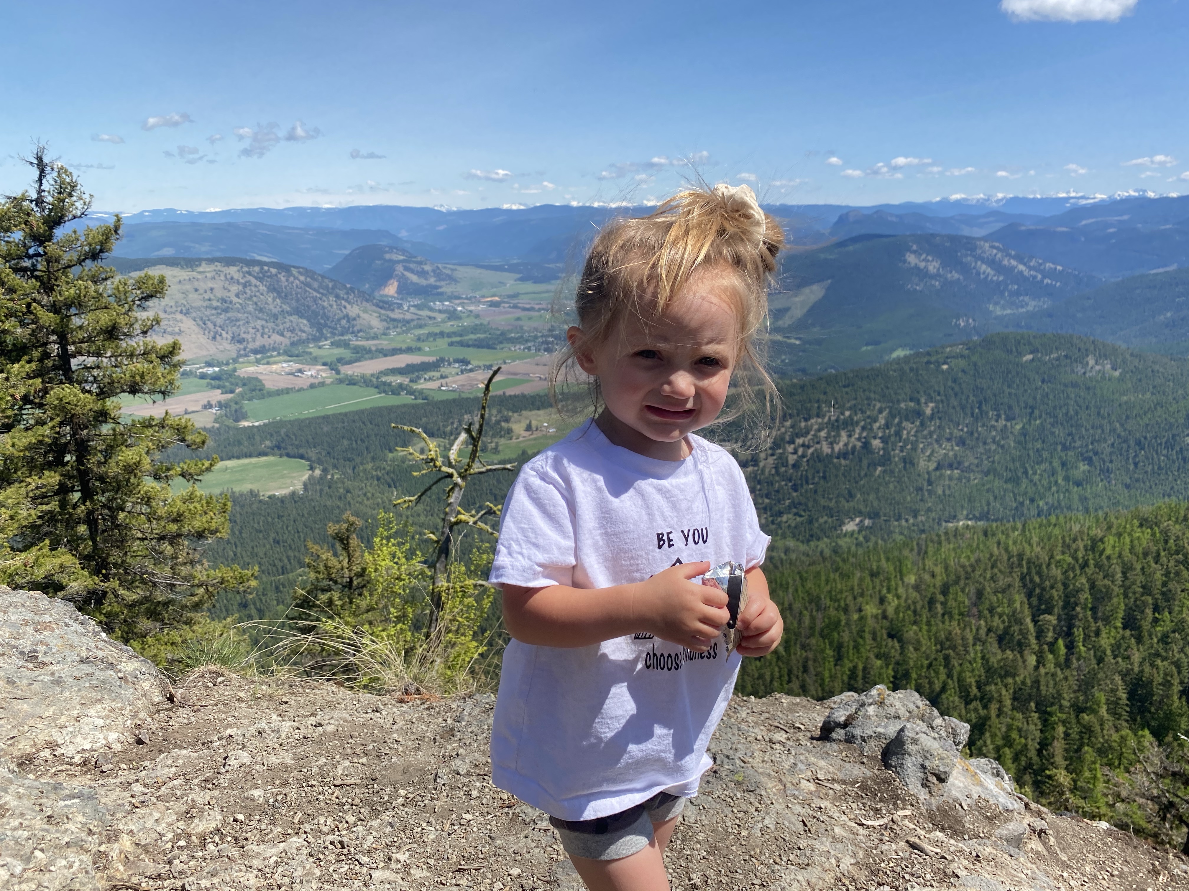 The second summit, like stated on the previous write up, is located on private land so is best avoided. A short descent then a mid way false summit has the trail turning back on itself again until the trees open up and the amazing snow capped Monashee Mountains come into view. The trail was getting a bit to steep for the traction on Lidija’s little feet so eventually after 250m of elevation gain and over 3kms of hiking her frustration was setting in and she started to hitch a ride.