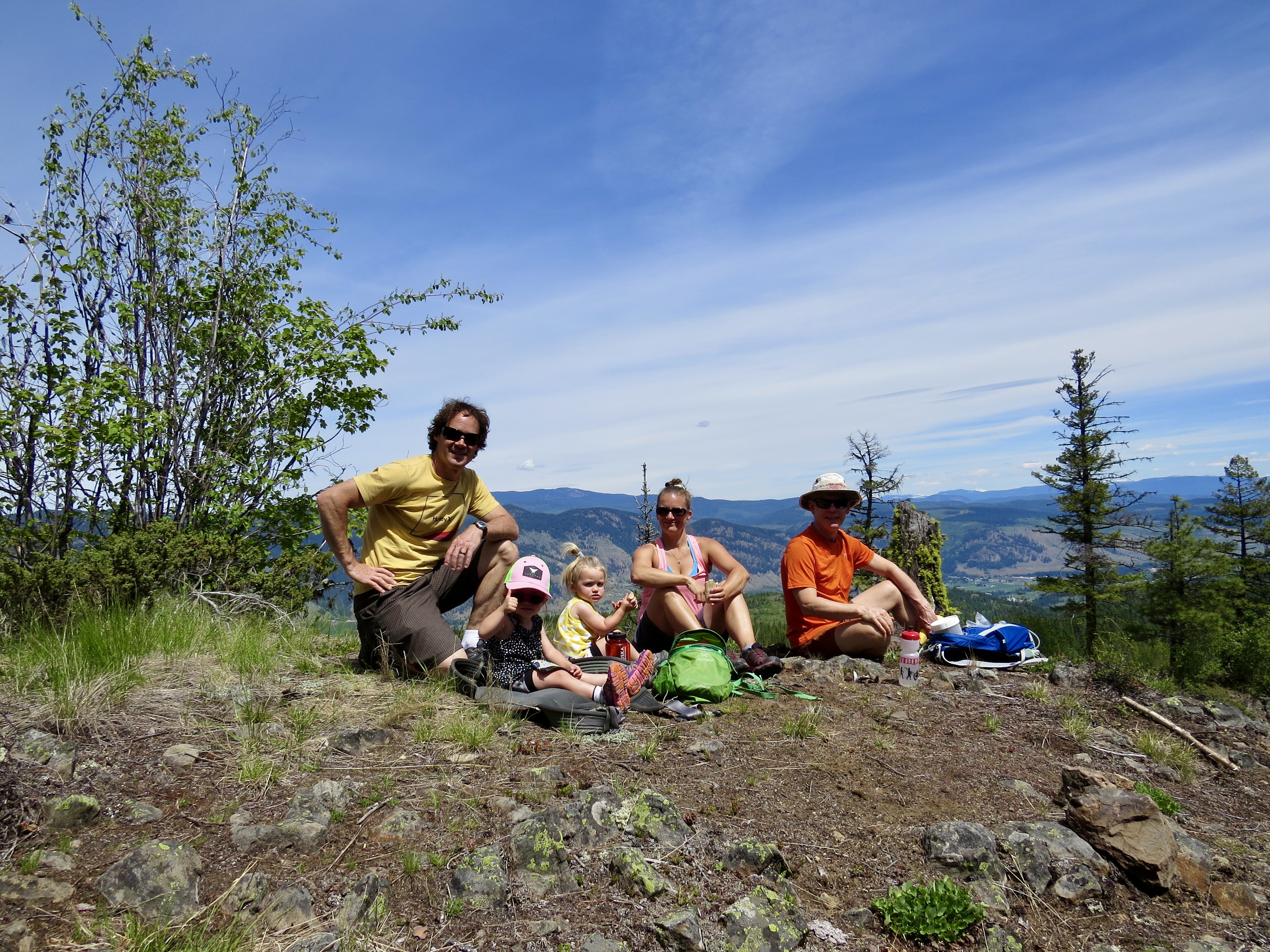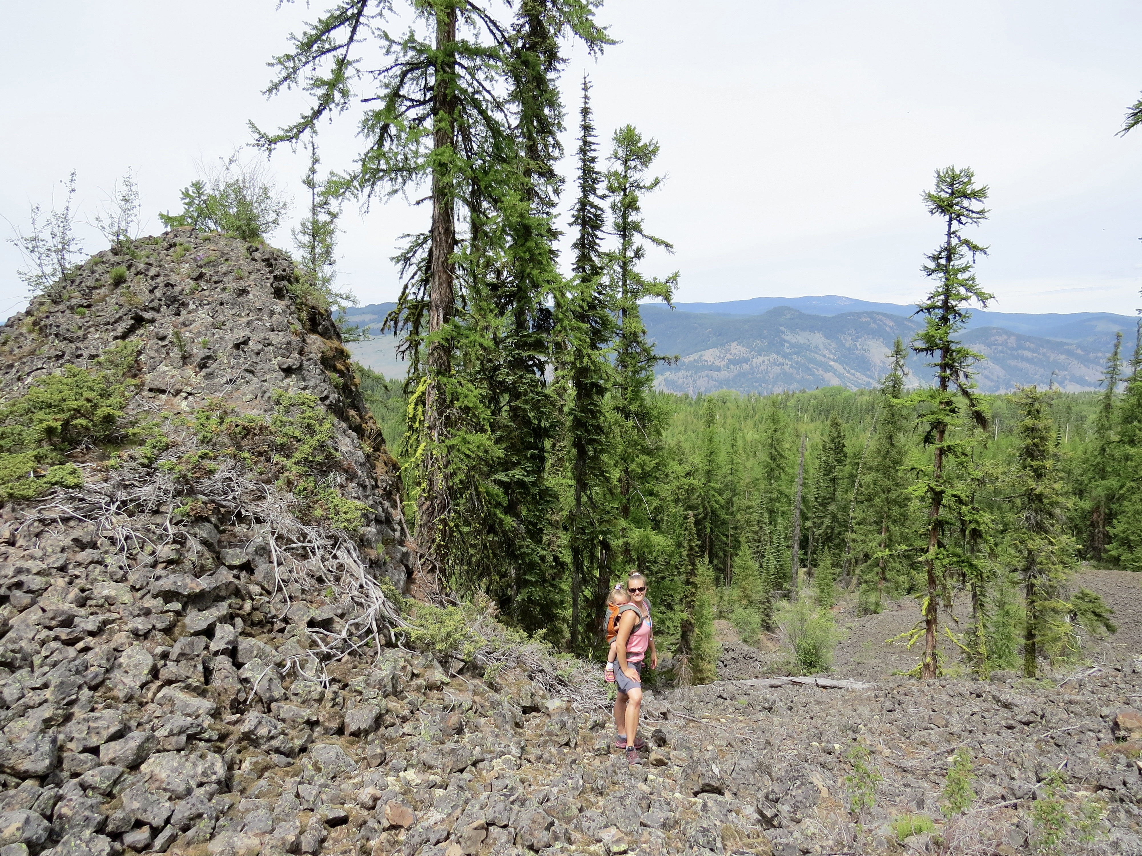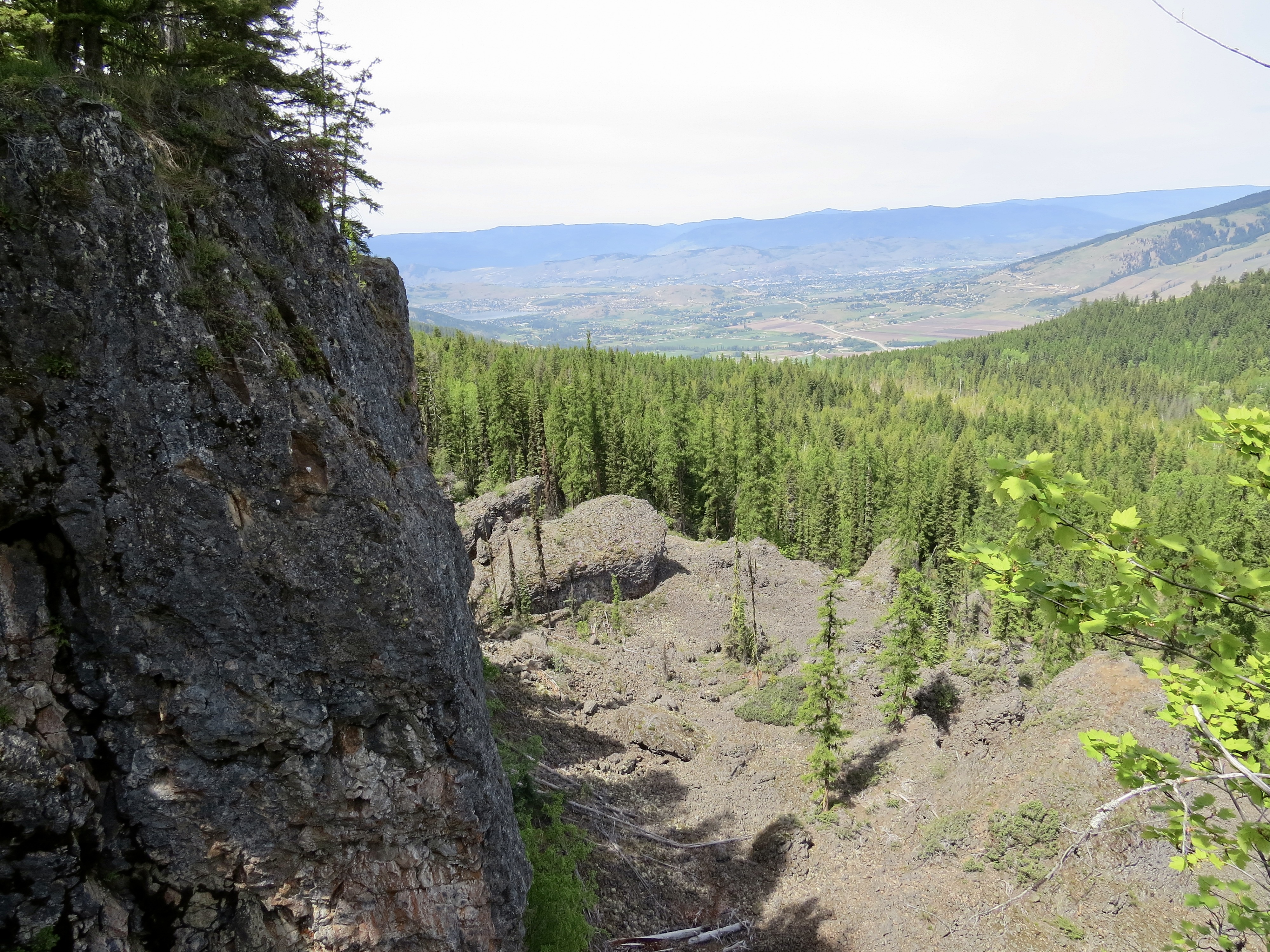 As spring pushes into summer we always try our best to get out for the low lying hikes before the weather gets too hot. We decided again to hit the trails with our neighbour Bruce. He is always a good sport and puts up with our crazy antics and our two littles bounding around. This time around we chose to venture out to the Rimrocks just east of Vernon and up the King Edward Forest Service Road (FSR). To most Vernon residents this is where you go when you want to burn pallets and old couches at bush parties, or blaze around on your dirt bikes and side-by-sides through the bush. But to us, this is a great family outing with a short hike to some remarkable geological features of ancient lava formations.