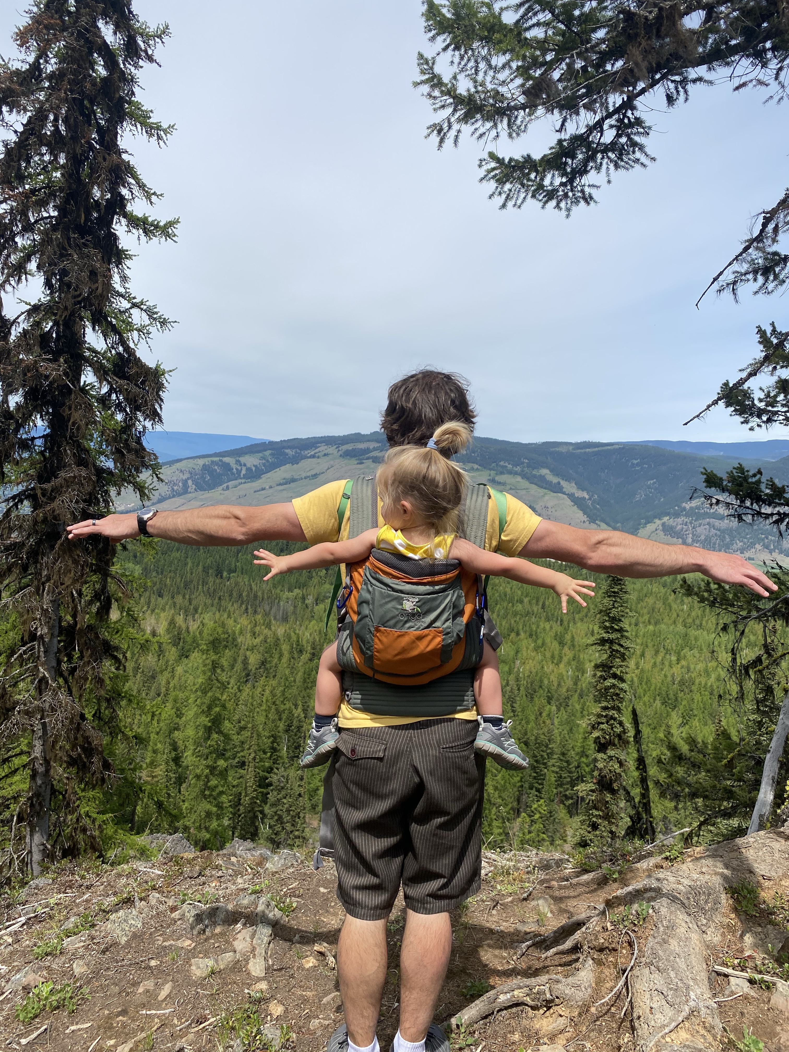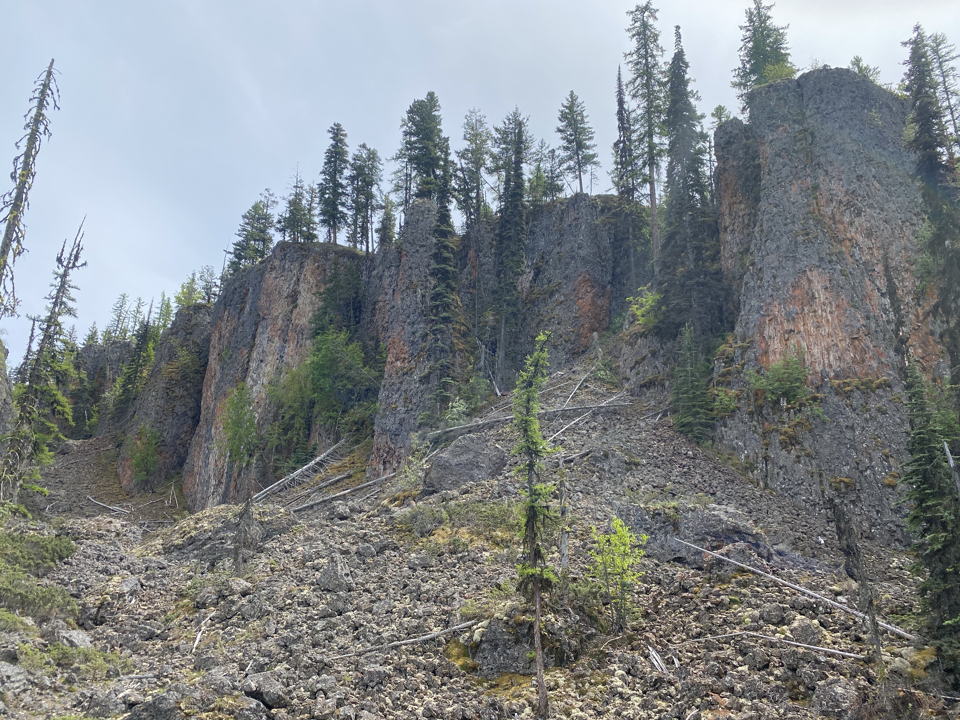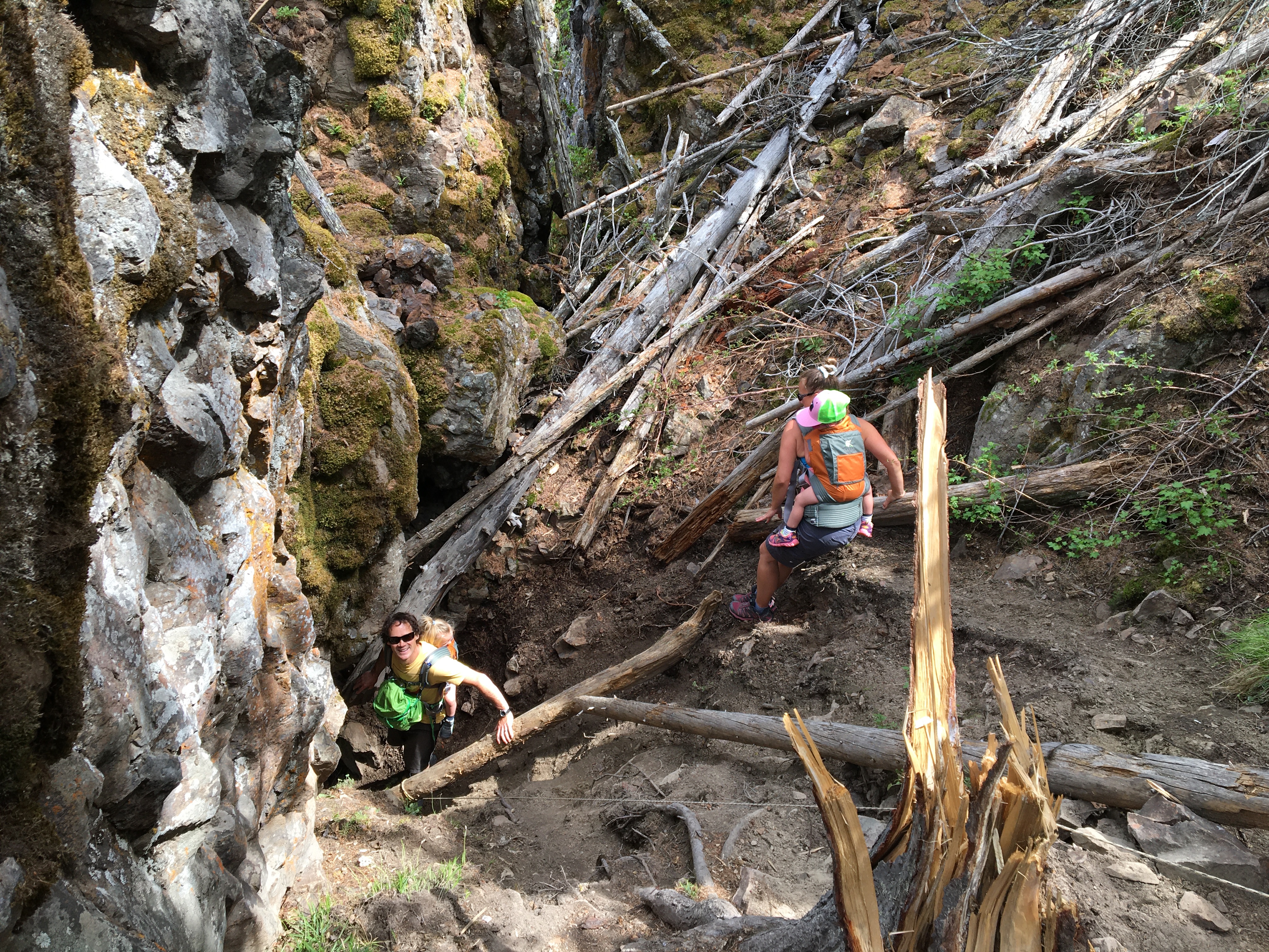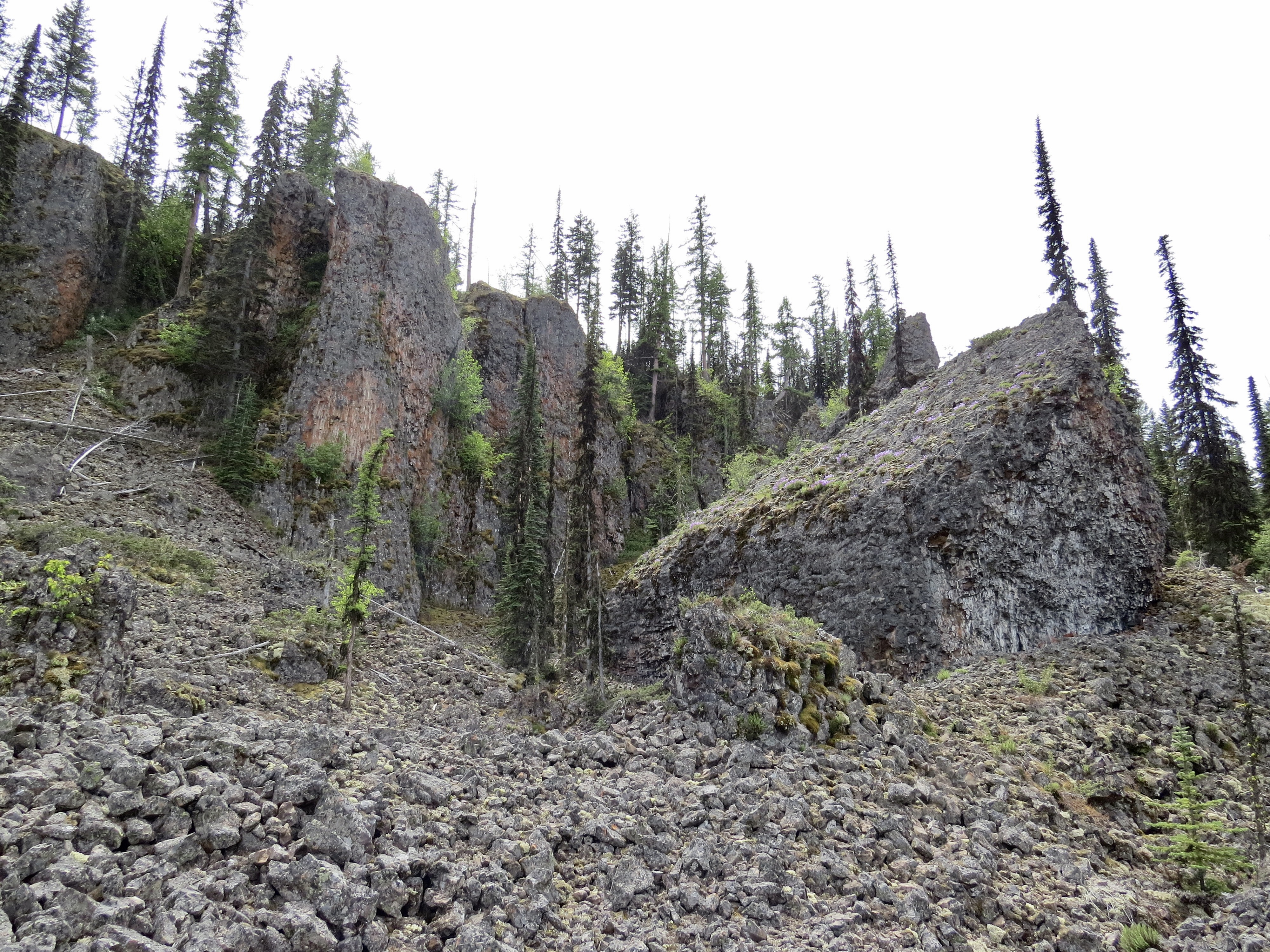 As spring pushes into summer we always try our best to get out for the low lying hikes before the weather gets too hot. We decided again to hit the trails with our neighbour Bruce. He is always a good sport and puts up with our crazy antics and our two littles bounding around. This time around we chose to venture out to the Rimrocks just east of Vernon and up the King Edward Forest Service Road (FSR). To most Vernon residents this is where you go when you want to burn pallets and old couches at bush parties, or blaze around on your dirt bikes and side-by-sides through the bush. But to us, this is a great family outing with a short hike to some remarkable geological features of ancient lava formations.