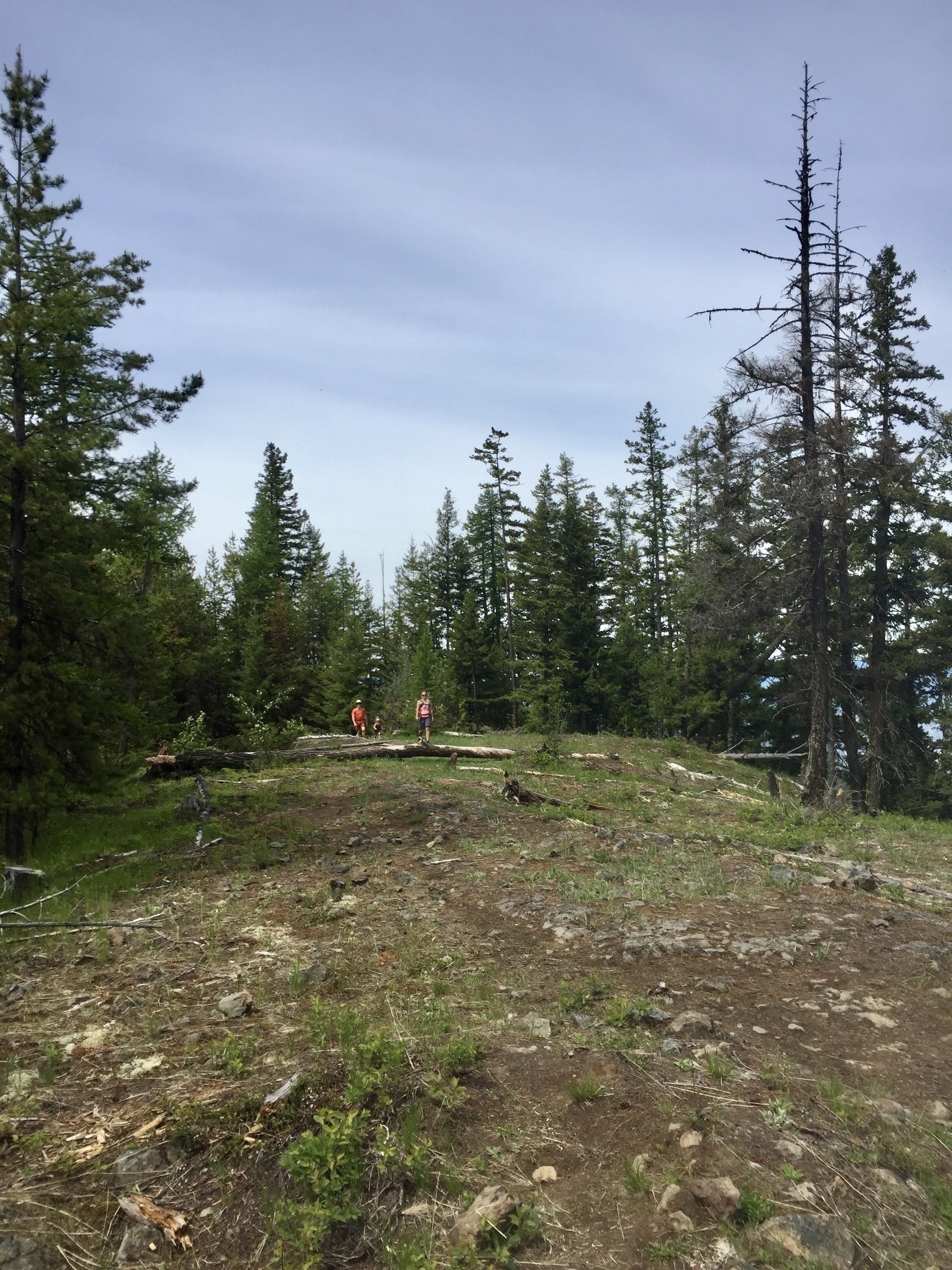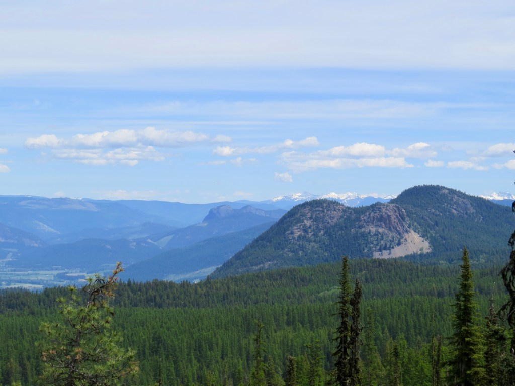 As you head up King Edward FSR you continue straight around the 4km mark rather than making the tight switchback to the right. There is a yellow sign reading Brenner Road that you continue onto. Another couple kms and you will see a wide part on the down hill side of the road just after a clear cut forest area with a sign on the ground for The Rimrocks trail head. You walk through a couple road deactivation ditches for 1200m or so before you come across an old Suburban wagon in the right hand ditch and a cattle guard. This is a fairly mosquito filled area so use this information as you please. From here you climb a bit more and sweep to the left before the trail turns into a couple single tracks heading in opposite directions. Take the left path and you will be led across the top cliff section of the rimrocks. There are numerous view points of the Coldstream and Lavington valley below with amazing views of Bluenose Mountain, The Camels hump and the Monashee Mountains far in the distance.