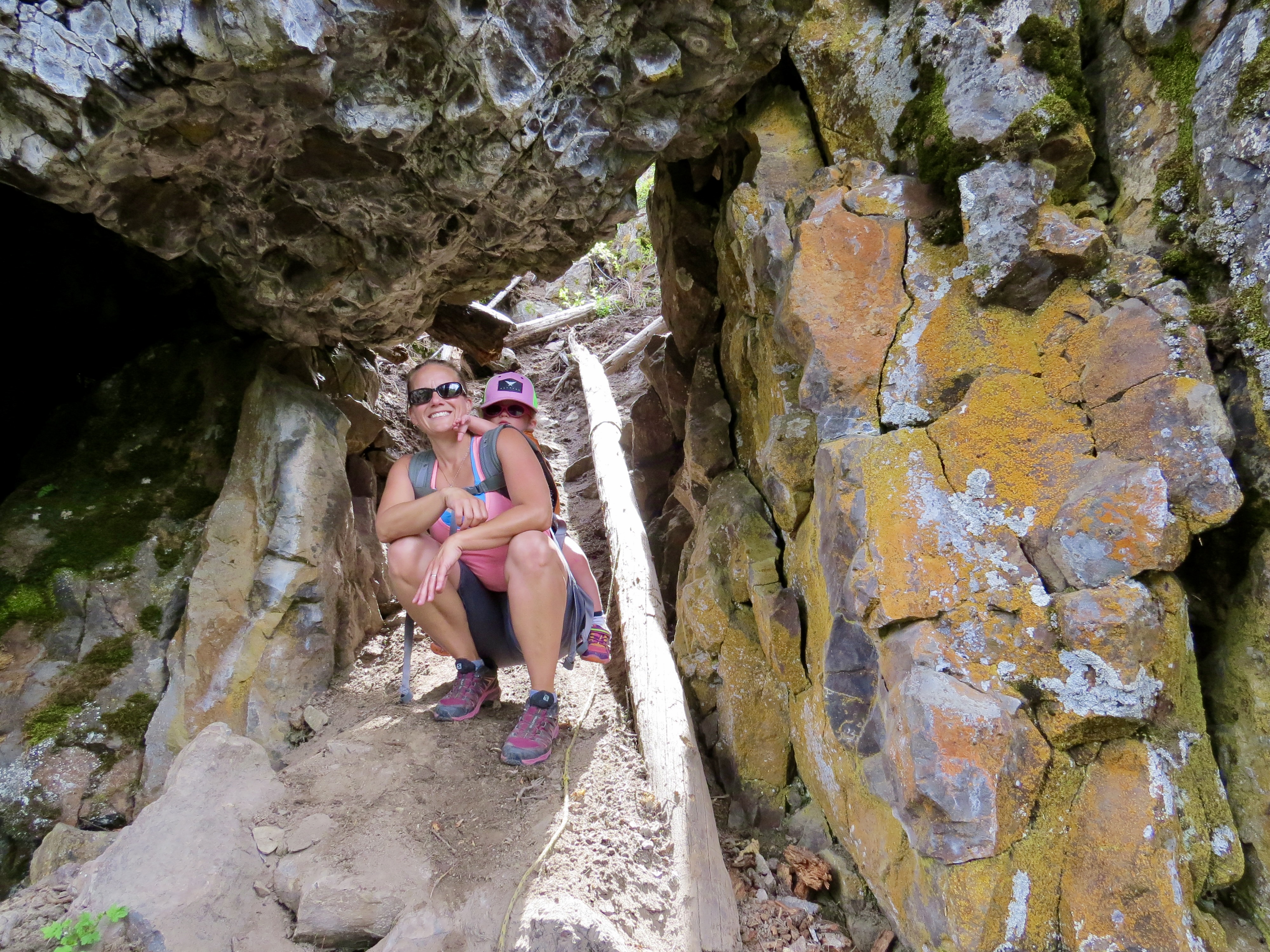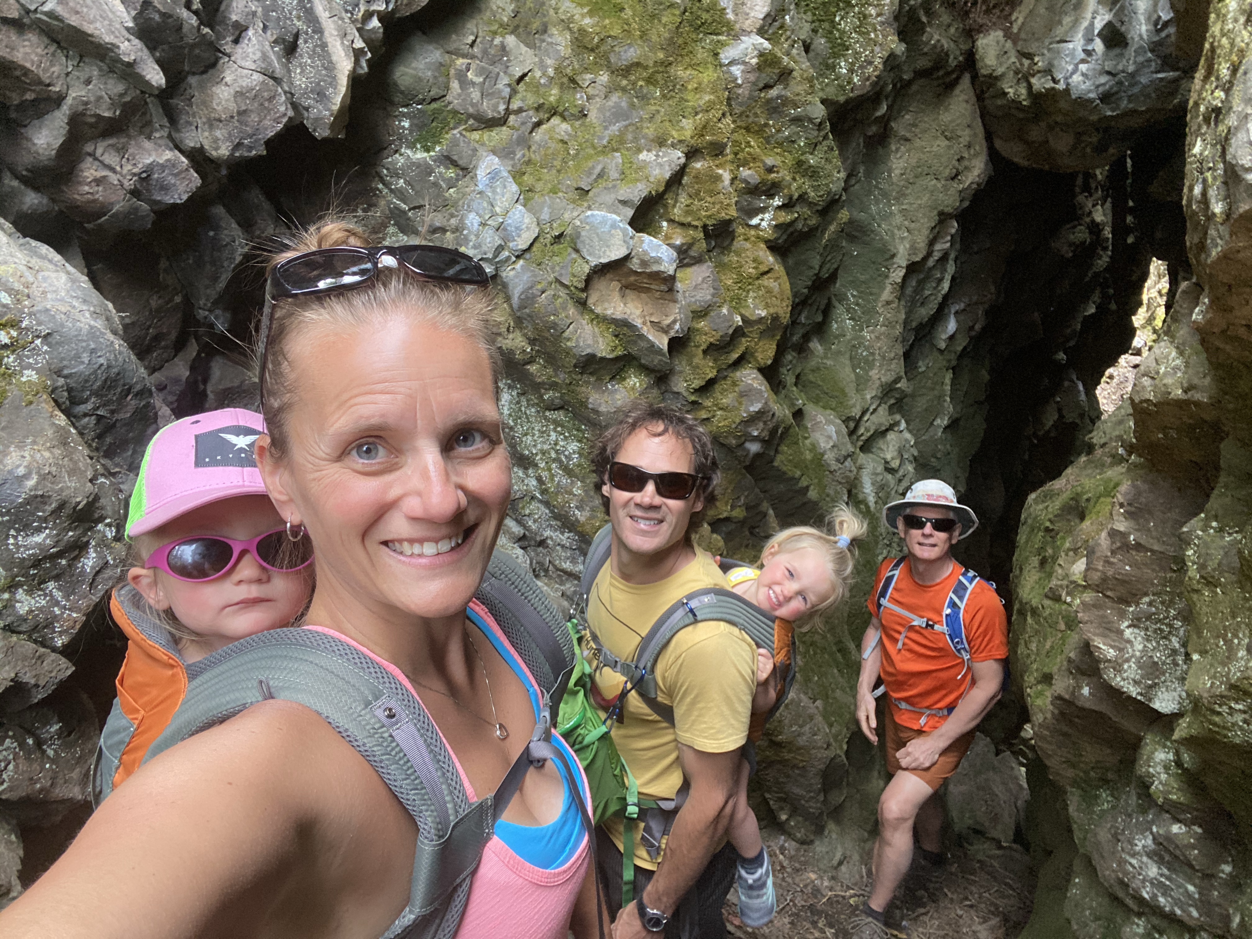 We walked out onto a small spire for a relaxing lunch spot and to enjoy the surroundings. As good as it is from up here, heading to the base of the Rimrocks is a must do. There is one location that has a steep descent down a dusty gravel shoot with a funny little rope attached that can take you there. It is not a long pitch up two thirds of the way down on your left you see a rock chasm. You can take a short meander inside its narrow walls and even spider crawl your way further if you are being adventurous. At this point we had the girls on our backs so we chose to keep our feet on the ground.