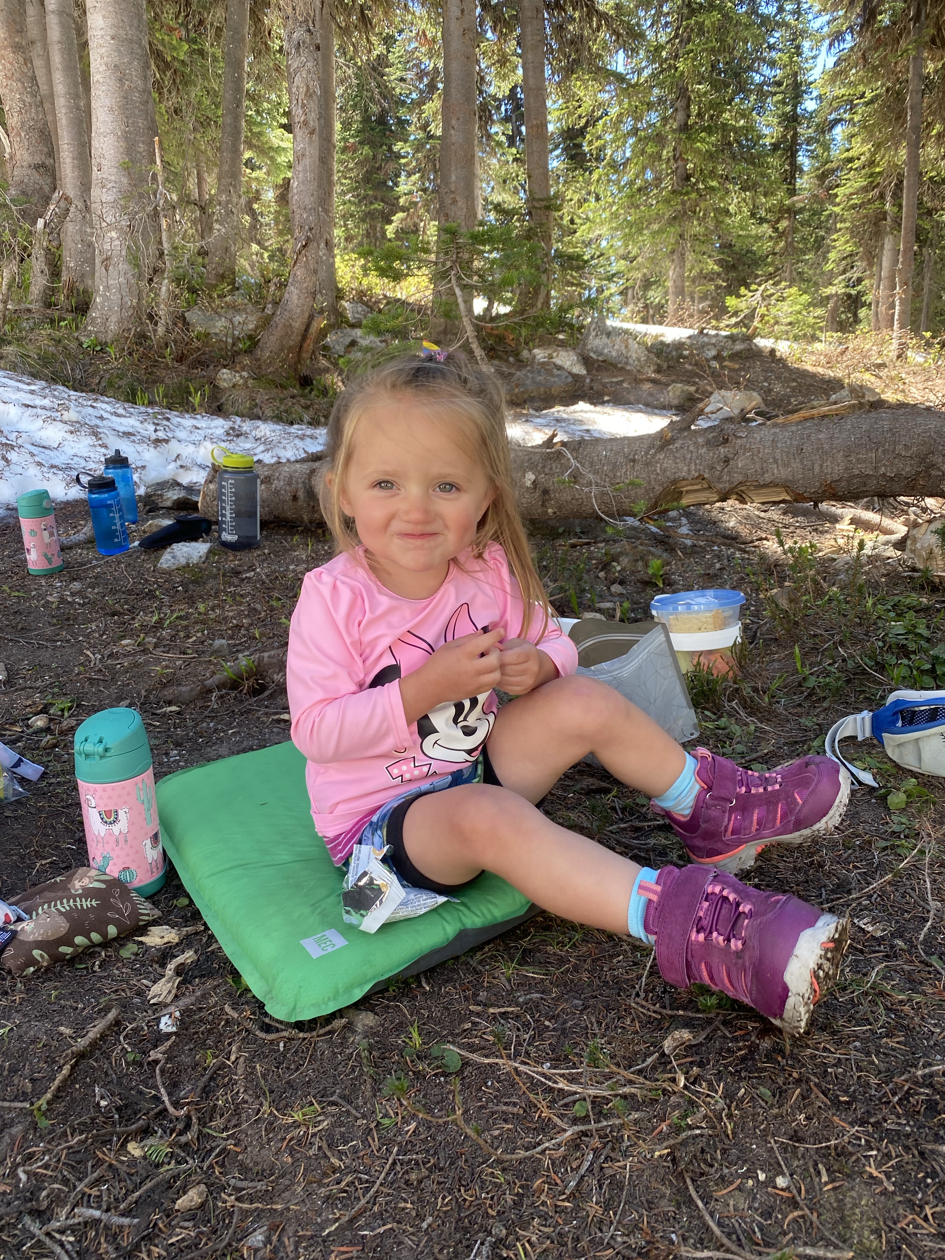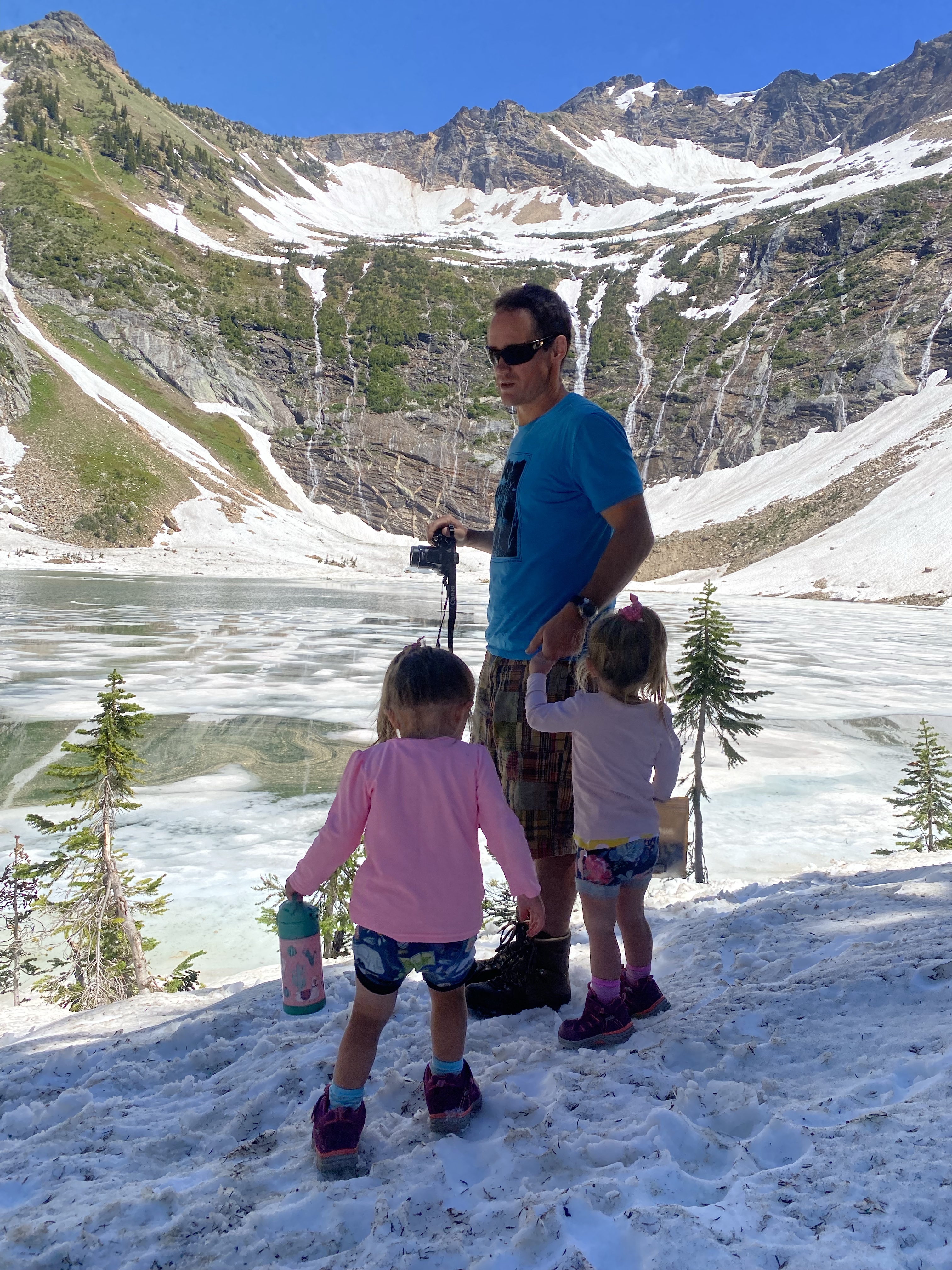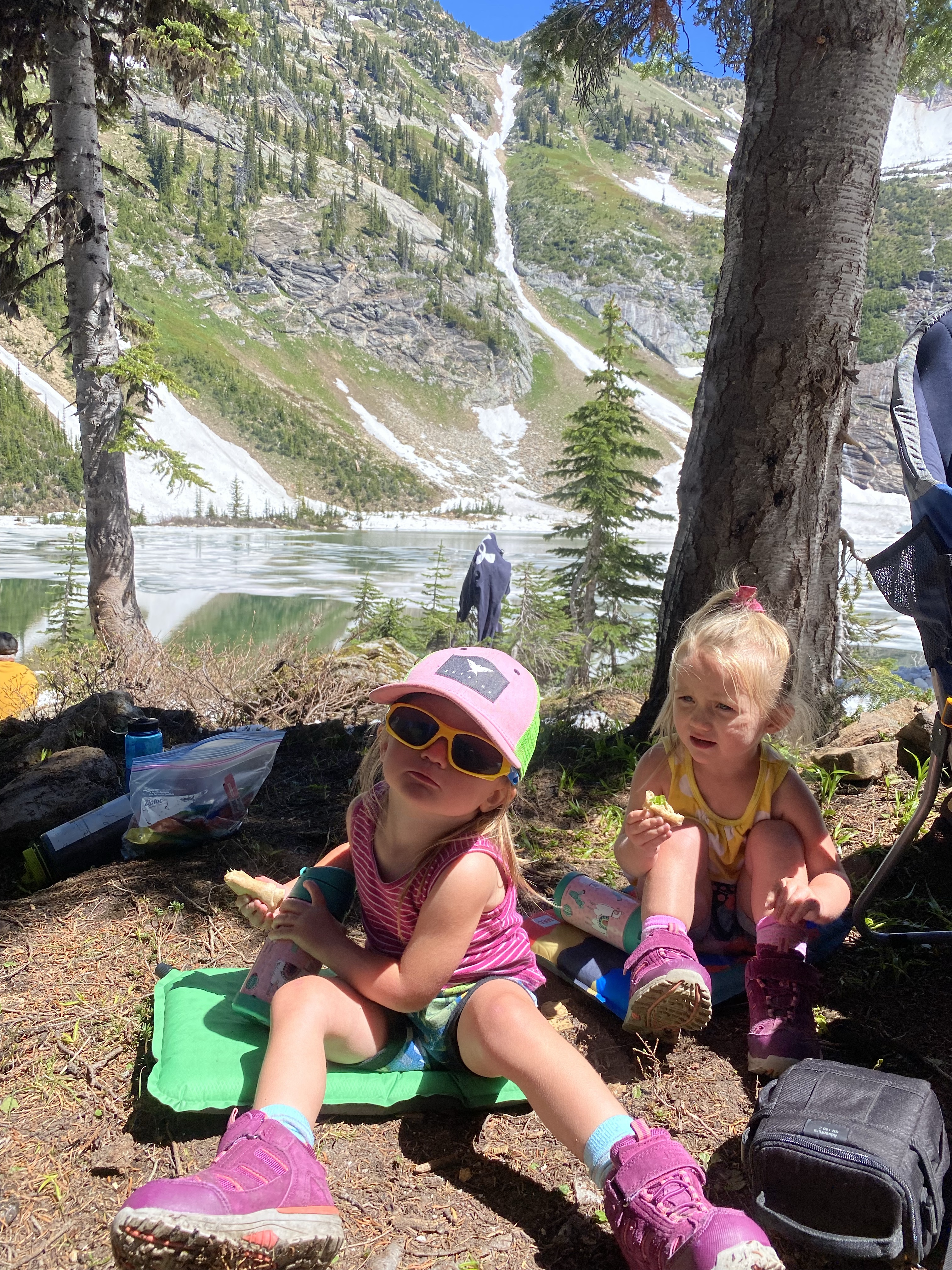 Upon arriving at the lake we were greeted by a handful of other day hikers including a family with young children who arrived the night before. There was still ice floating around the lake and large patches of snow on the shore. We got the girls out of the packs and let them run around, ate some lunch, visited and enjoyed the cooler temperatures.