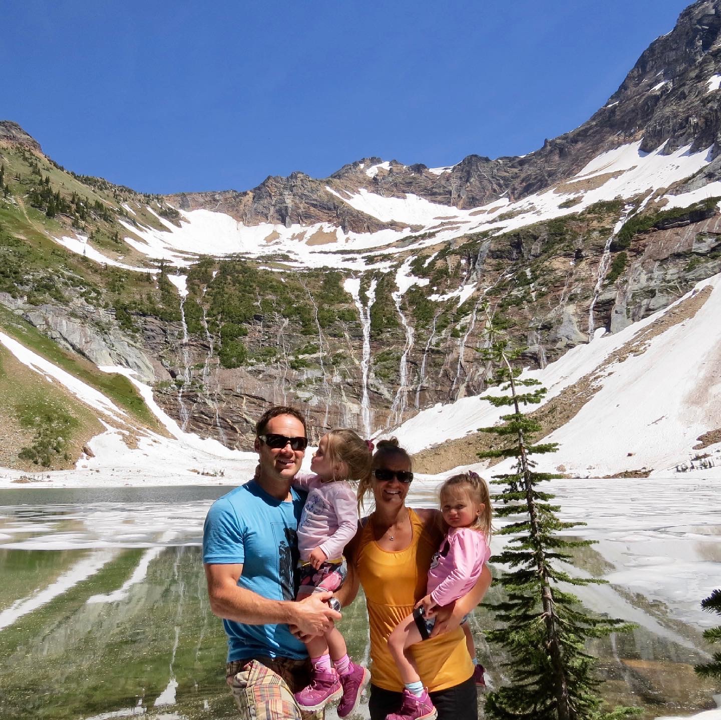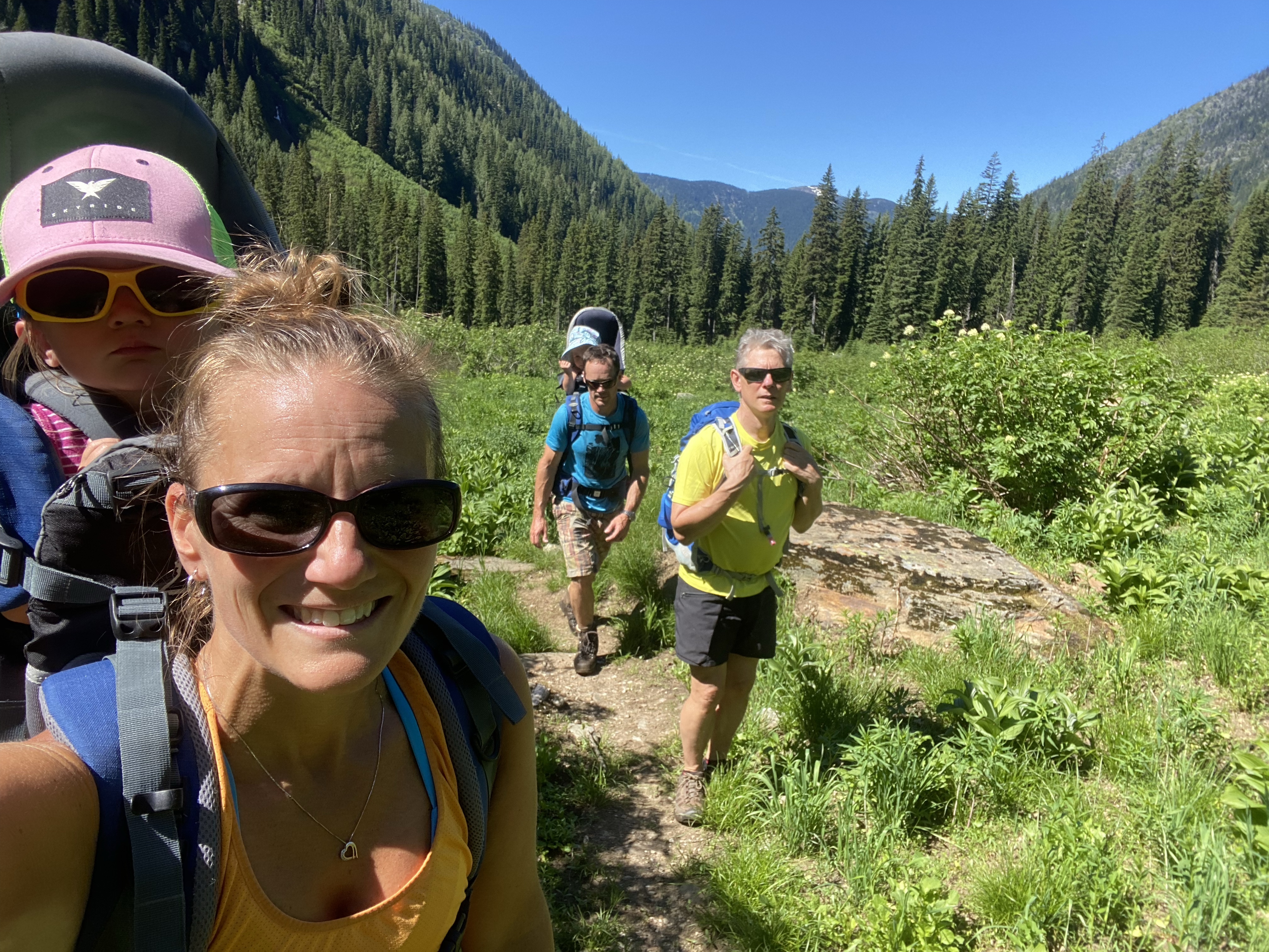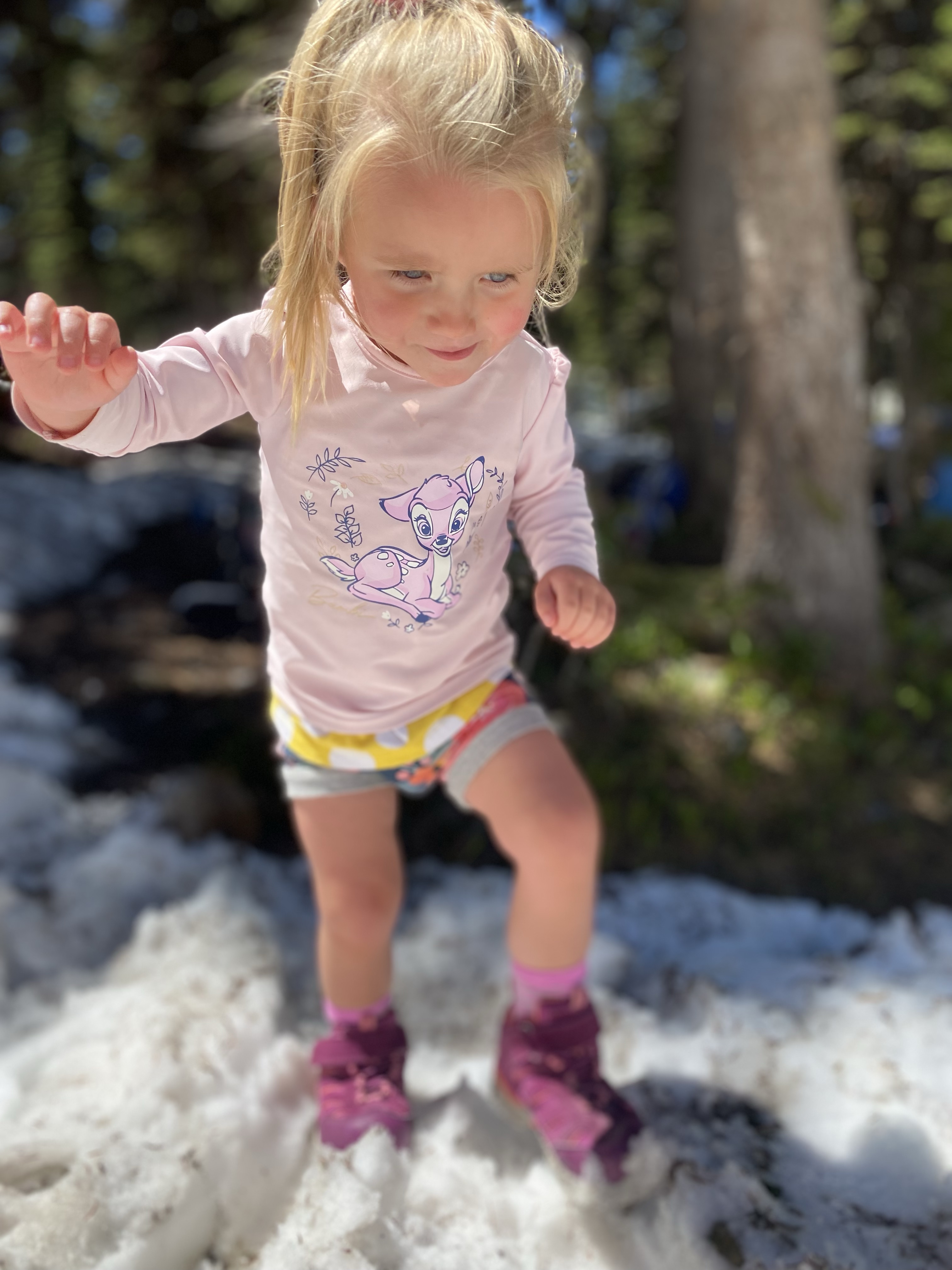 Upon arriving at the lake we were greeted by a handful of other day hikers including a family with young children who arrived the night before. There was still ice floating around the lake and large patches of snow on the shore. We got the girls out of the packs and let them run around, ate some lunch, visited and enjoyed the cooler temperatures.