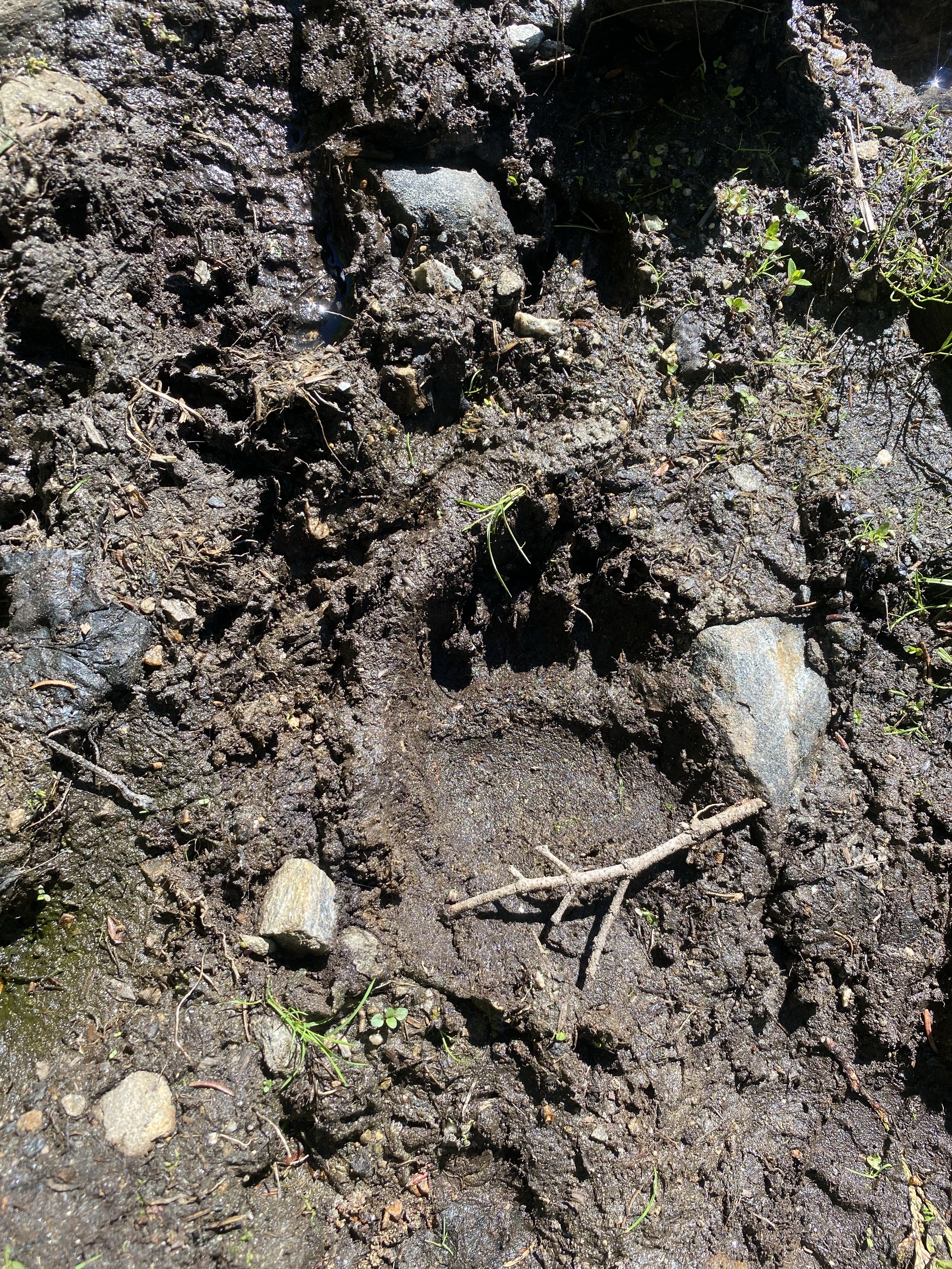 We arrived at the parking lot to several other vehicles already there. The truck temperature gauge said 17 which was perfect hiking temperature. With the girls all loaded up in the Deuter backpacks with plenty of snacks and water we were on our way. First up, crossing the creek. This is now done by way of a fallen tree laying across the water with a rope strung between trees to help guide you. Once across we carried on winding through the forest, crossing over small streams, avalanche shoots and lots of muddy patches. As we broke free the suction of our boots we noticed fresh bear prints in the mud.