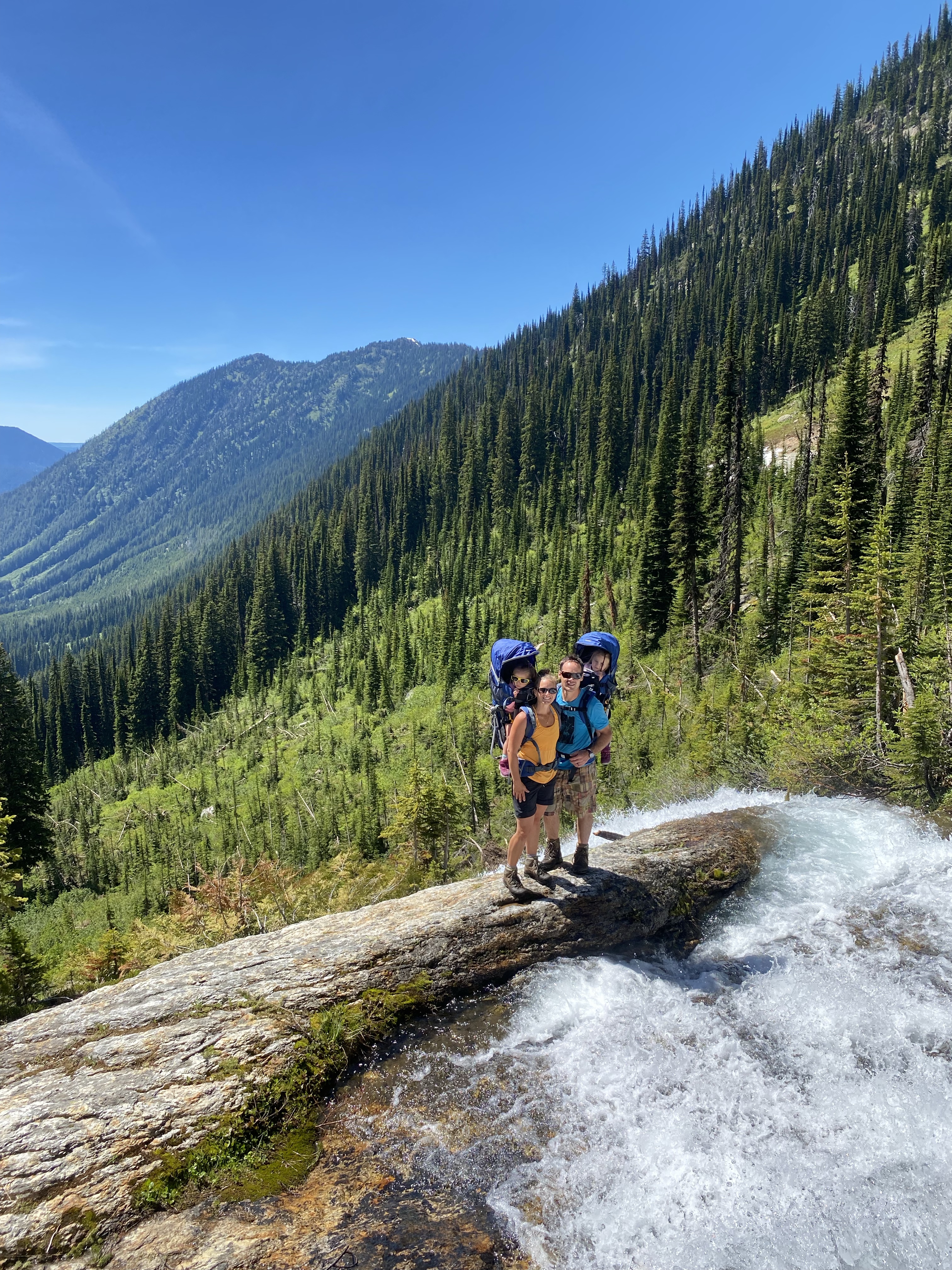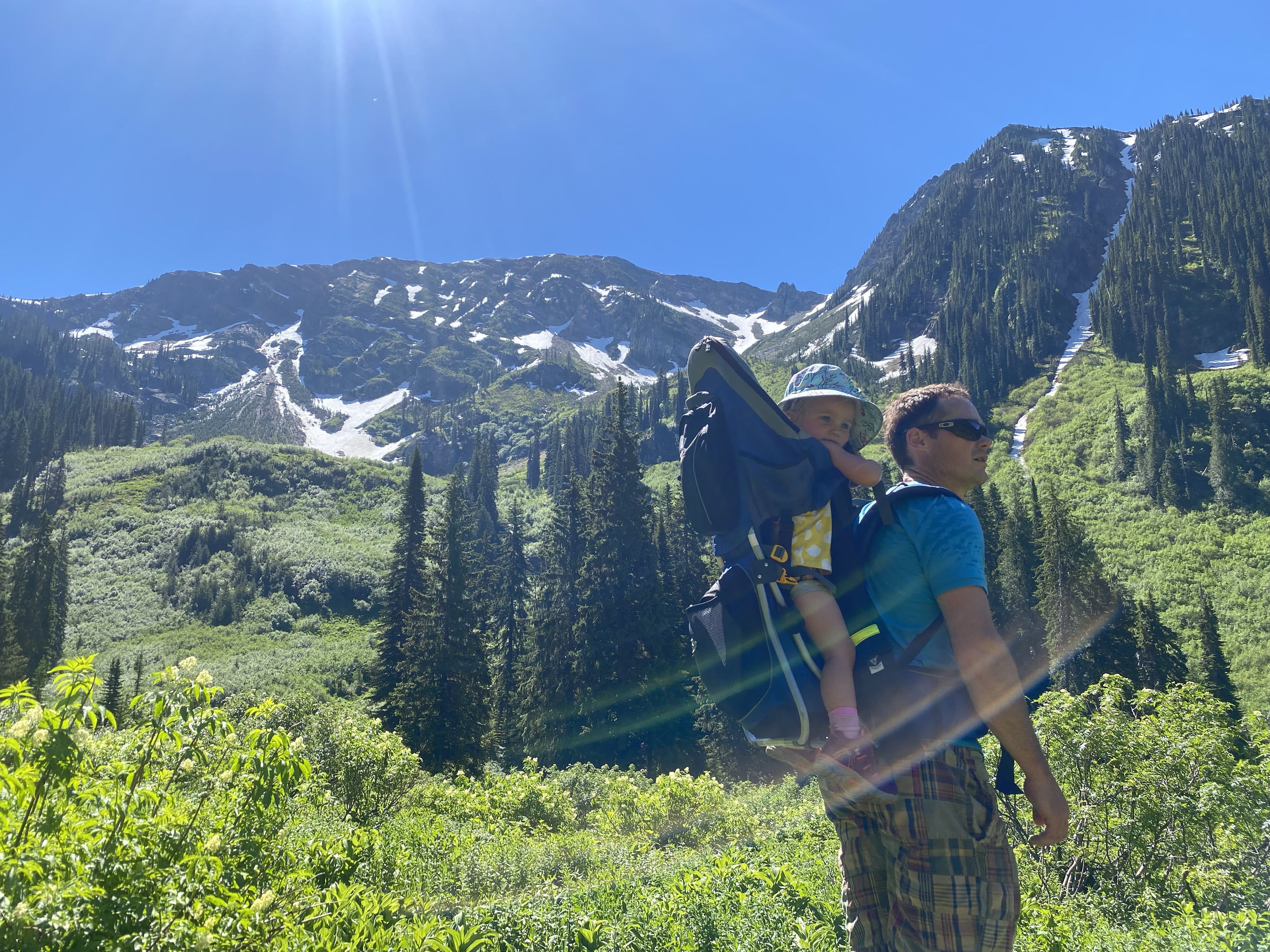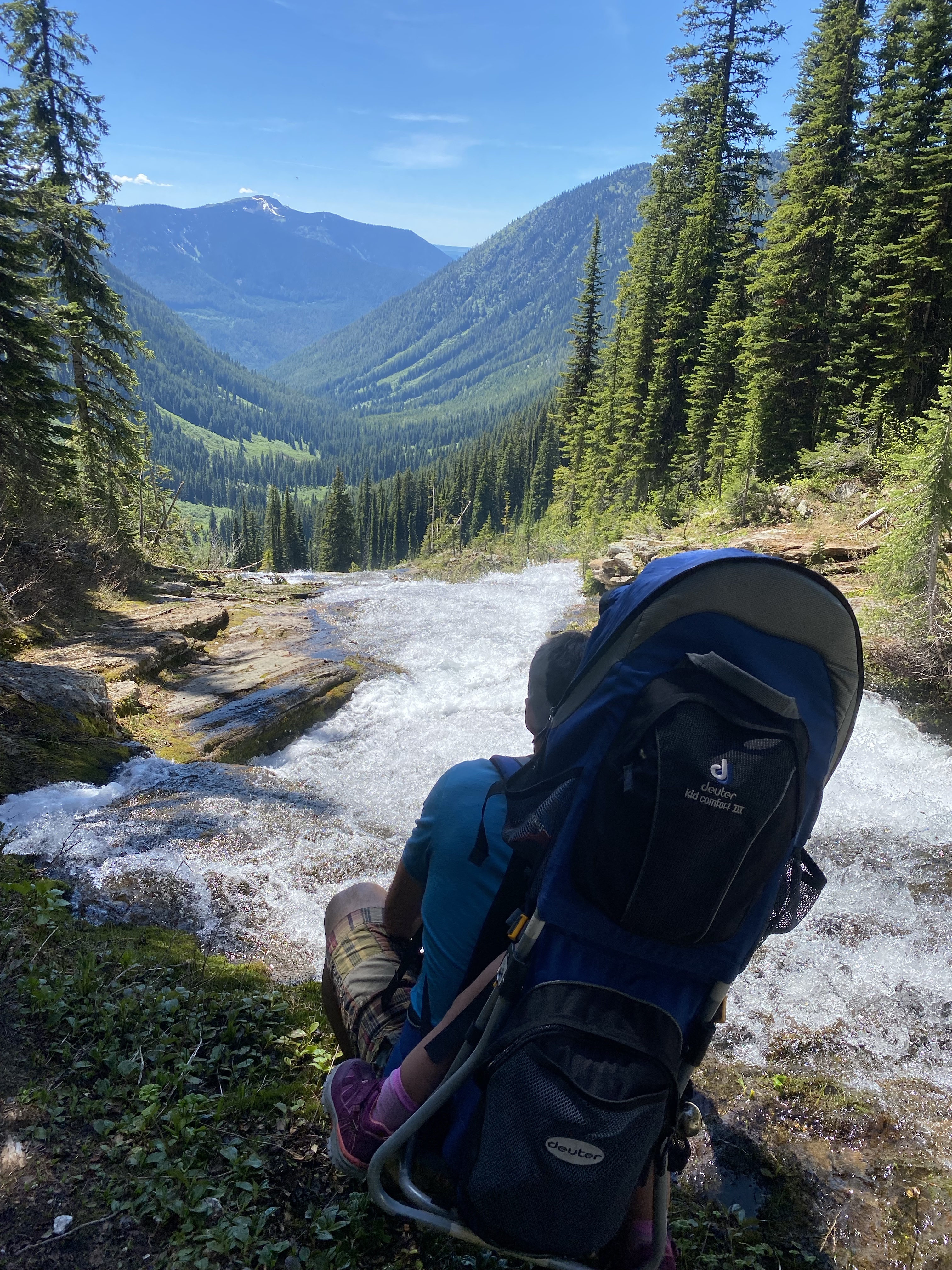 The valley eventually opened up in a large clearing where the trail crosses the creek at a large boulder. Scampering across the log jam and over the rock was a bit challenging with the precious cargo on our backs. This is where the views really start to shine.