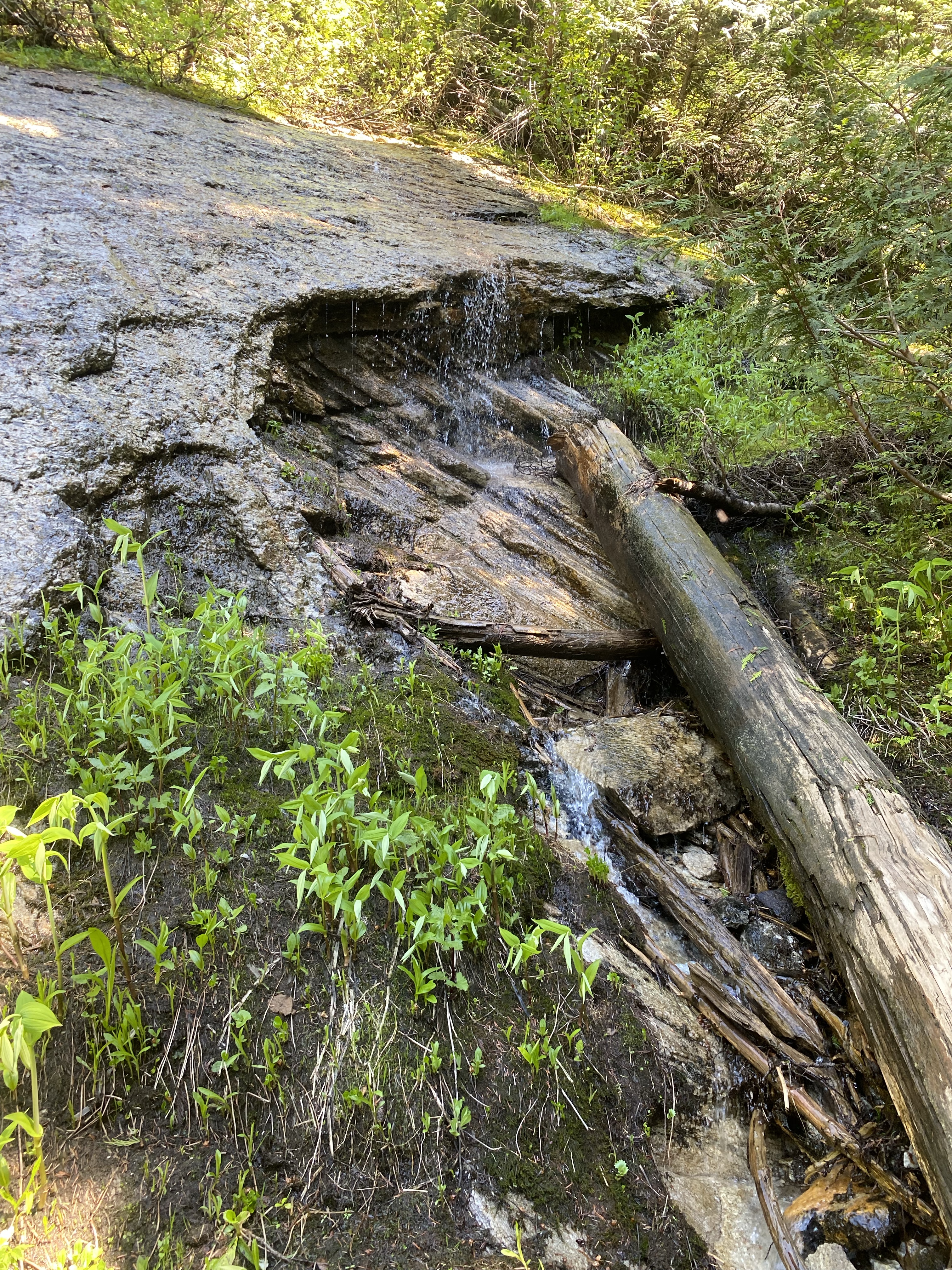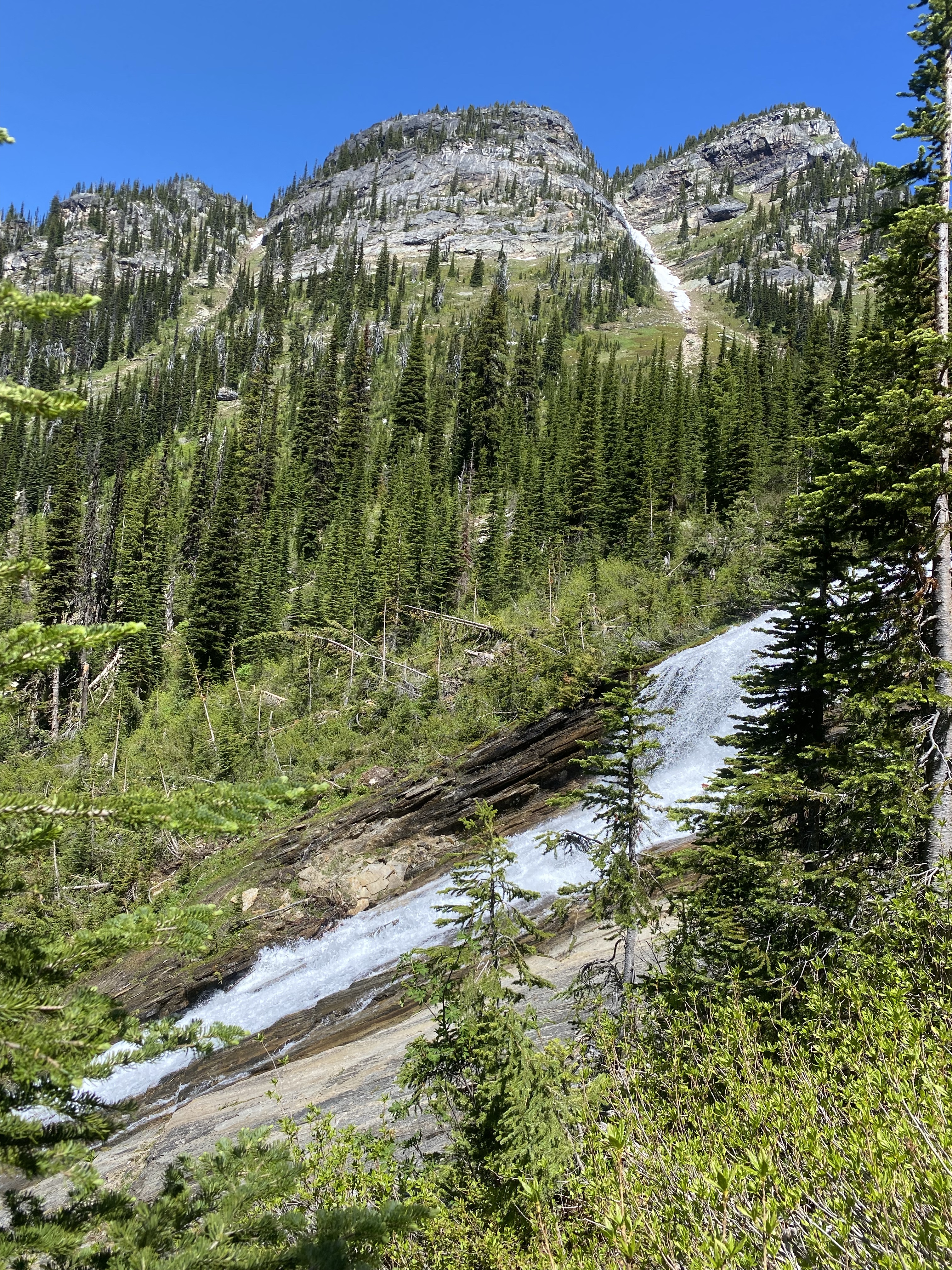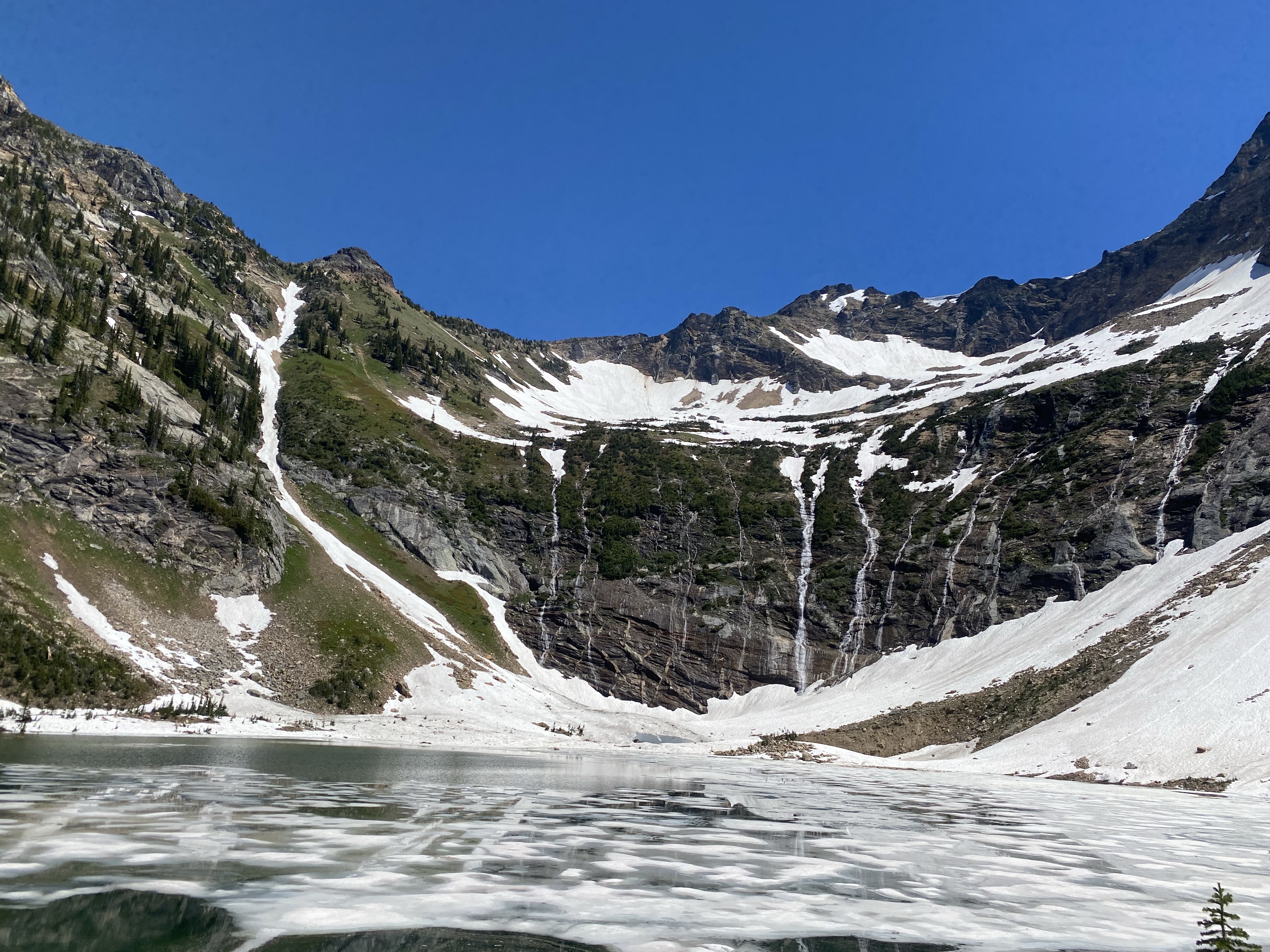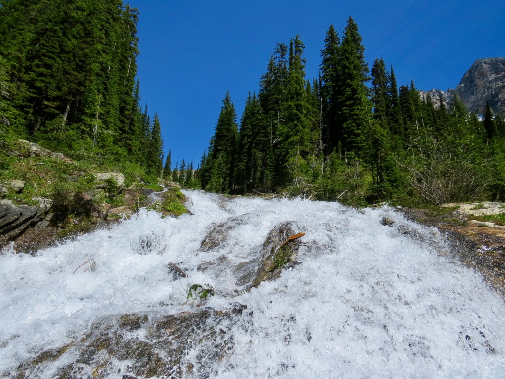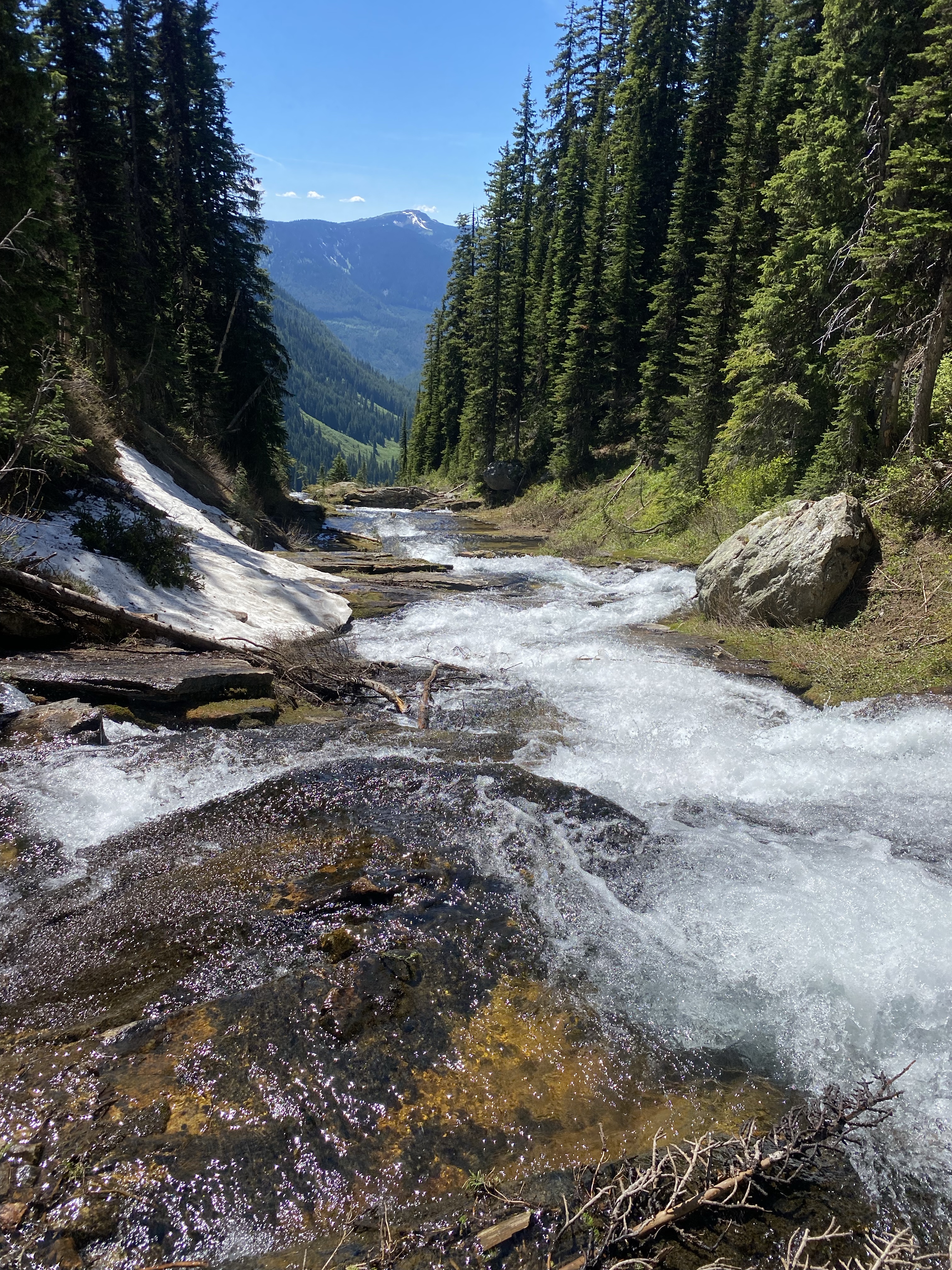 The June hike made for much more scenic views as the snow melts down the rock face across the lake. Everything was green and the air was crisp. Now all packed up it was then time to head back down to reality. We walked along the creek as far as we could. We were forced to rejoin the trail as the rock steepened and the water plunged over the cliff turning it into a free fall.