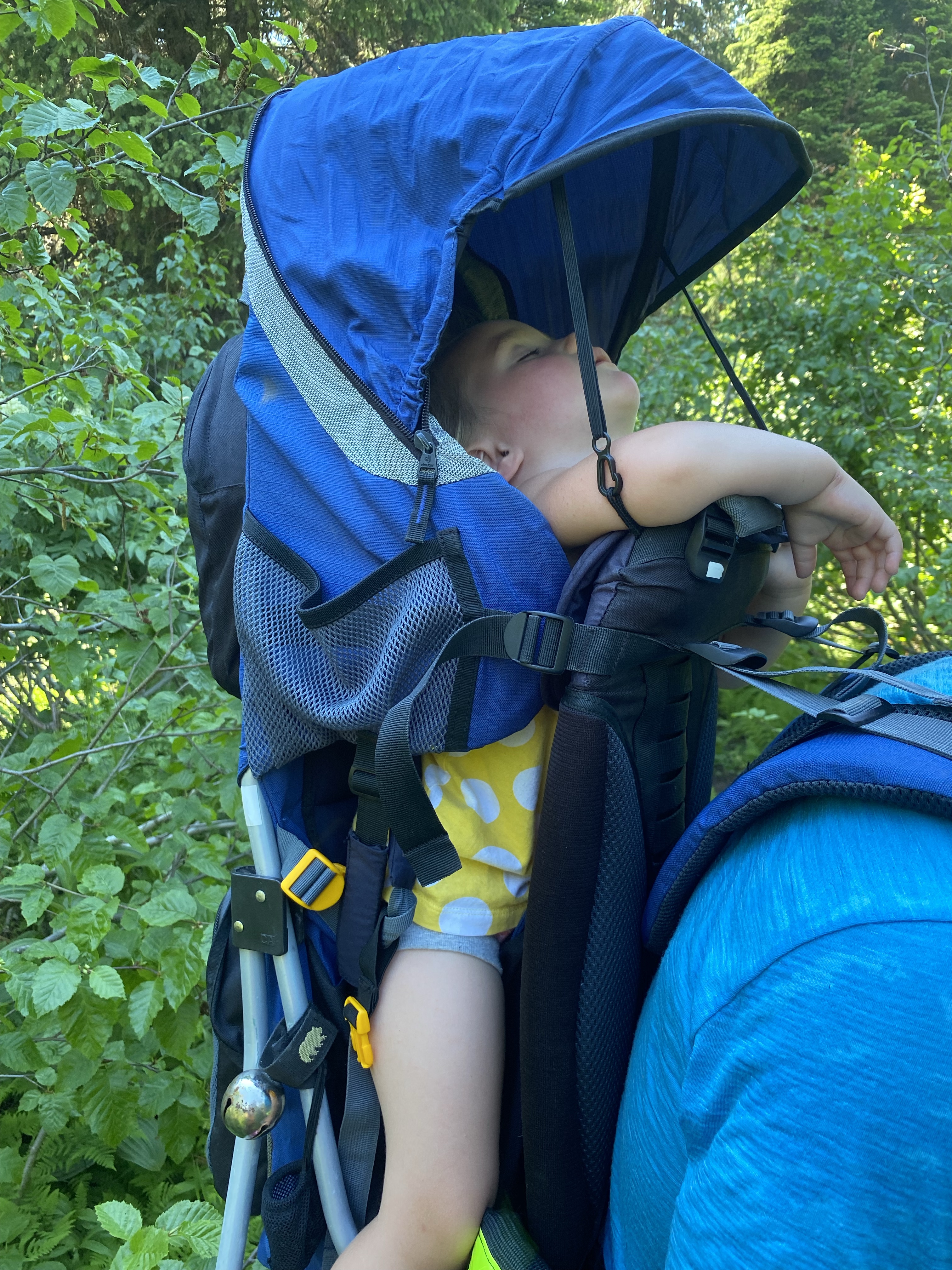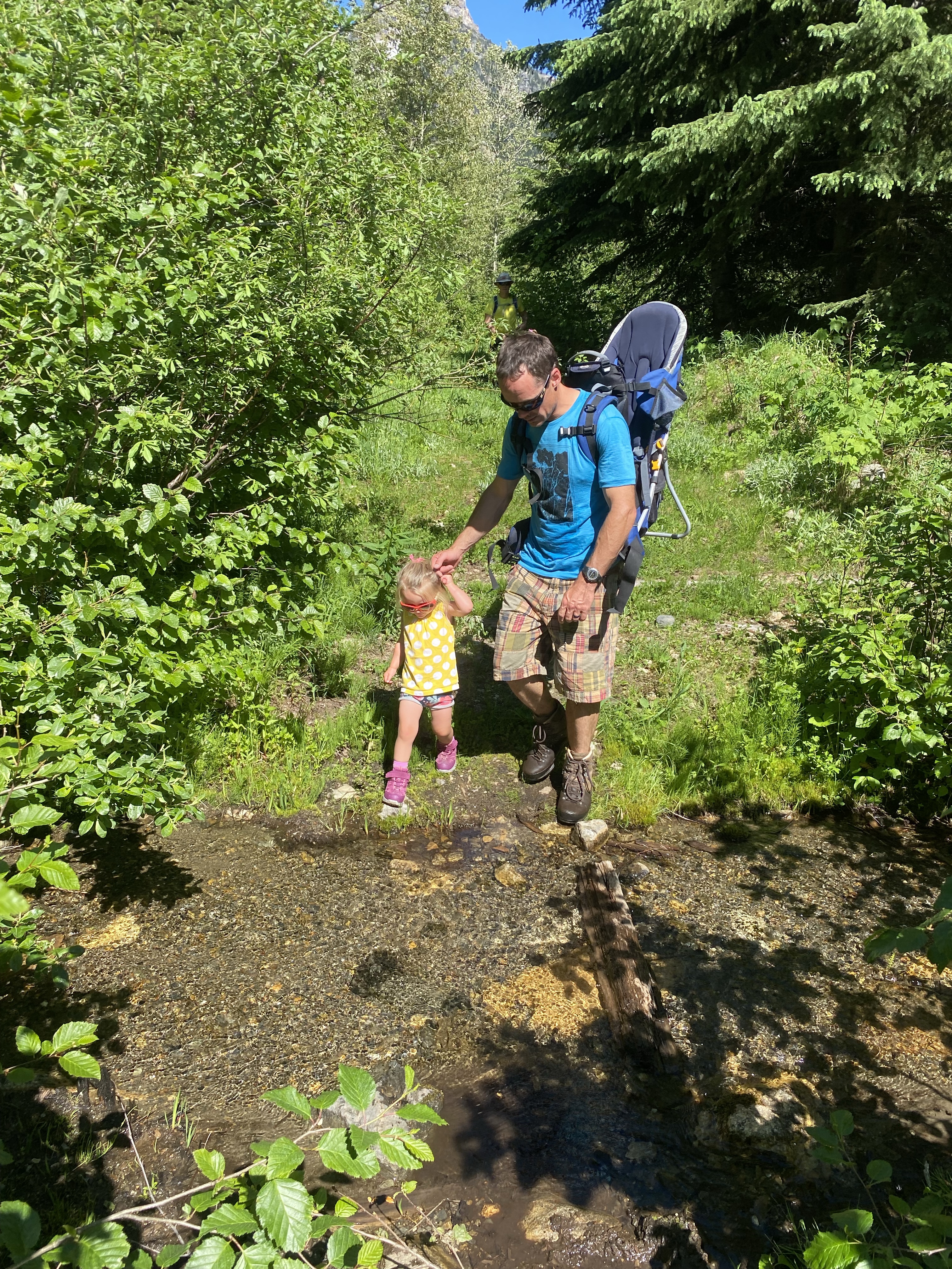 The girls had wanted to get out and walk for most of the descent but the off access terrain, snowy patches and large mud sections kept them in the packs. For the final km of the trek we pulled the girls out and let them run the rest of the way down.
