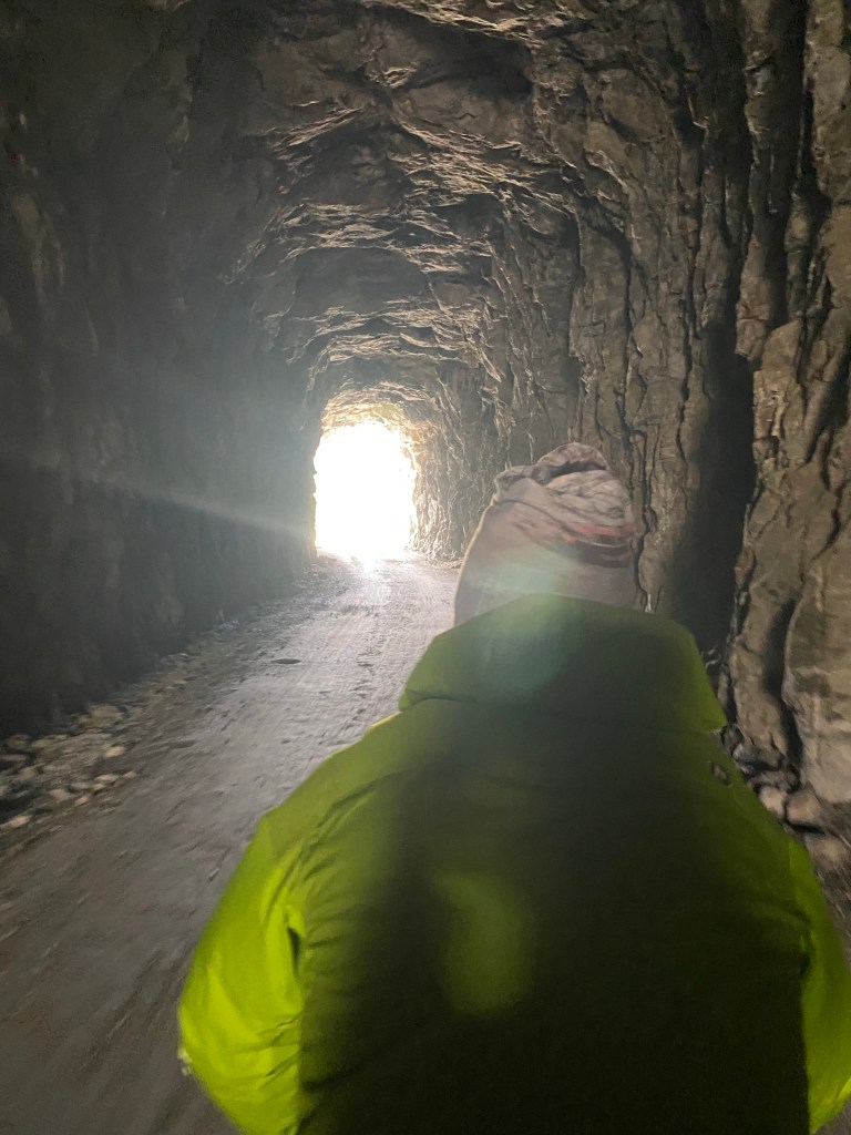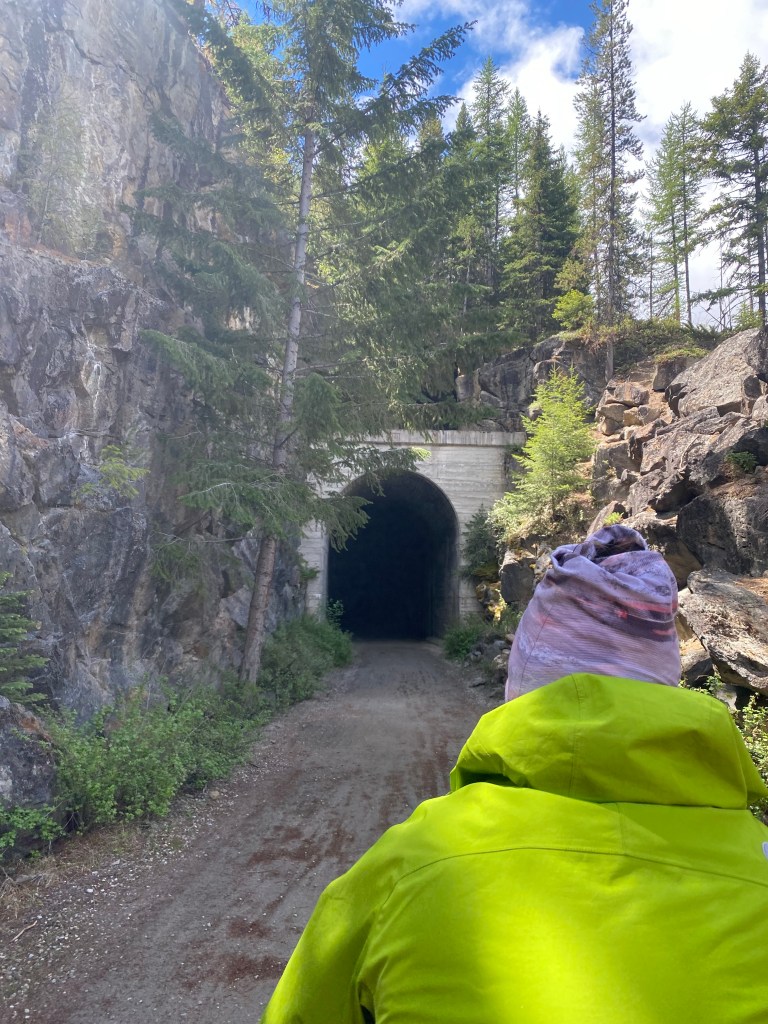 We would follow close behind as they crossed the spans and tossed stones down between the ties. We would load them up as we passed through the tunnels and across some of the longer stretches of trail. As we approached the famous #6 Trestle you are left with amazement with is size. Standing 55m tall and 220 meters long is has a gentle arch that spans across the gorge below. This became our lunch spot for the day.