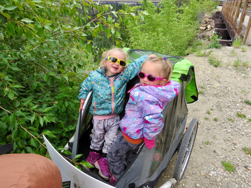 Getting out of bed was not overly welcoming as I noticed I could see my breath as I zipped the tent fly closed. Shannon started on boiling water for hot drinks while Bruce tended to a fire and I was packing bags and sorting out gear. After a few cups of hot chocolate were passed around and our remaining breakfast bagels with peanut butter was consumed we all focused our energy on packing up. Luckily over the night we didn’t have any rain so this activity was much more pleasant. Tents were collapsed, kids were bundled, gear was stowed and we were ready to role out. 9:30 this time, our earliest morning yet. As we passed our fellow campers in their trailers and 5th wheels we noticed that everyone was still tucked away and avoiding any discomfort the morning chill was bringing. The first thing you encounter on the trail is a built up section of land just wide enough for the historic train tracks with Hydraulic Lake on either side. As we looked to our left and right we saw the fog rising off the water. Shortly after we were back in the thick forest and forced to navigate our bike and trailer by hand to keep the girls out of the swollen puddles from the day before.