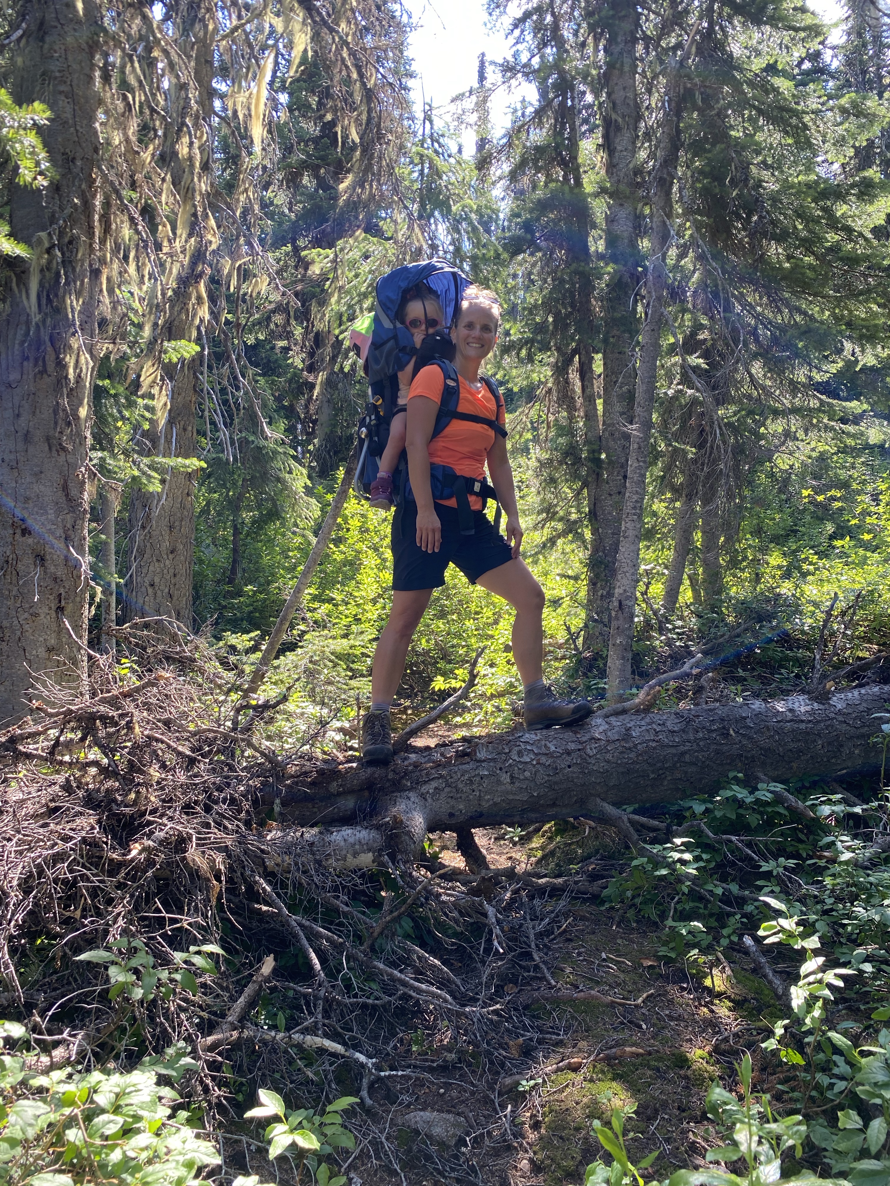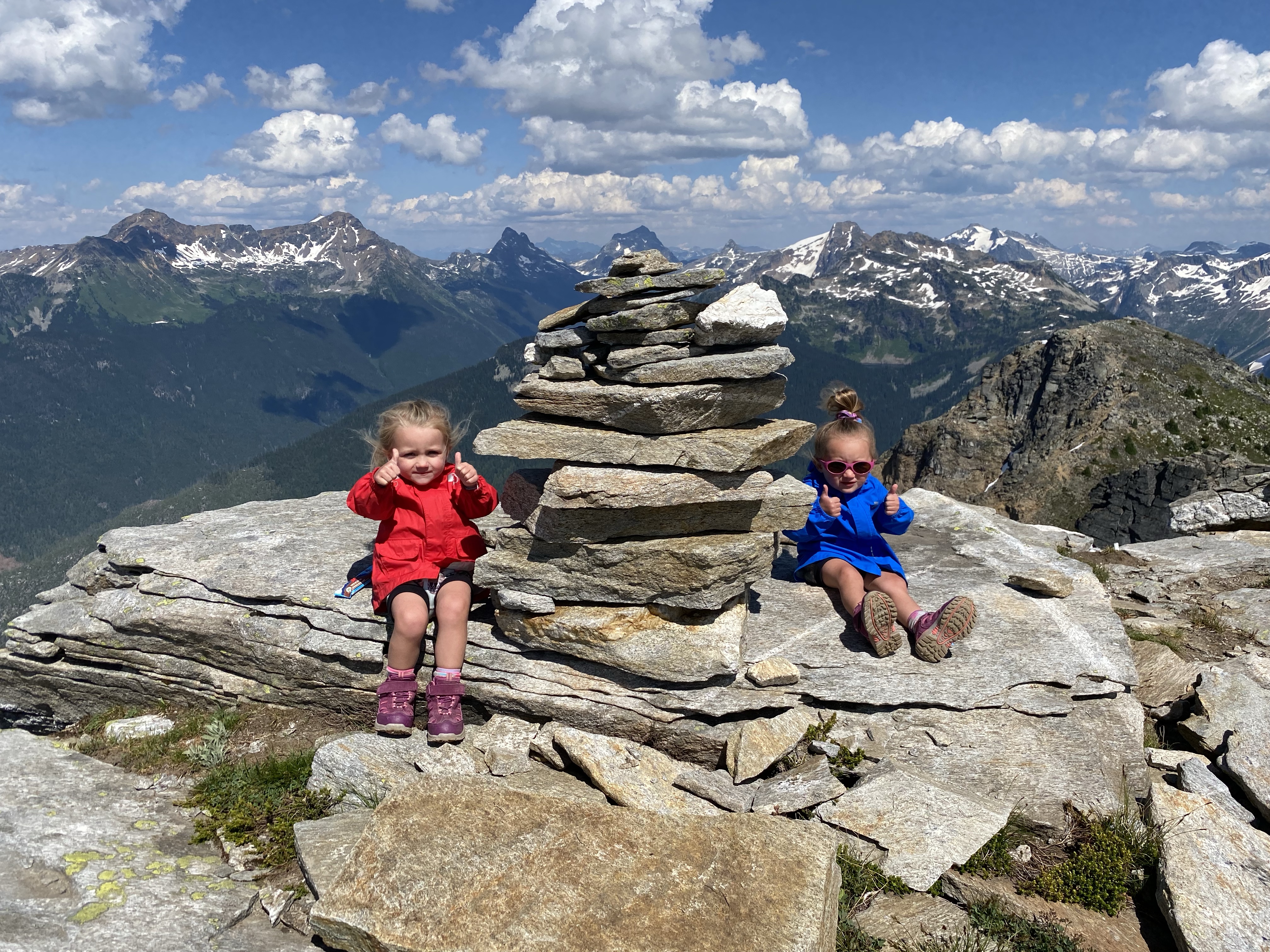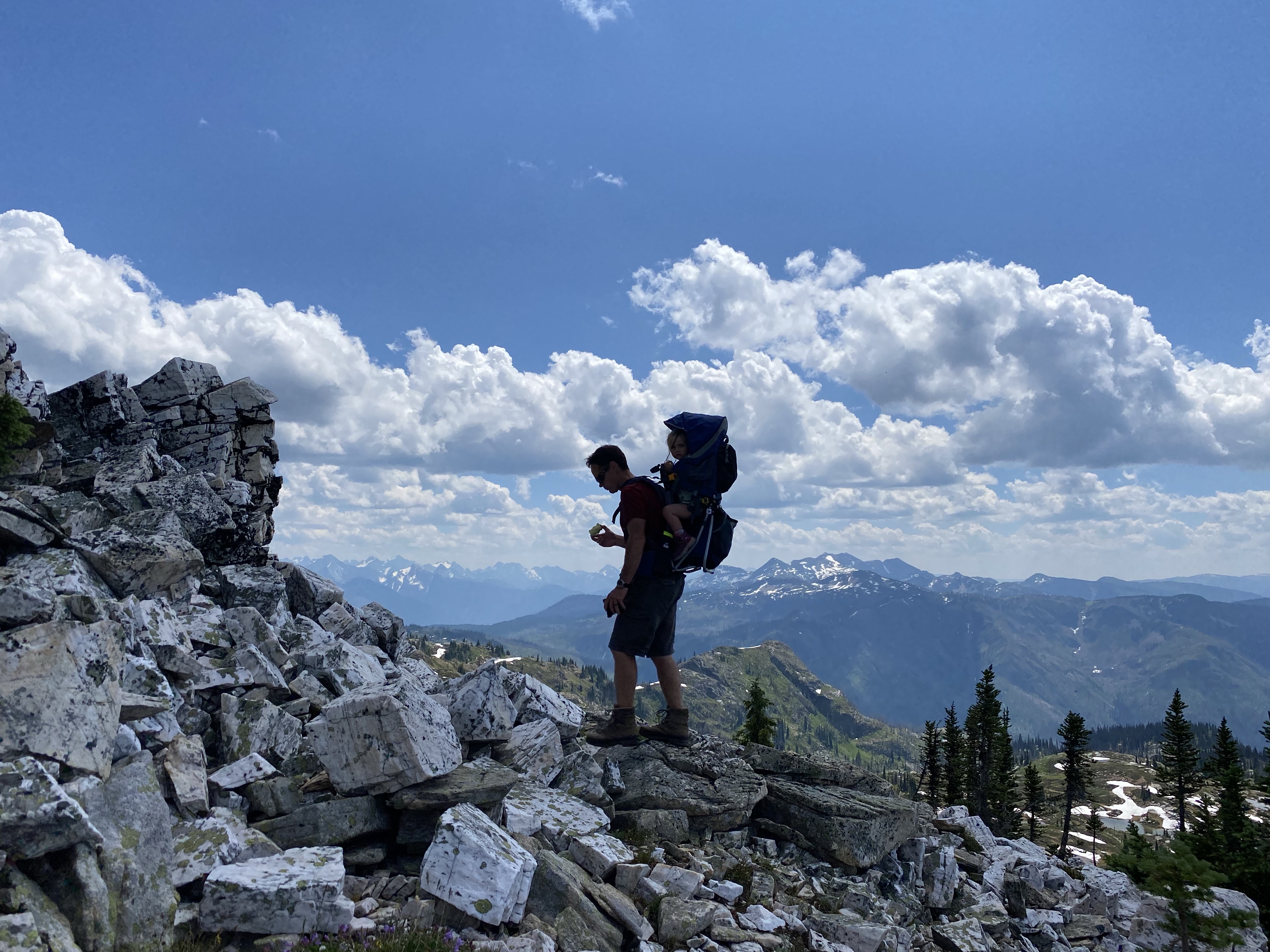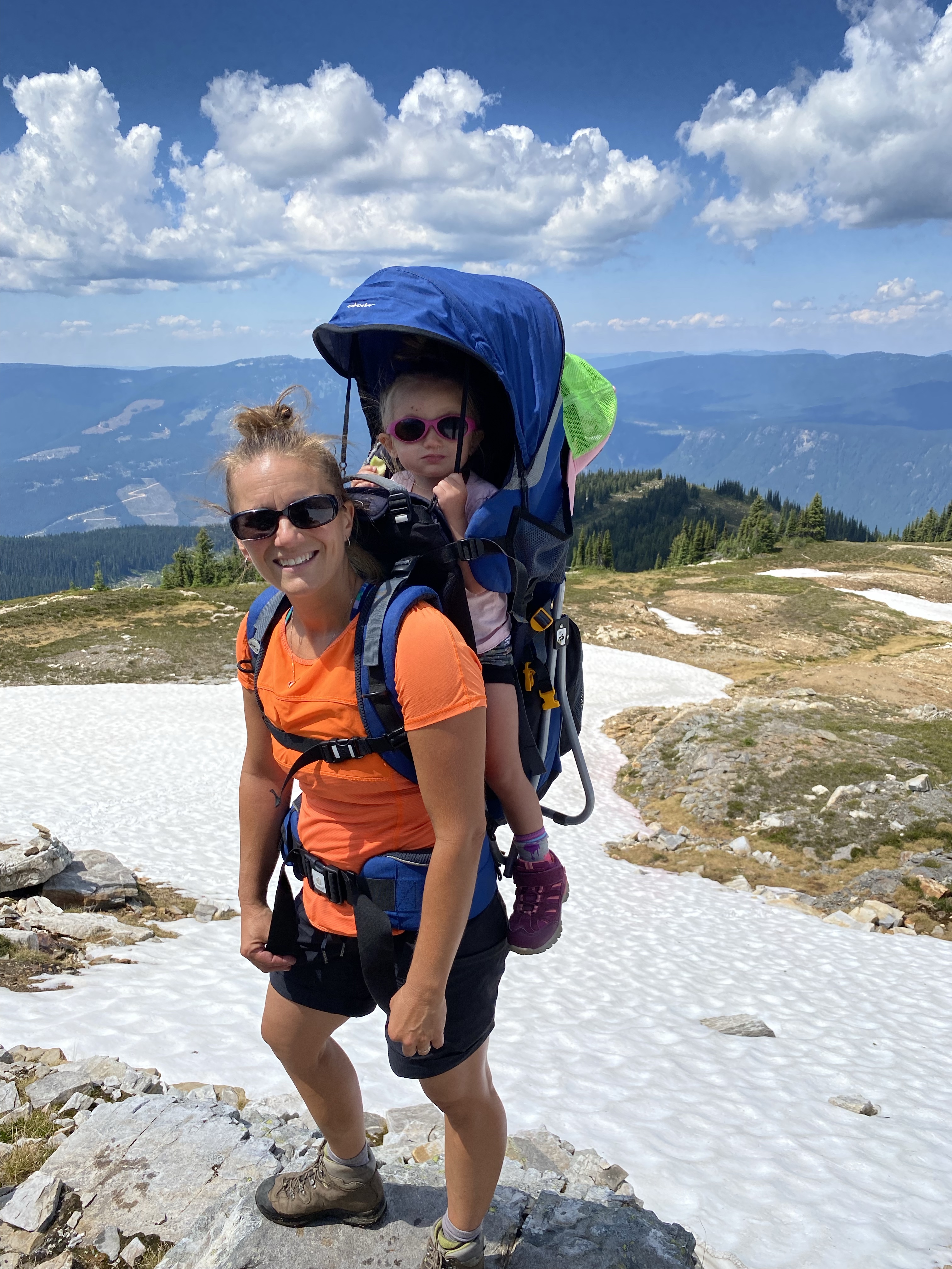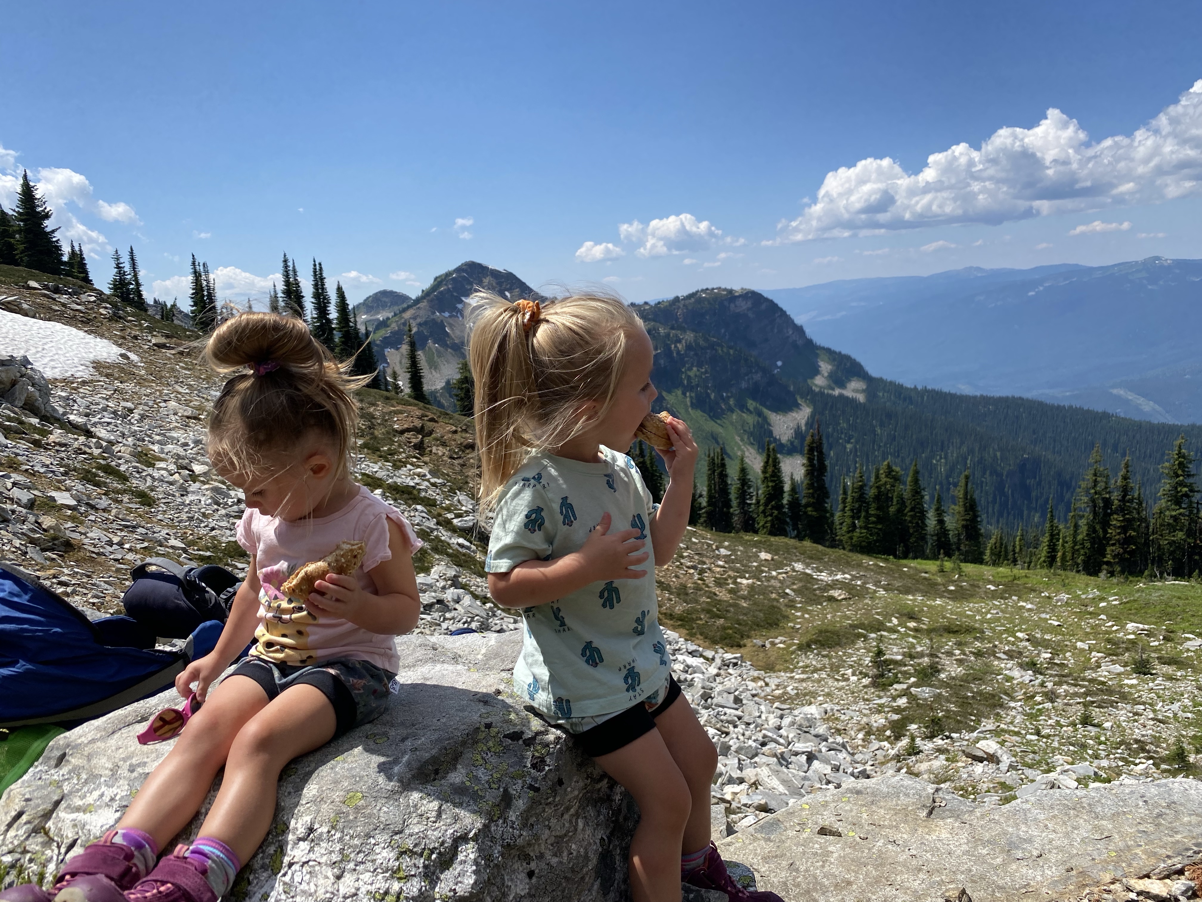 This slight change of trail was a perfect chance for the girls to run loose and give us a break with the weight for a bit. We were now teetering on the edge of the tree line so the views were starting to surface. As we passed through the clearing we found a flat rock that had us looking back over the Mable Lake valley to where we could enjoy lunch with some amazing views.