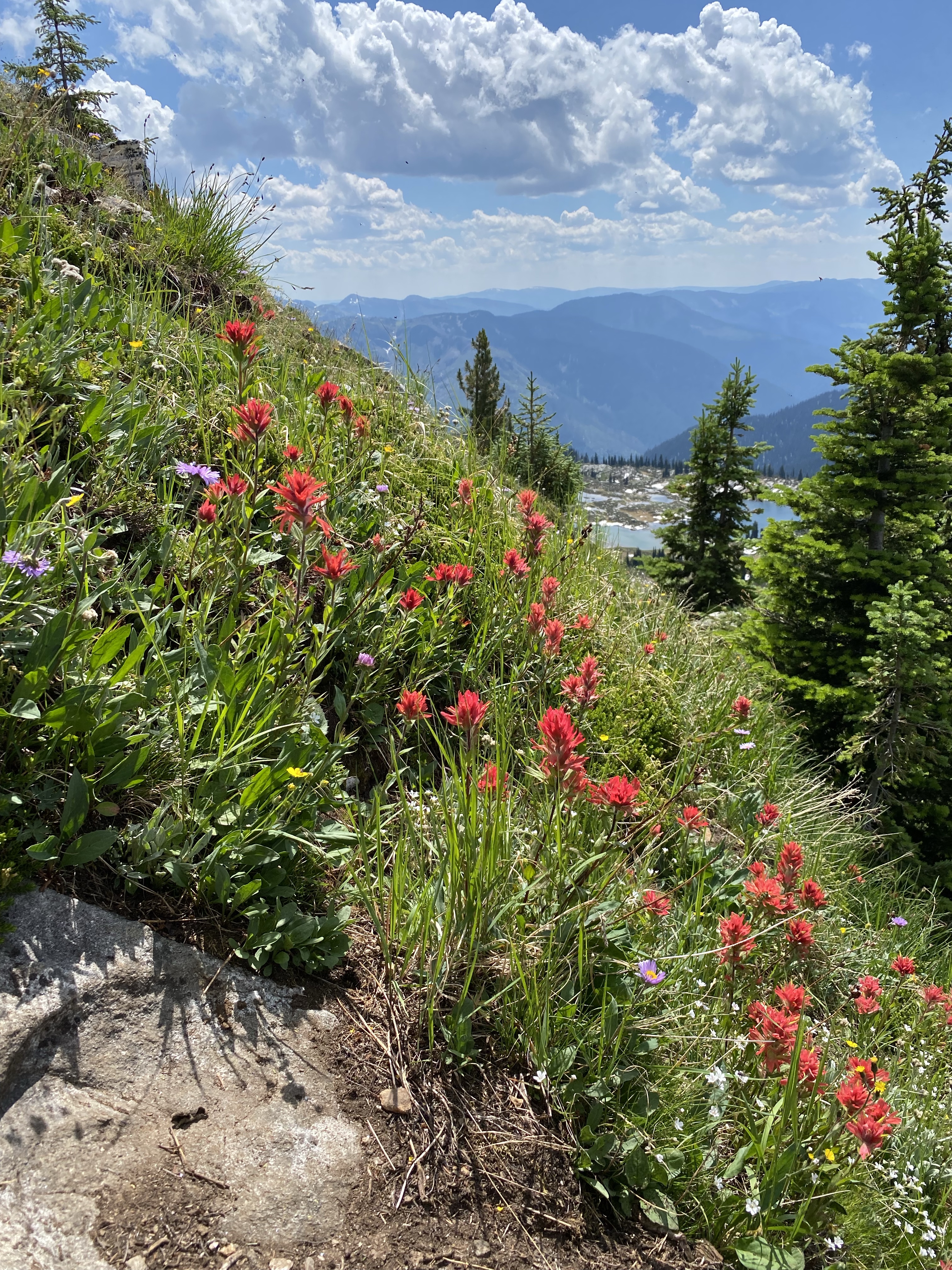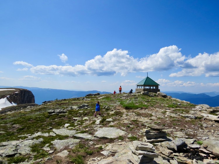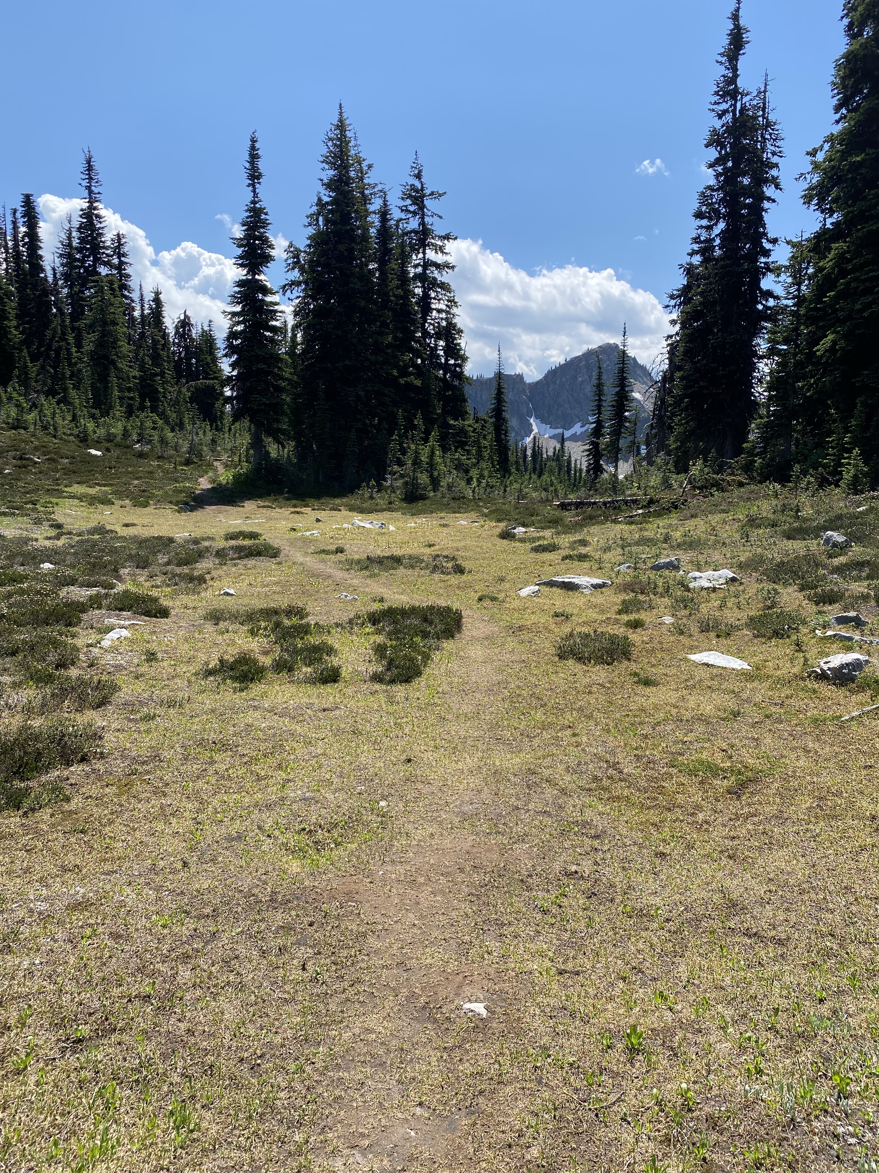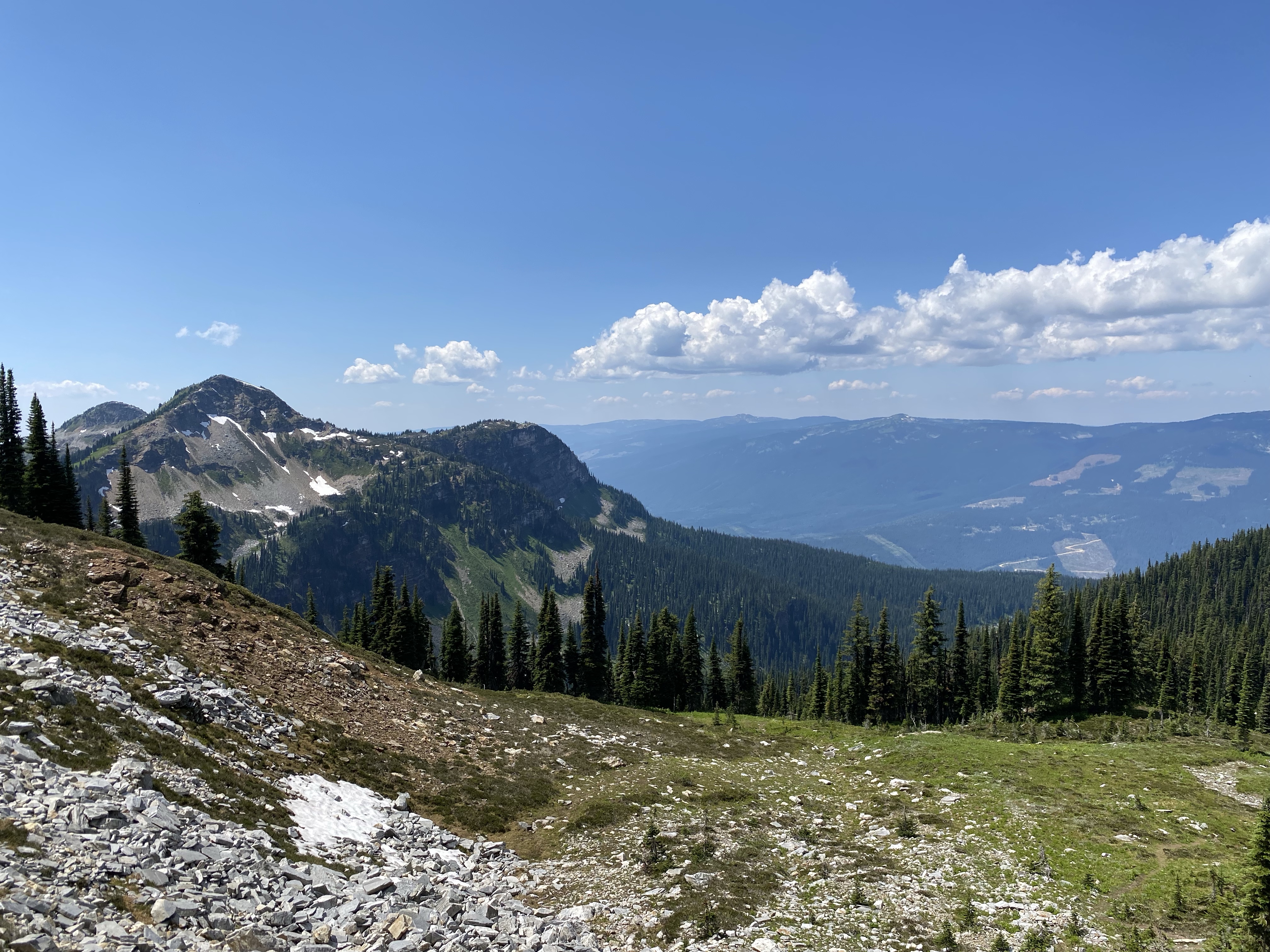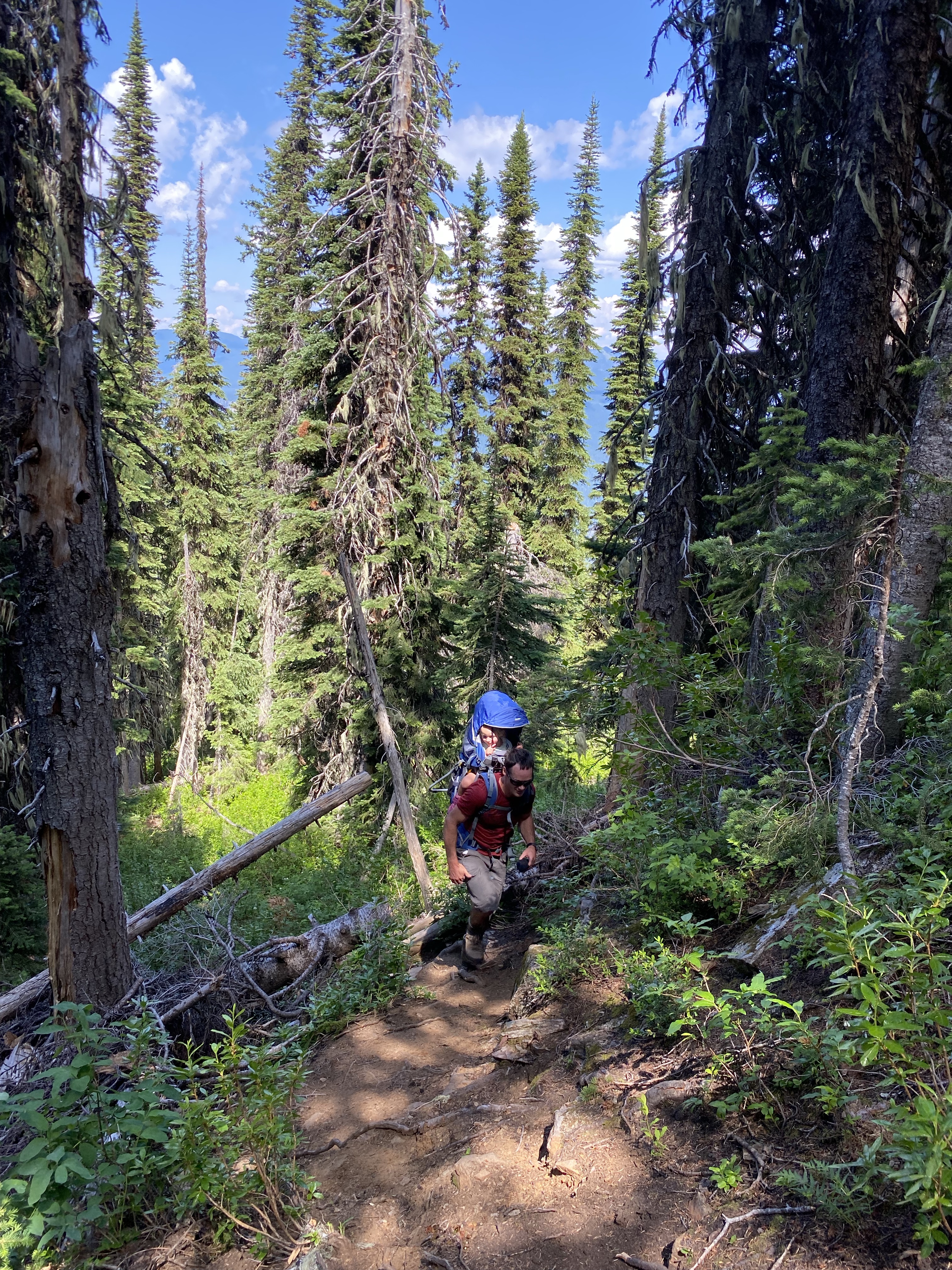 This slight change of trail was a perfect chance for the girls to run loose and give us a break with the weight for a bit. We were now teetering on the edge of the tree line so the views were starting to surface. As we passed through the clearing we found a flat rock that had us looking back over the Mable Lake valley to where we could enjoy lunch with some amazing views.