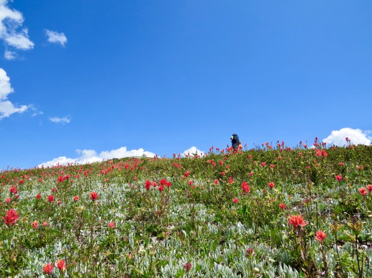 At this point we were about 2 hours in and 500 metres of elevation gain; just a little over half way. We were all refueled and feeling great to push on. The trail now looses a bit of distinction. There is a few rock carins that show some indication but basically you just climb up. We had a couple rocks section, some snow patches and an dazzling display of colourful wildflowers through the low growing shrubs. Once you cross into the alpine the vegetation is highly sensitive. With the unmarked paths we did our best not to destroy any of mothers natures rarely seen beauty.