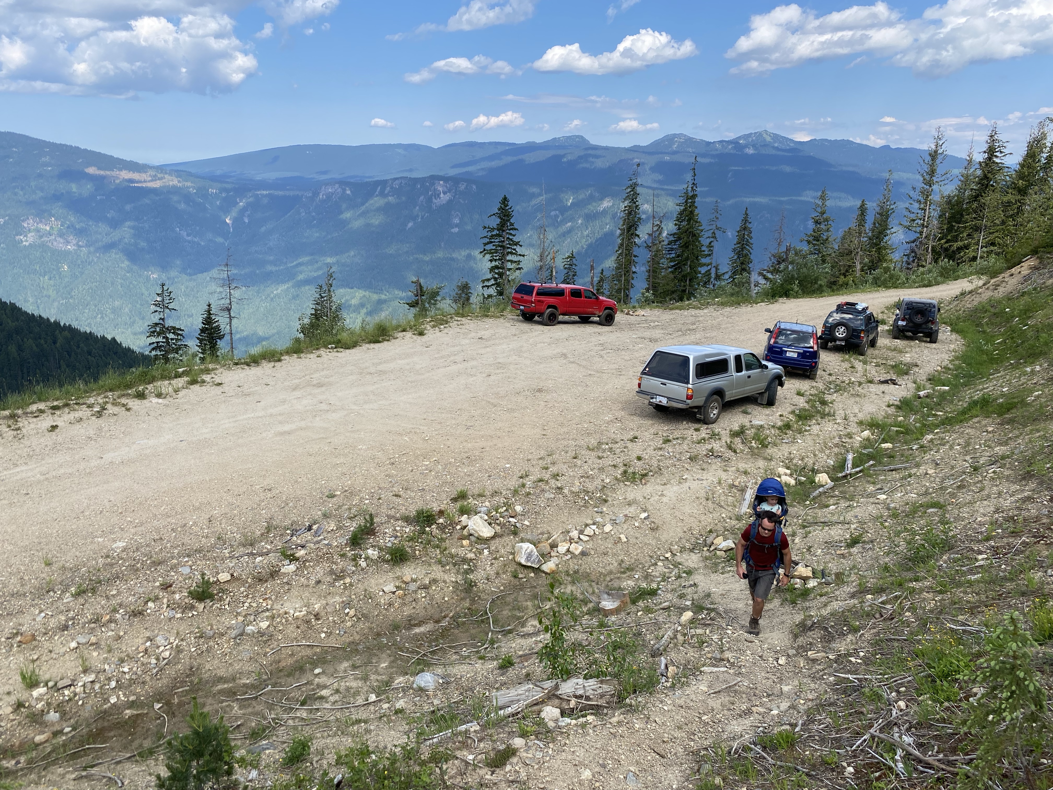 Alarms rang at 6 o’clock and we scrambled to get out of the house by 7. Come 7:30 am the tires were turning. The drive took us north east along the shores of Mara Lake and past Sicamous. Onward through Malakwa, further than the last spike at Craigellachie, then Some hot pools at Crazy Creek. 21 kms west of Revelstoke hosts the turn off onto the gravel and up Wap Lake Forest Service Road (FSR). By 10:00 we reached the trail head after 16.6 kms of unsigned driving. With a short snack along with sunscreen and bug spray we were then on our way around 10:30.