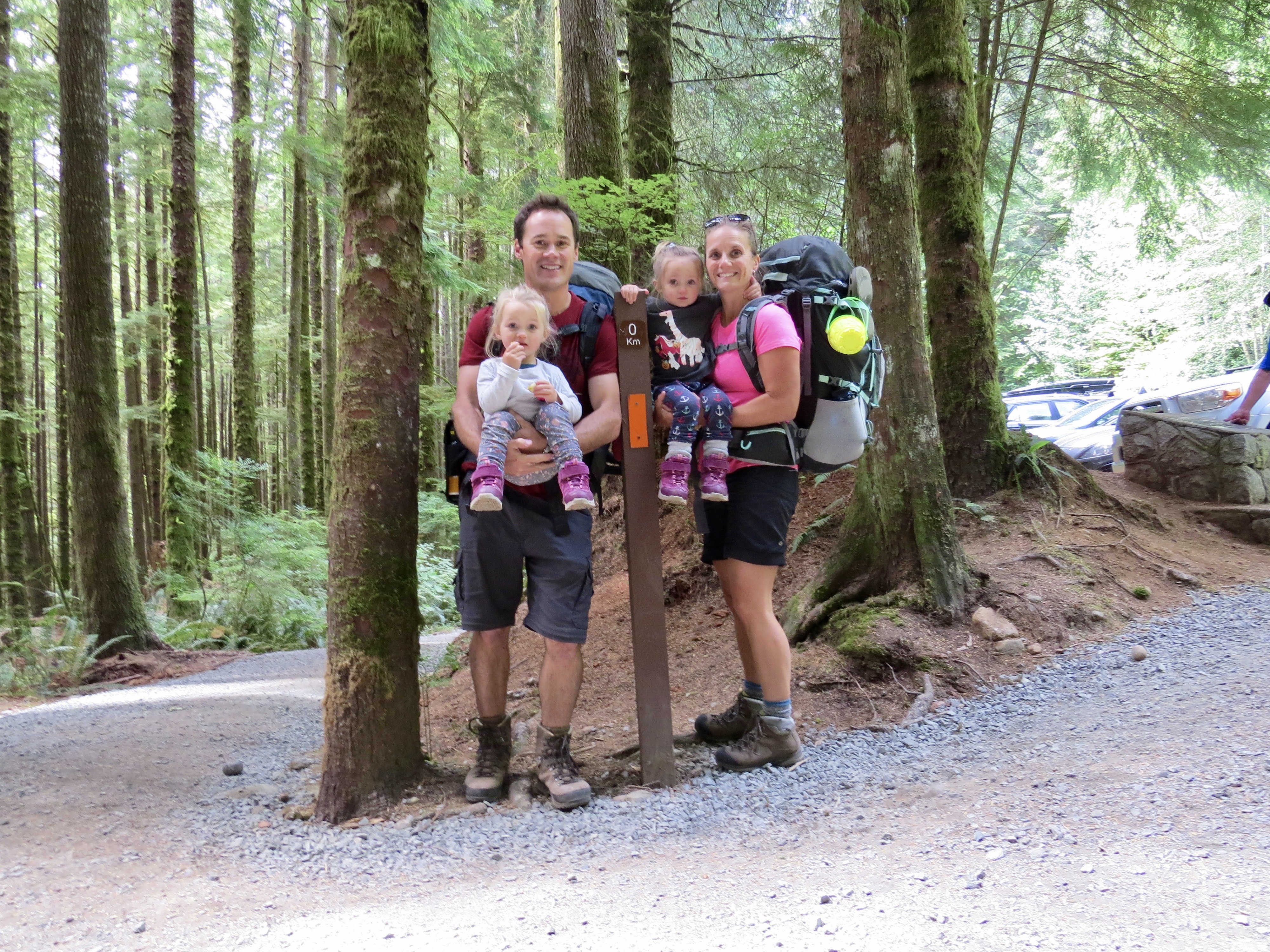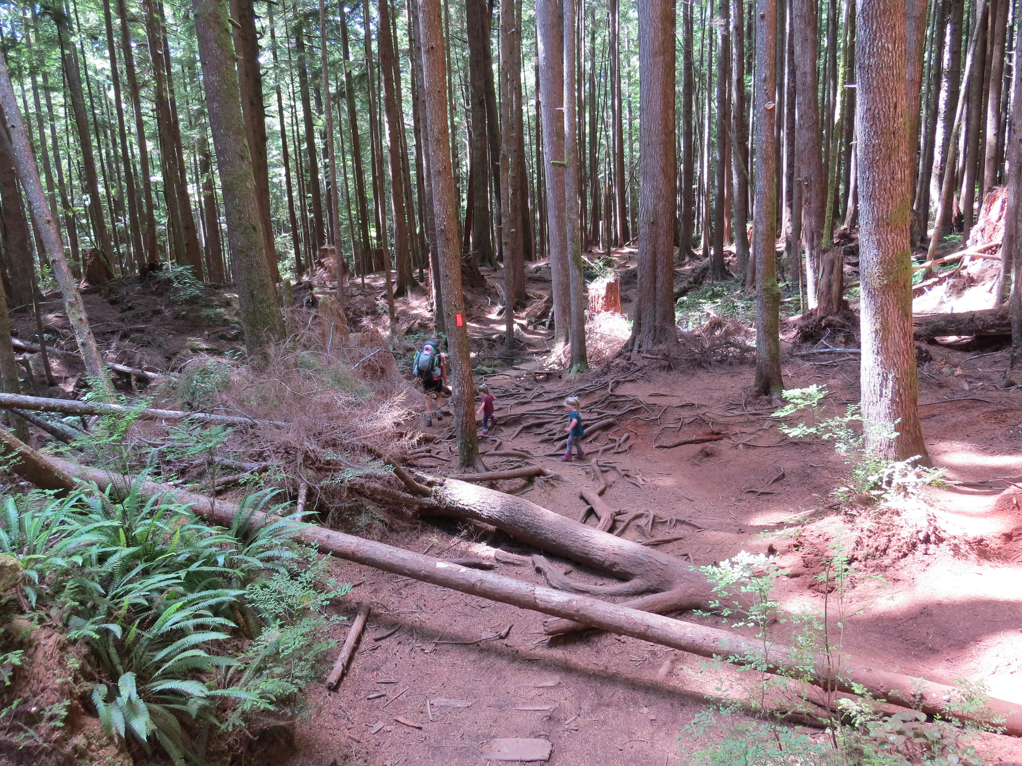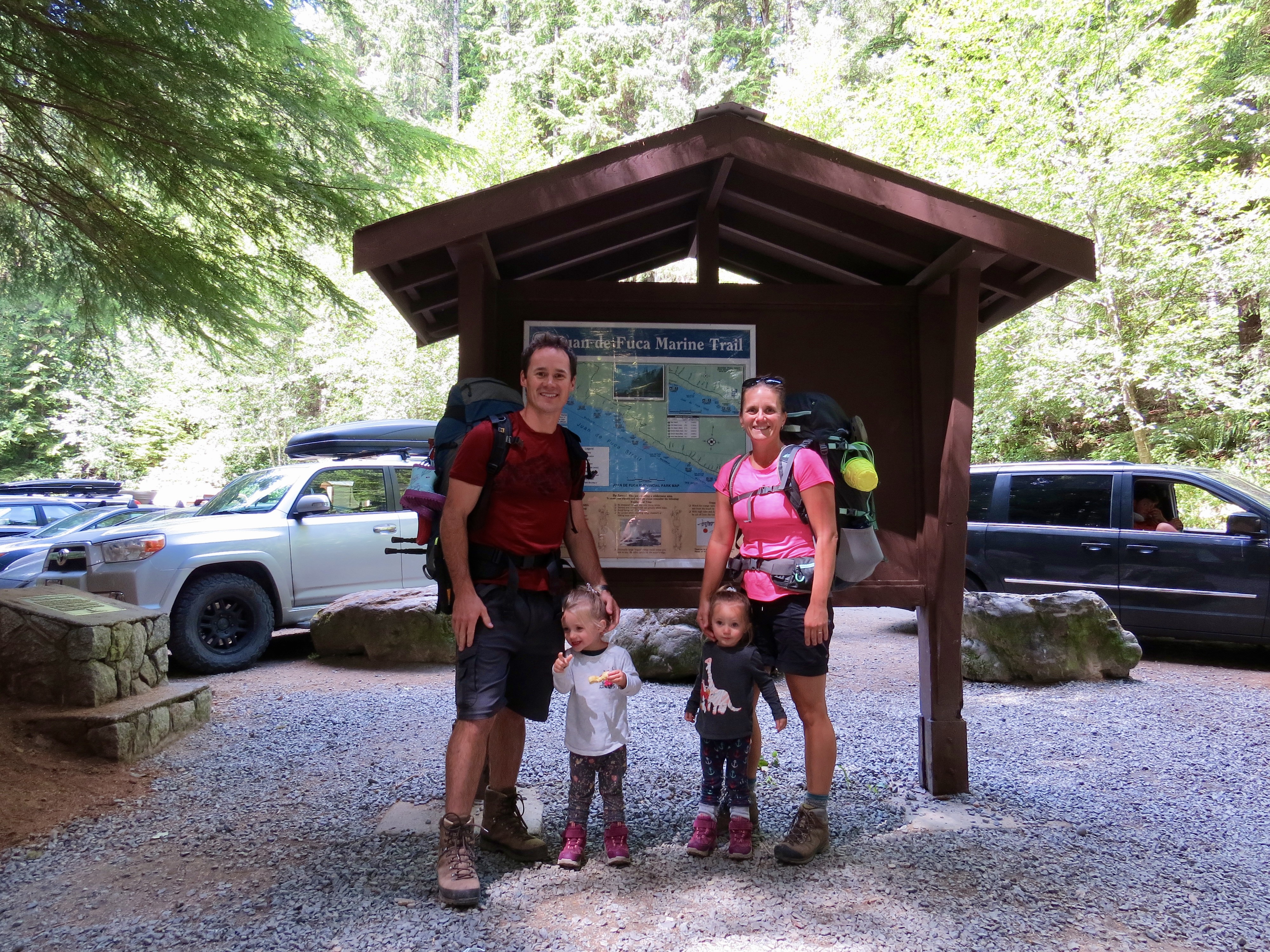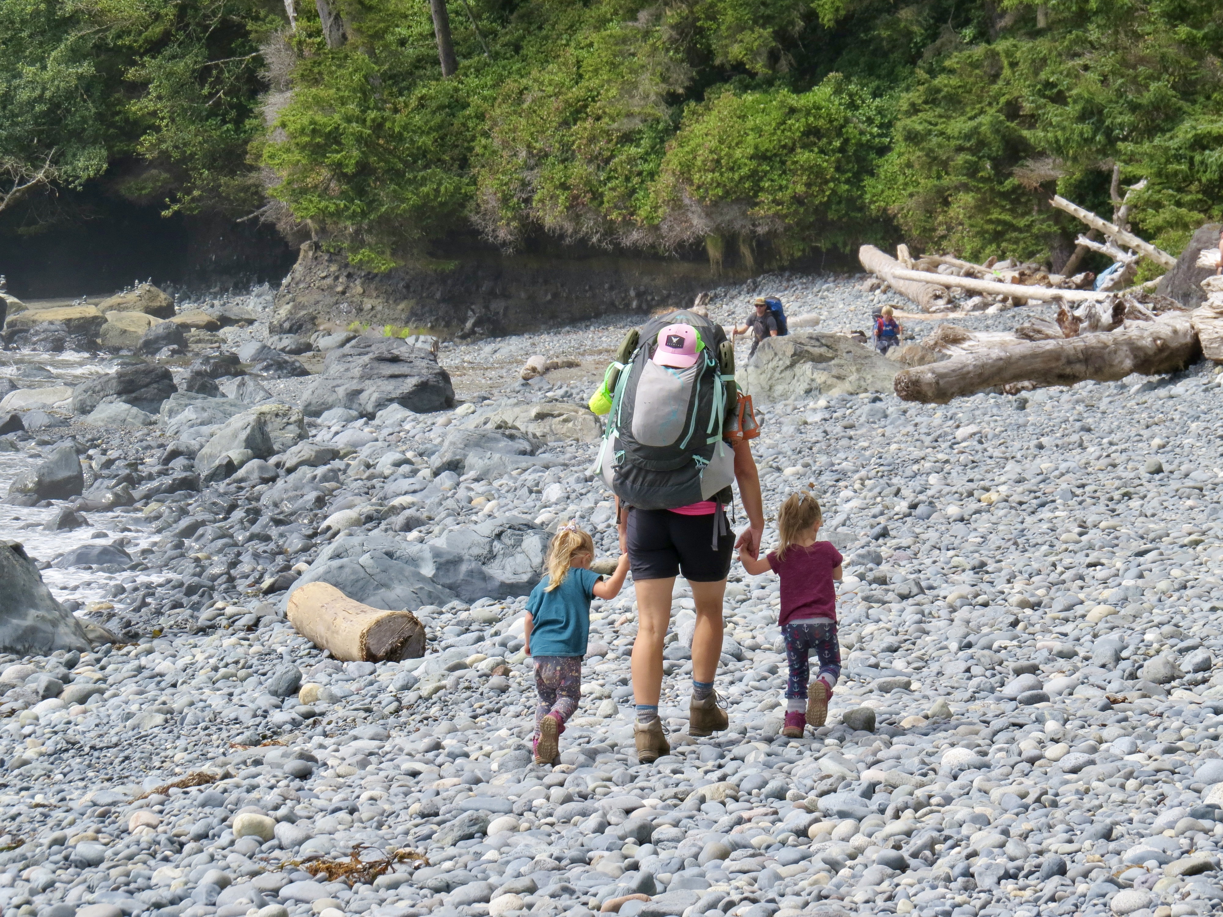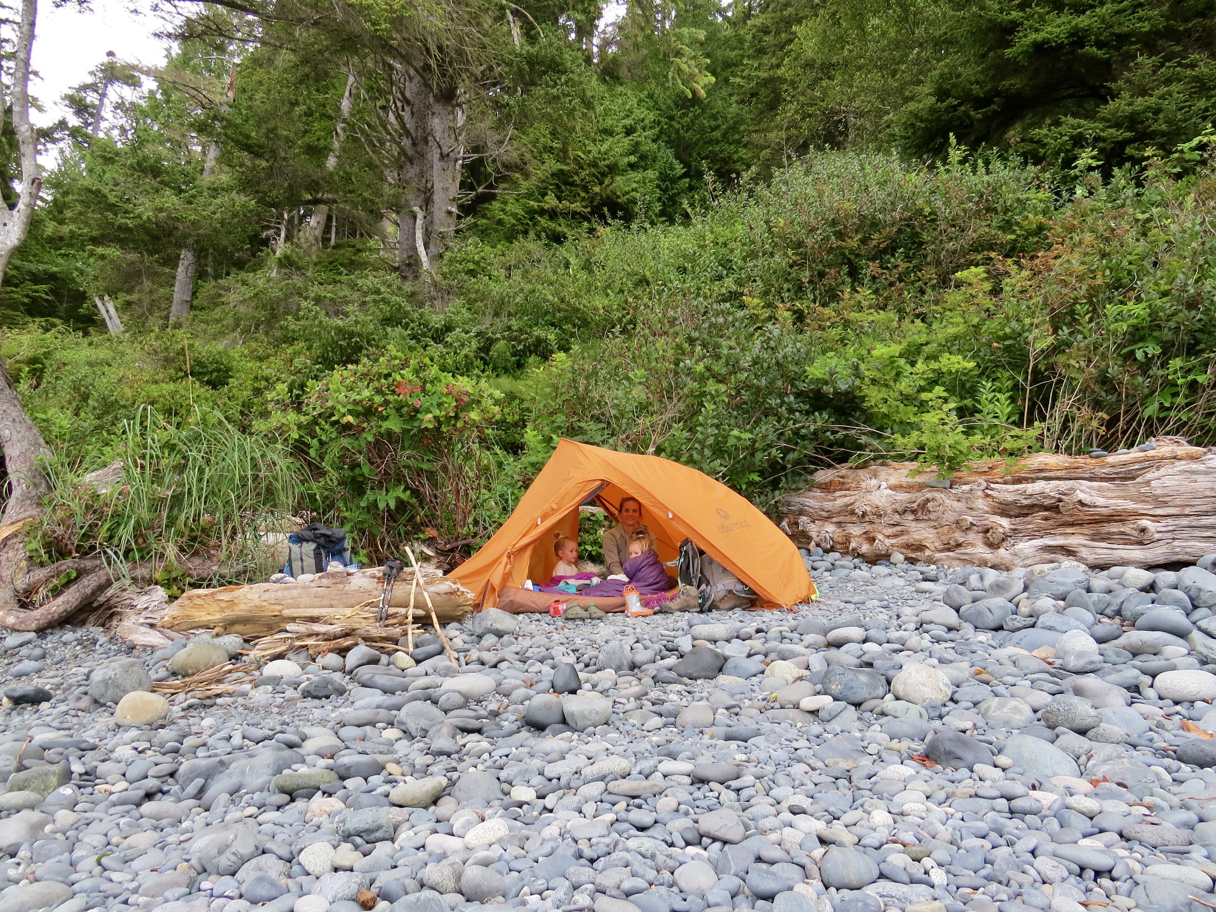 After slipping into the last parking spot shortly after 1:00 we efficiently laced up our boots, loaded the packs and headed for the trail. A 0km marker indicated the start and we were excited to anticipate those numbers climbing all the way to 47 in a few days’ time. The trail here is very popular, very. After paying our camping fees the girls started out on foot as we casually made our way down the path. The route was very obvious and rather easy to maneuver through. It was a little bit challenging for our three year olds as there were many large roots exposed from the giant hemlock and cedar trees in the area. This made for some slow moving as the girls picked their way down the line. Just over one kilometre in we came across the first suspension bridge. The little ones quickly wanted to gain some speed and bound their way to the other side. The trail casually undulated up and down a few times from the start then once over the bridge we began our descent of around 100m down to Mystic Beach and the location of our first night on the trail. The 2km section took us around an hour and the twins walked every part of it. We easily found a place to set up the tent and get some snacks on the go.