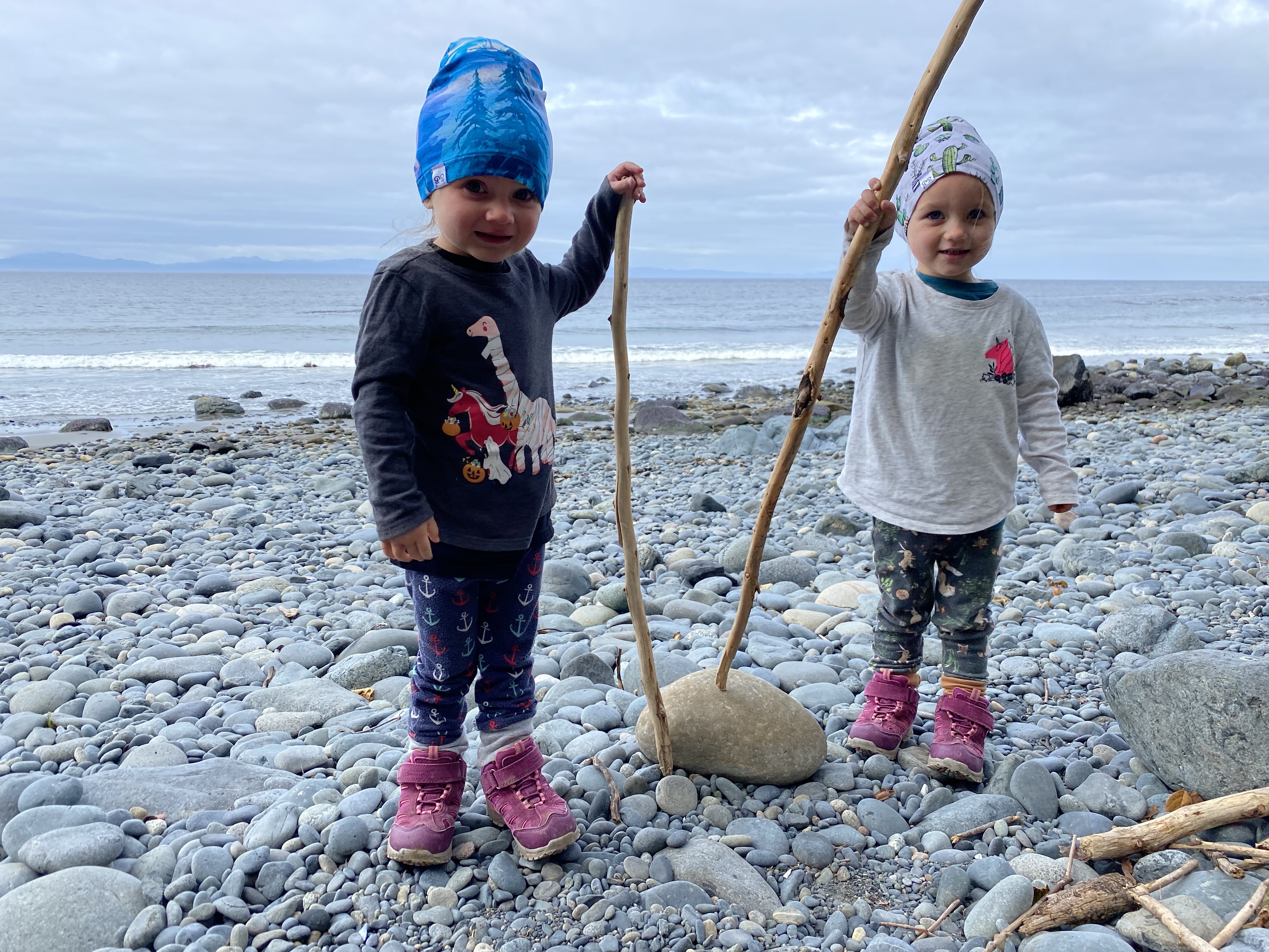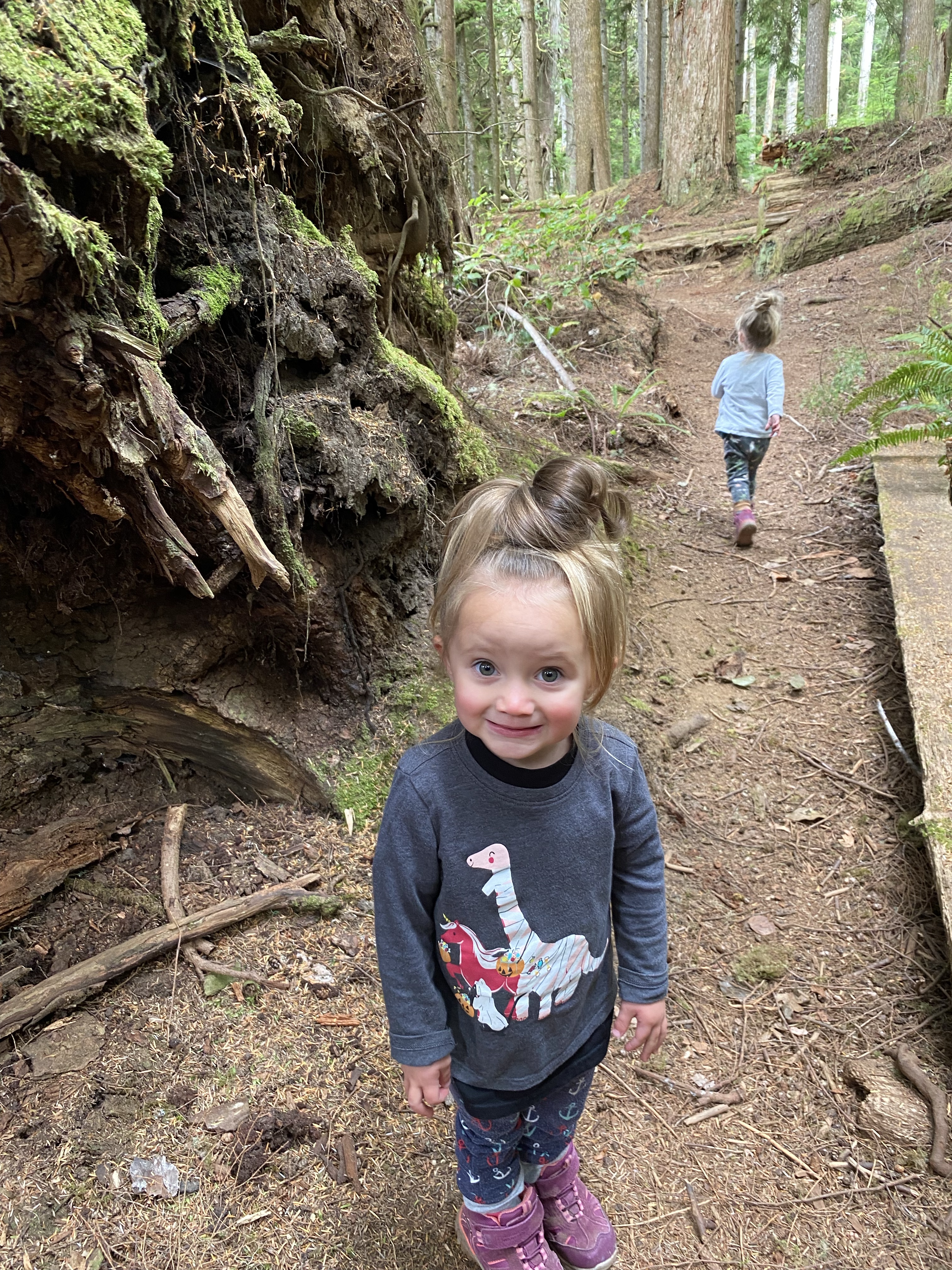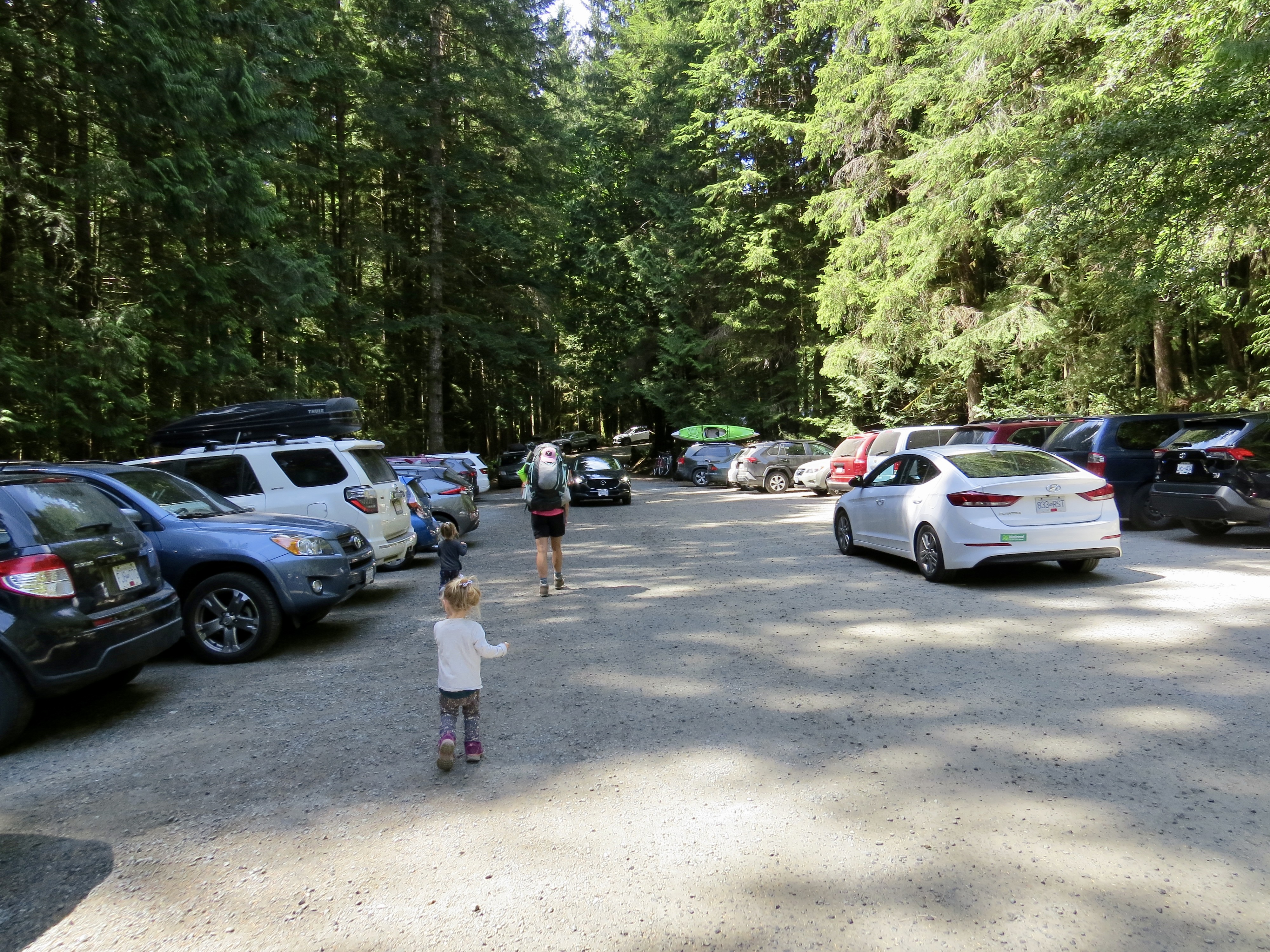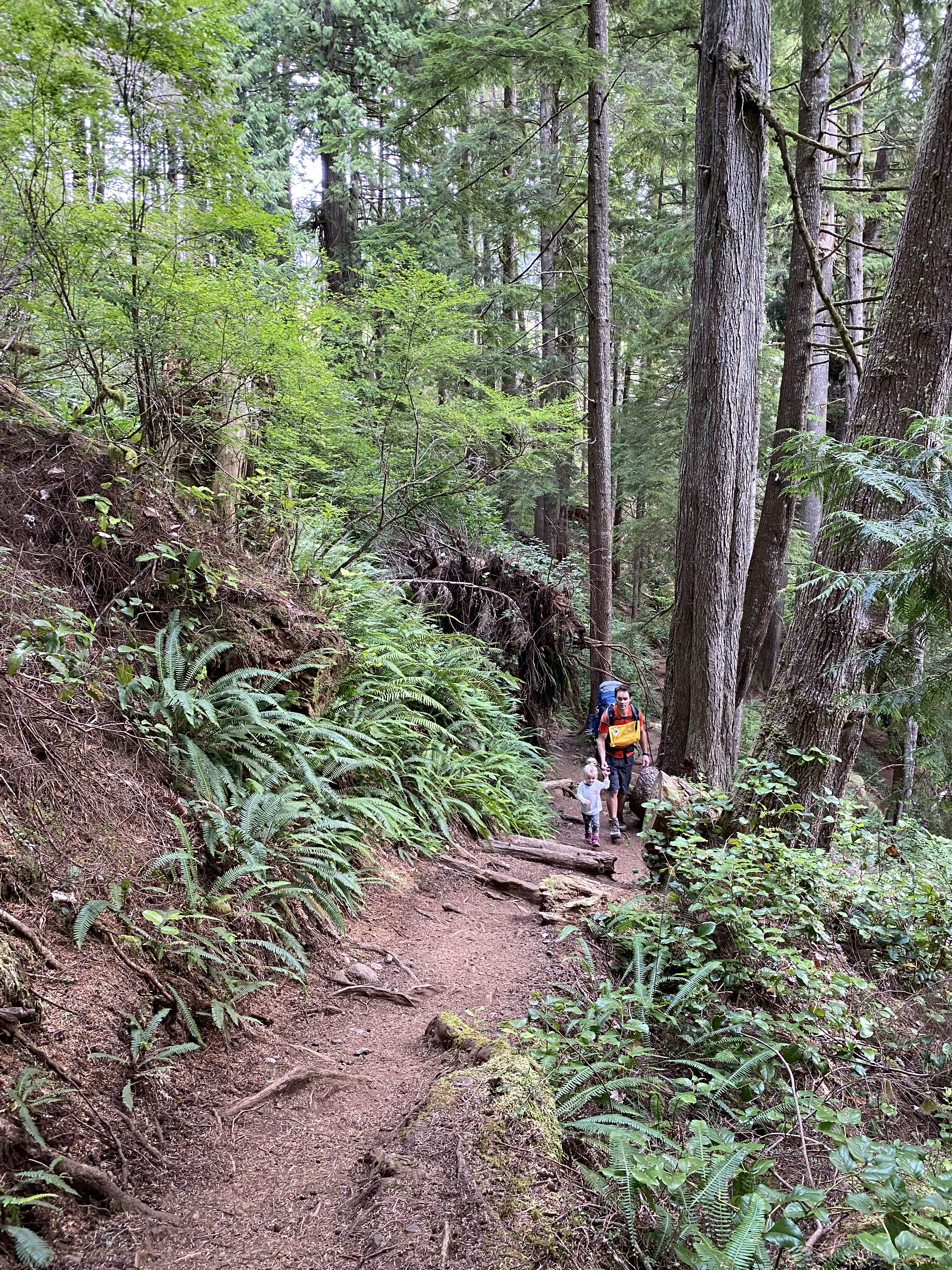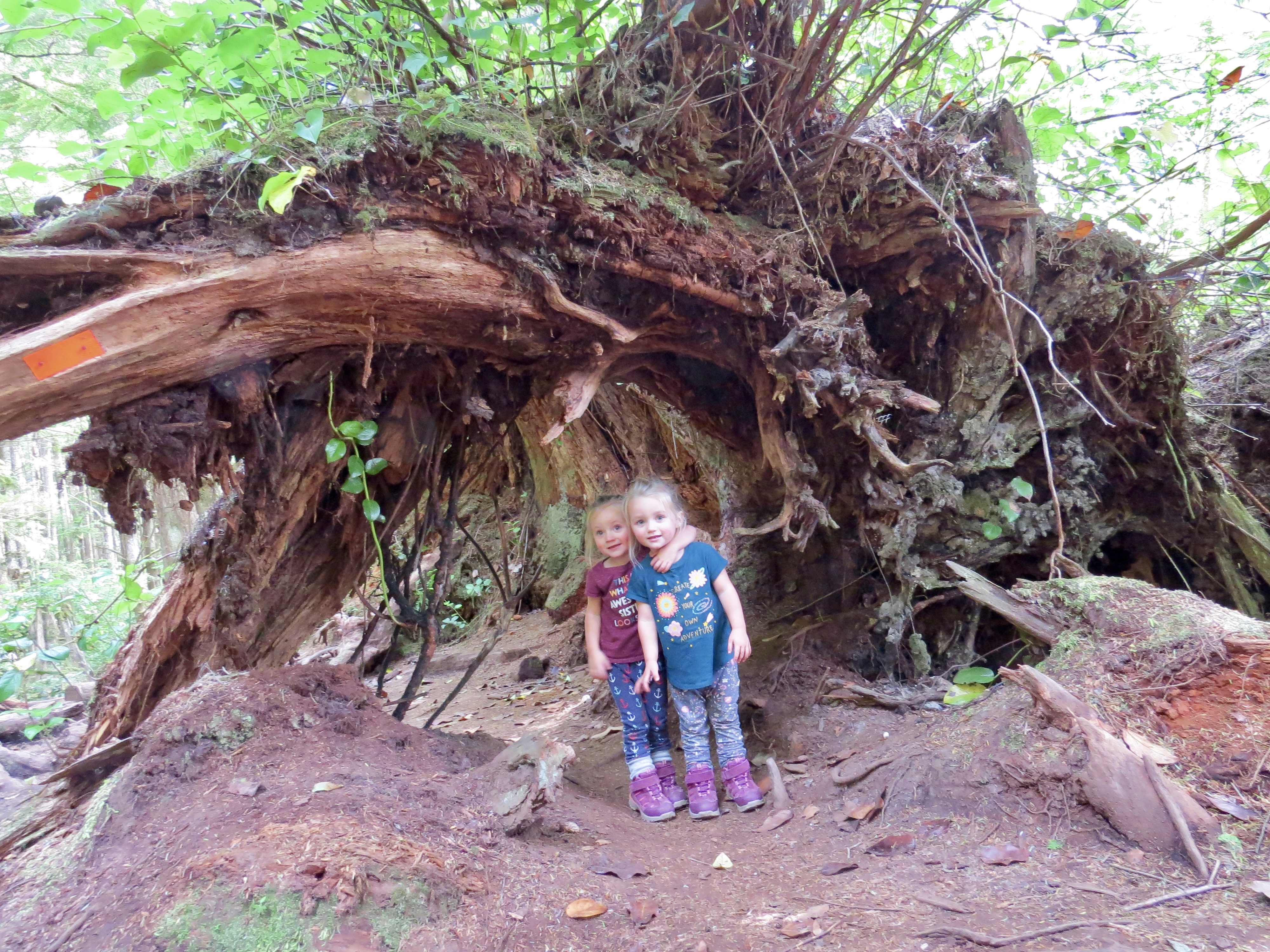 After slipping into the last parking spot shortly after 1:00 we efficiently laced up our boots, loaded the packs and headed for the trail. A 0km marker indicated the start and we were excited to anticipate those numbers climbing all the way to 47 in a few days’ time. The trail here is very popular, very. After paying our camping fees the girls started out on foot as we casually made our way down the path. The route was very obvious and rather easy to maneuver through. It was a little bit challenging for our three year olds as there were many large roots exposed from the giant hemlock and cedar trees in the area. This made for some slow moving as the girls picked their way down the line. Just over one kilometre in we came across the first suspension bridge. The little ones quickly wanted to gain some speed and bound their way to the other side. The trail casually undulated up and down a few times from the start then once over the bridge we began our descent of around 100m down to Mystic Beach and the location of our first night on the trail. The 2km section took us around an hour and the twins walked every part of it. We easily found a place to set up the tent and get some snacks on the go.