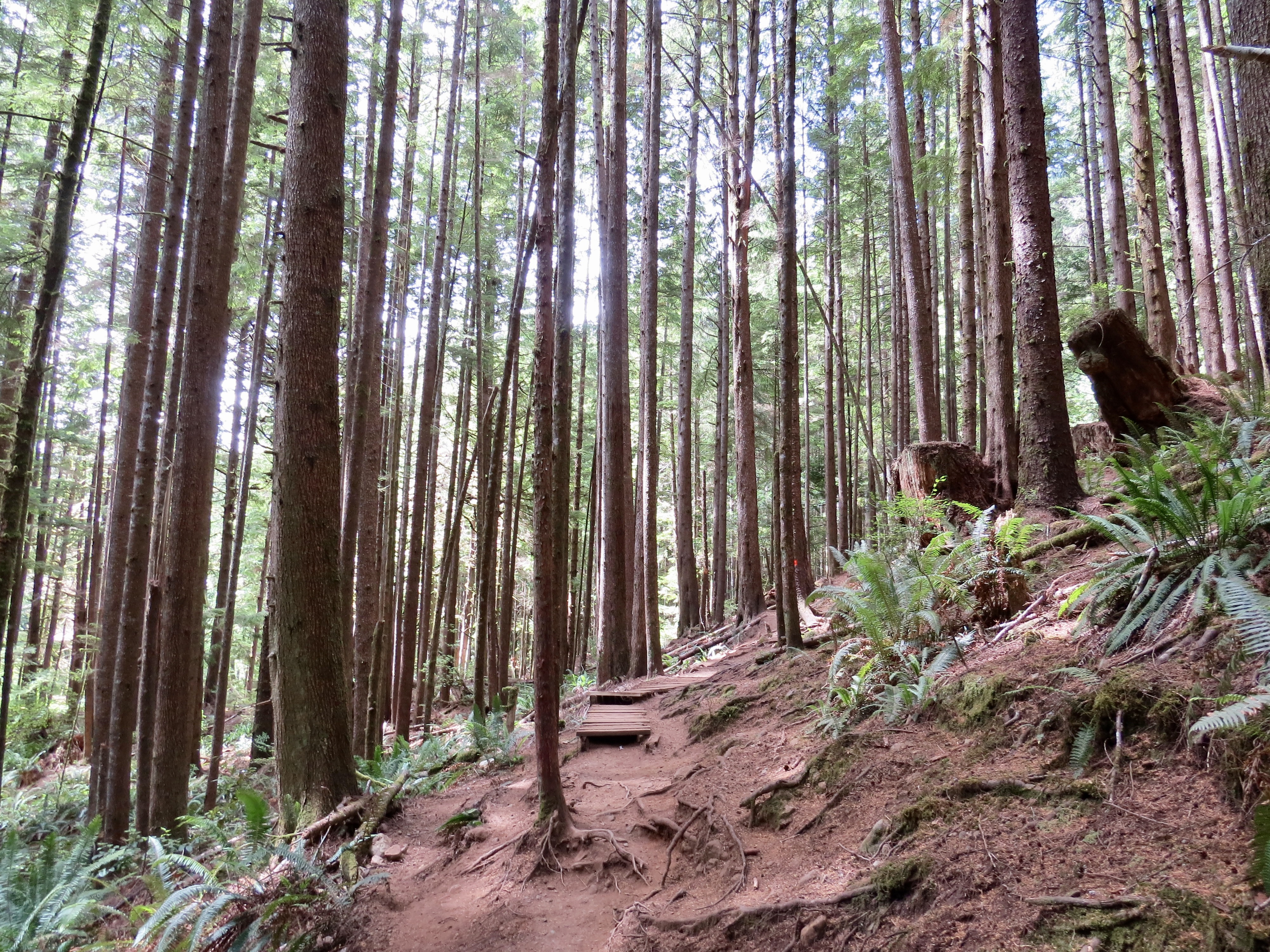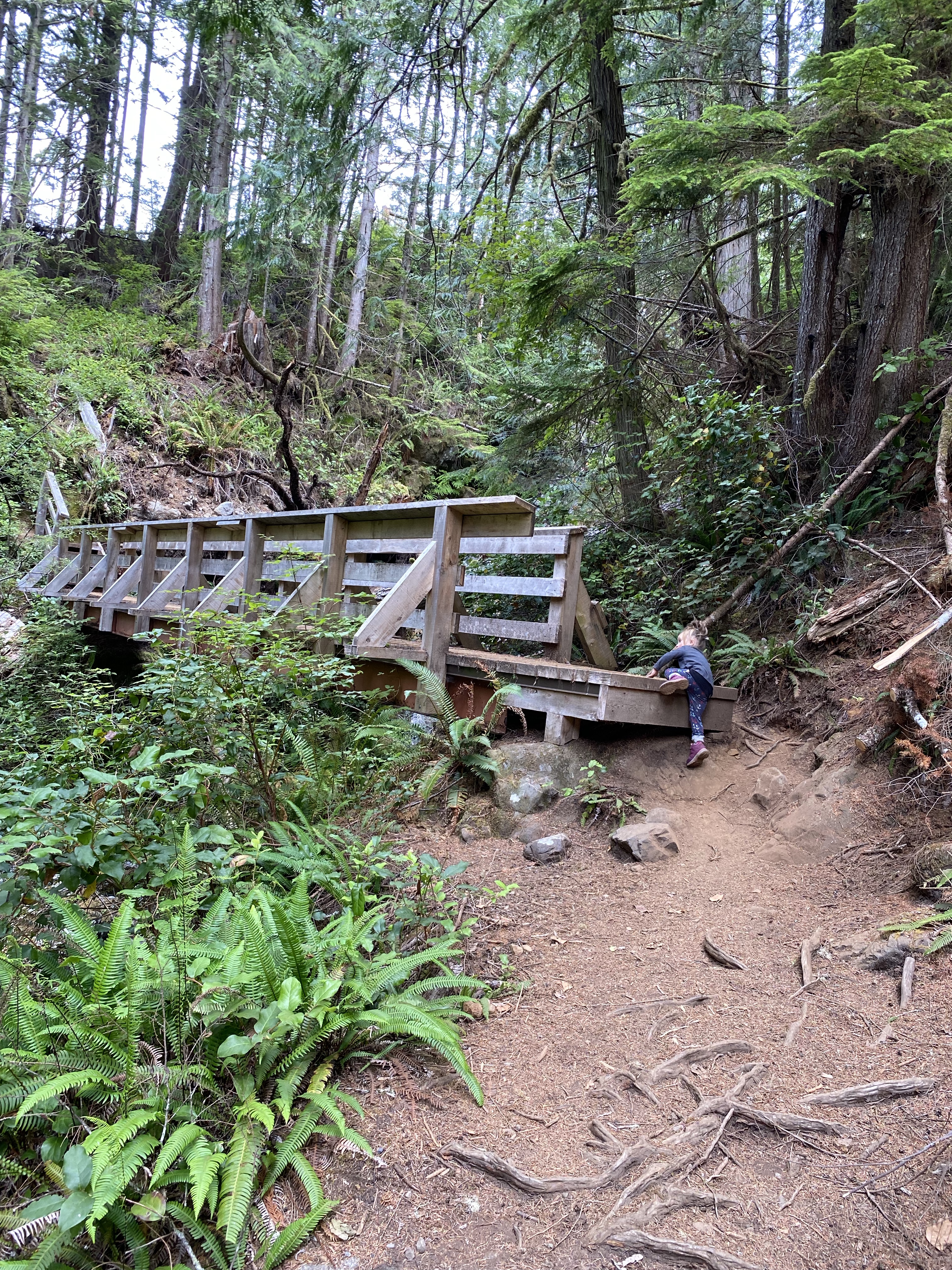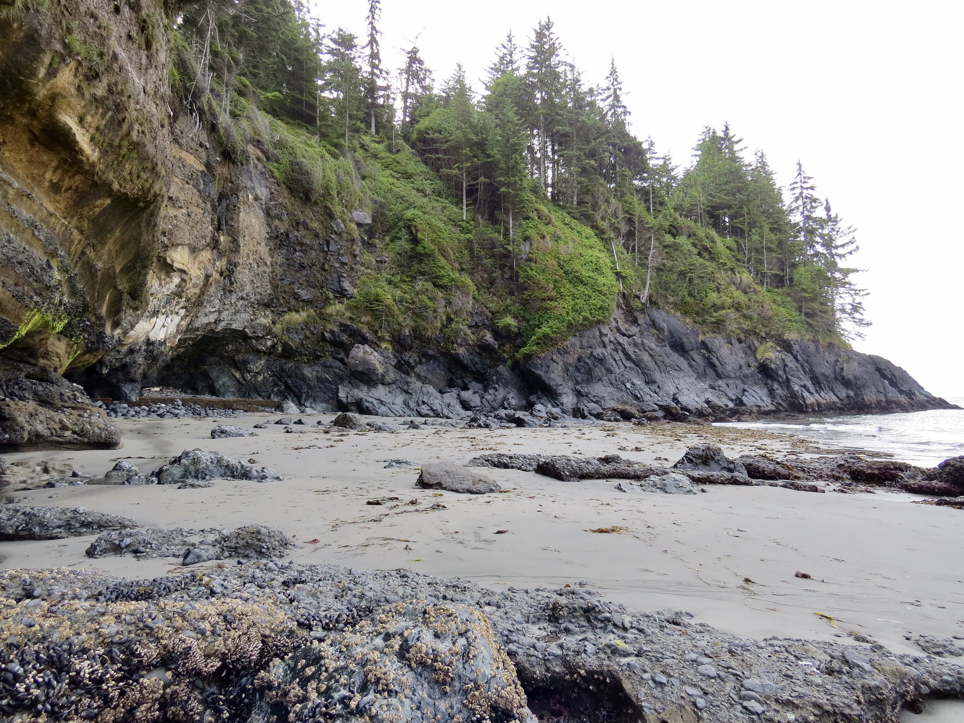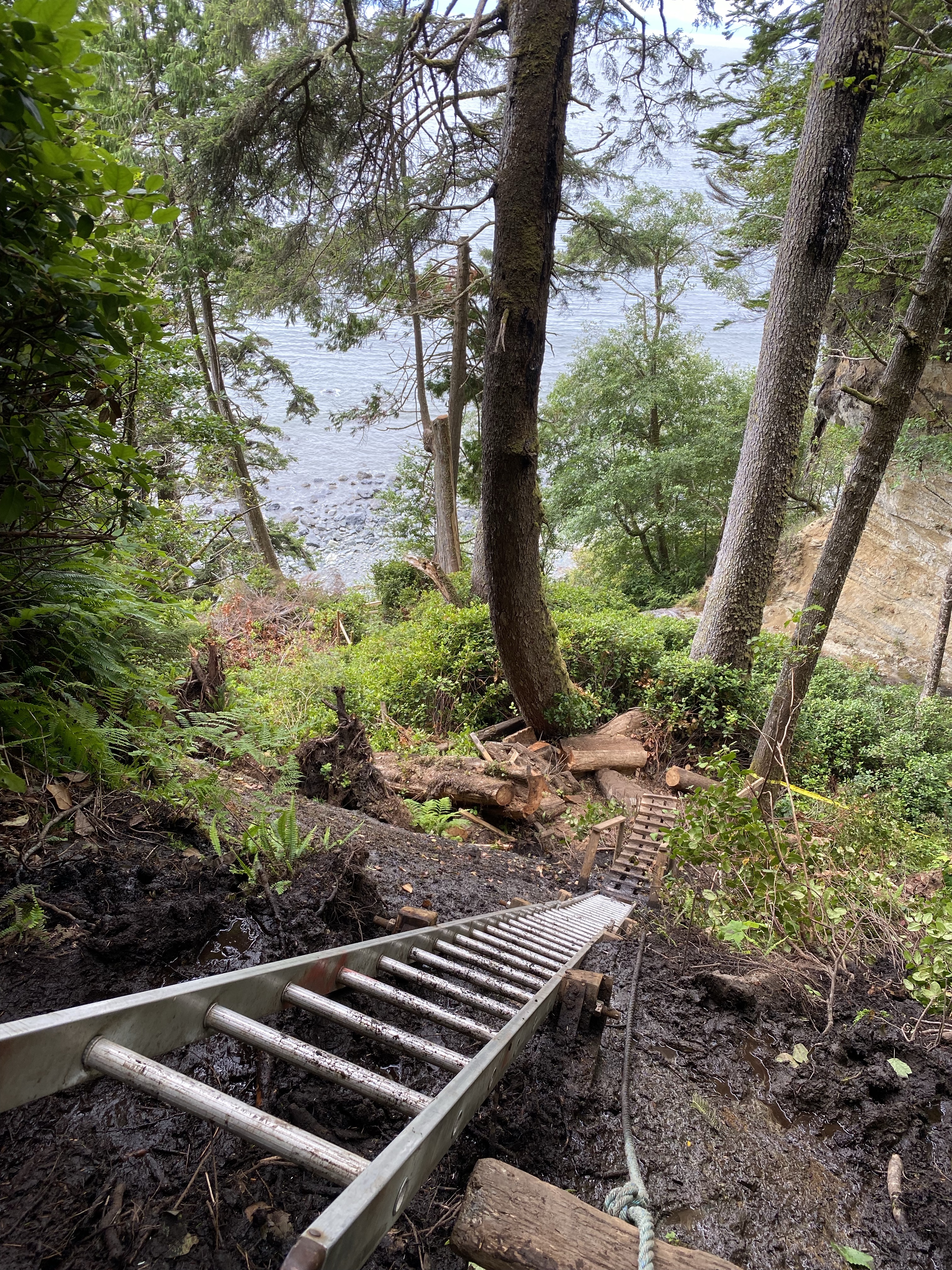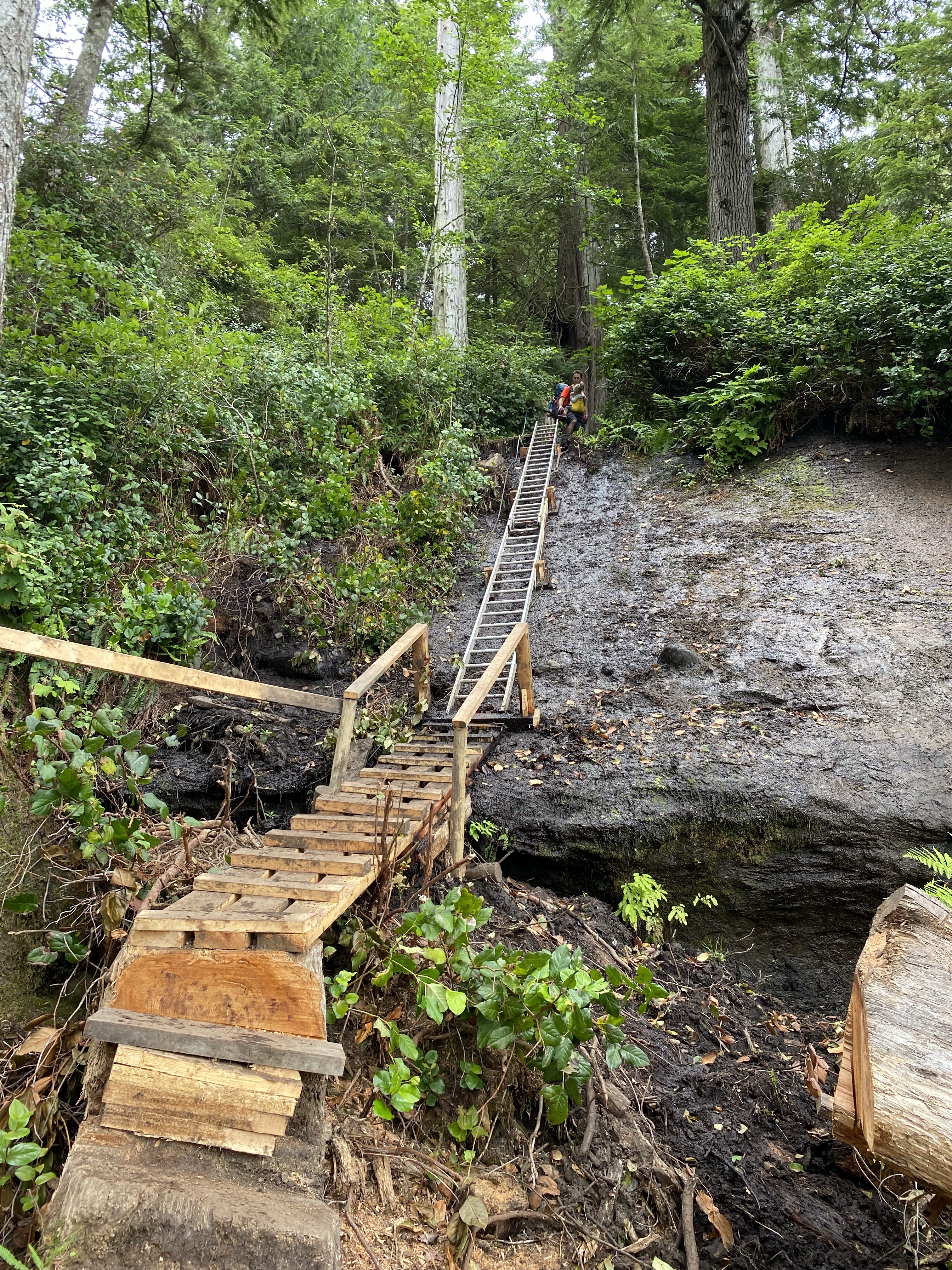 The coastal scenery was much different than our usual mountain hiking we do in the interior and as we were not in any pack pain we had time to enjoy the nature. In some situations you meander to view points with outstanding vistas of the ocean and the rocky coast you are avoiding by being at elevation. There are numerous sections where fallen trees have been modified as paths to keep you out of the mud. Other places where you just have to forge on through it. Throughout the day we would climb up hills and down into often dry creek beds. After 6 of these peeks and valleys it spits you out at the beach. Just before that however, at the 7.5 km mark, you are left with one last obstacle. A mud slide earlier this year wiped out a section of the trail and all the trees and logs that help you with your descent. Now the park crew has anchored an aluminum ladder to the side of the bank for an easier and safer drop down to the rocky Bear Beach shore line.