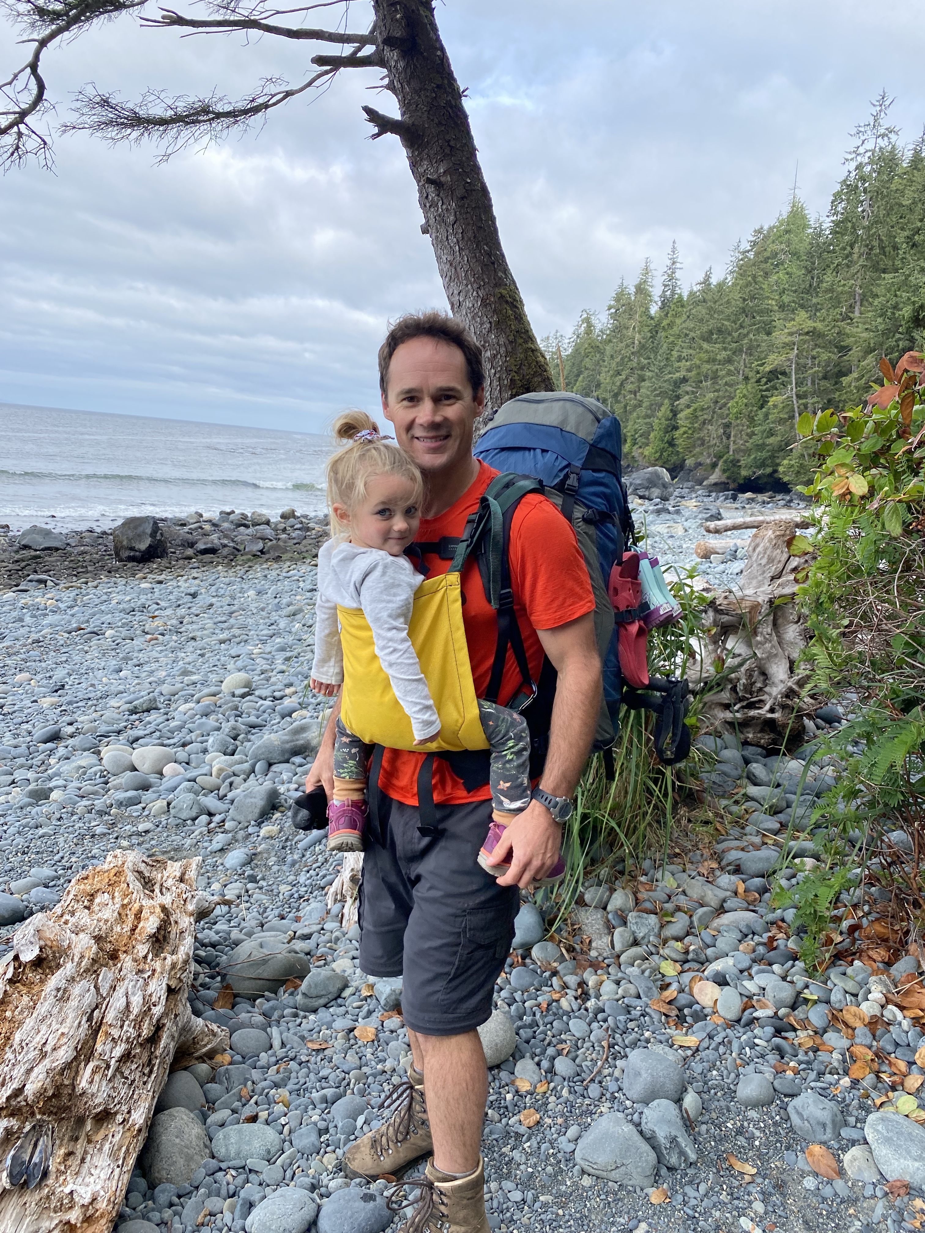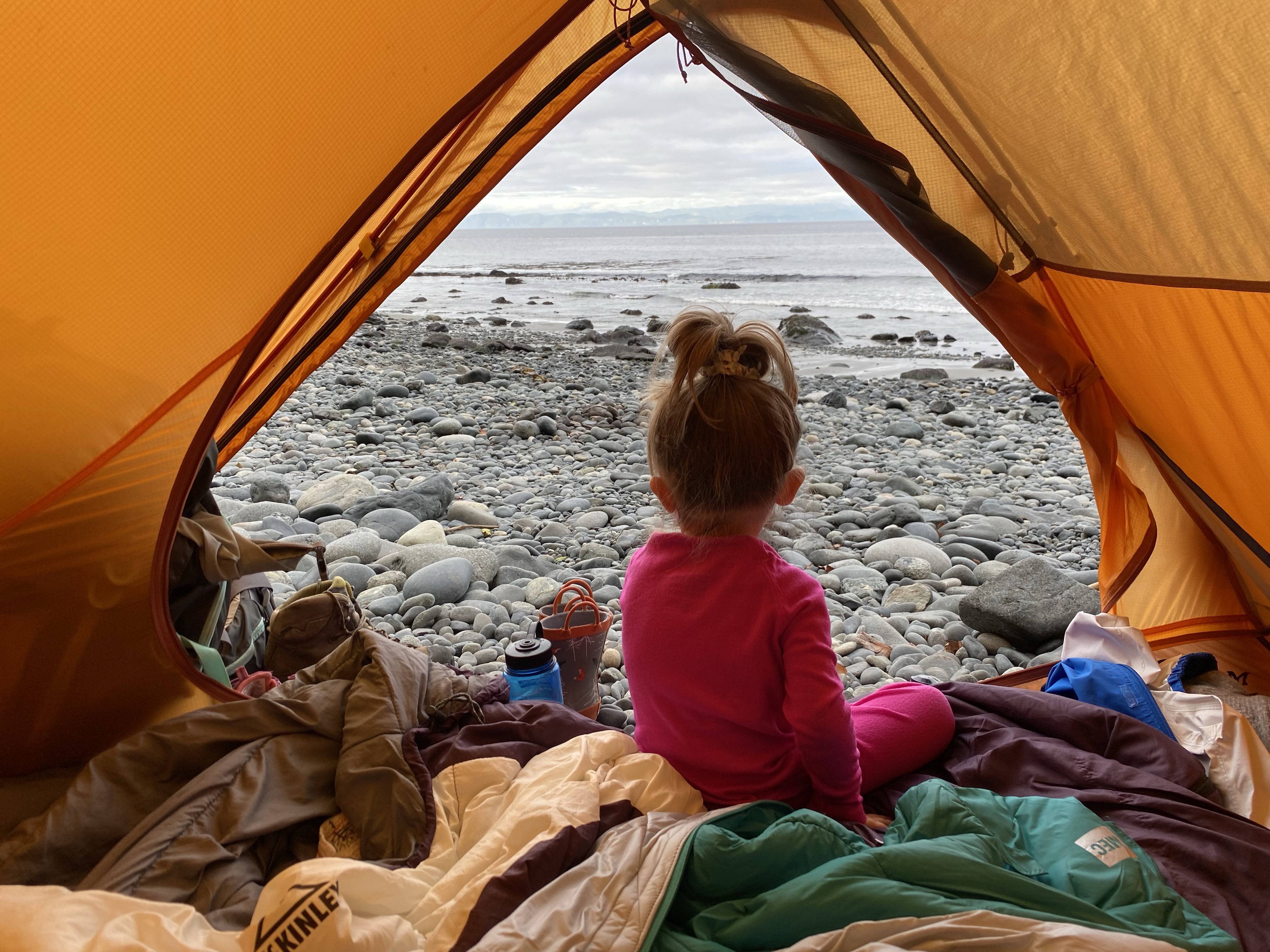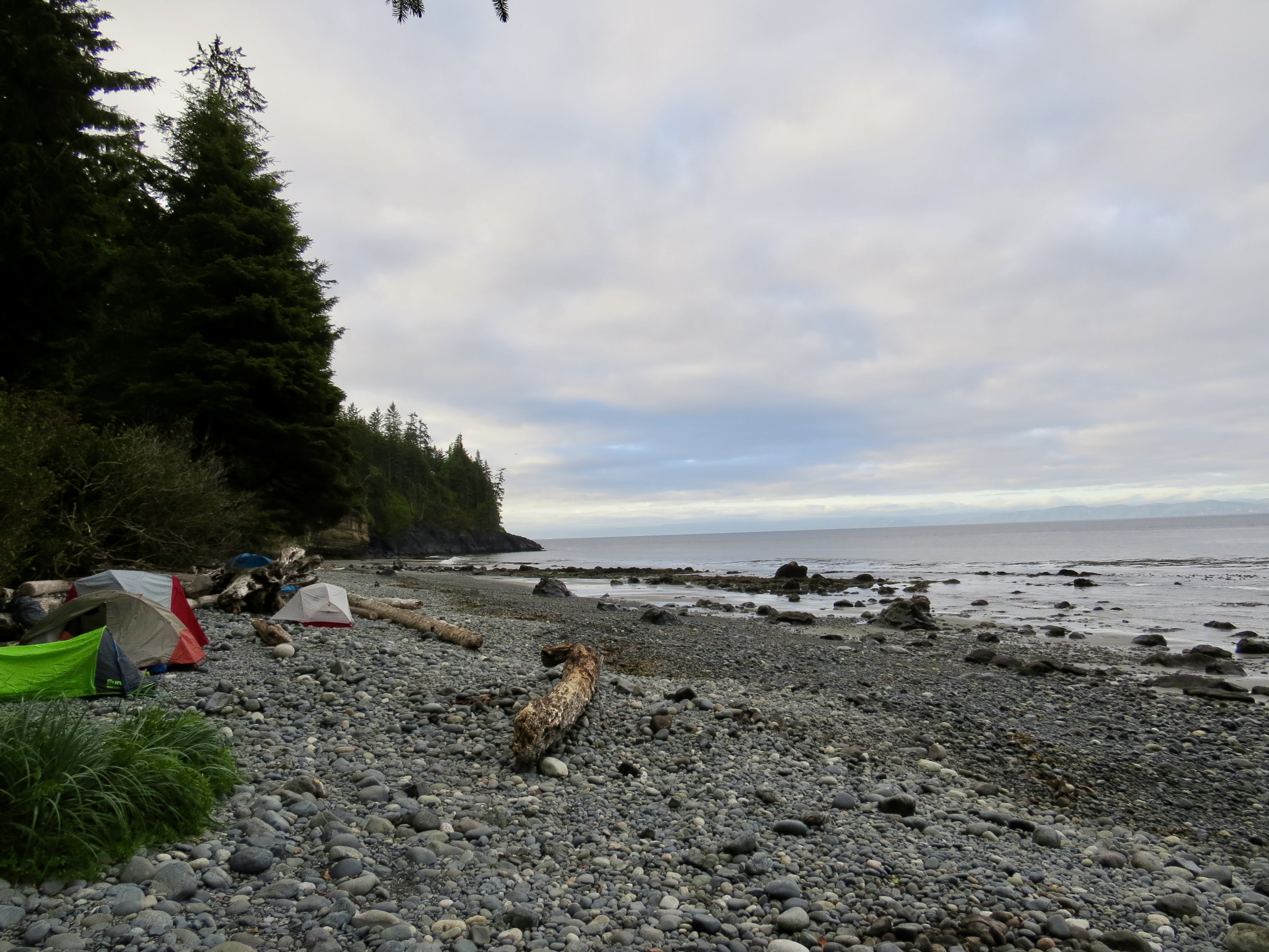 Rain in the area was lacking so this also maked drinking water a bit more challenging to get. Shannon did however find a small trickle that we could use once purified. With most of the day tourists gone by the late afternoon, Mystic beach was left to us to truly enjoy. We saw amazing waterfalls that would fall into the ocean with high tide. There was brightly coloured sandstone cliffs that had been eroded away over the years of weathering and small sea shells that the girls would collect with excitement. As the night crept on us so did the evening mist as we were soon covered in a blanket of fog. This was our sign to stow our food in the bear cache and settle into our tents for the night. China Beach parking lot is kilometre marker 0 and Mystic Beach is kilometre marker 2.