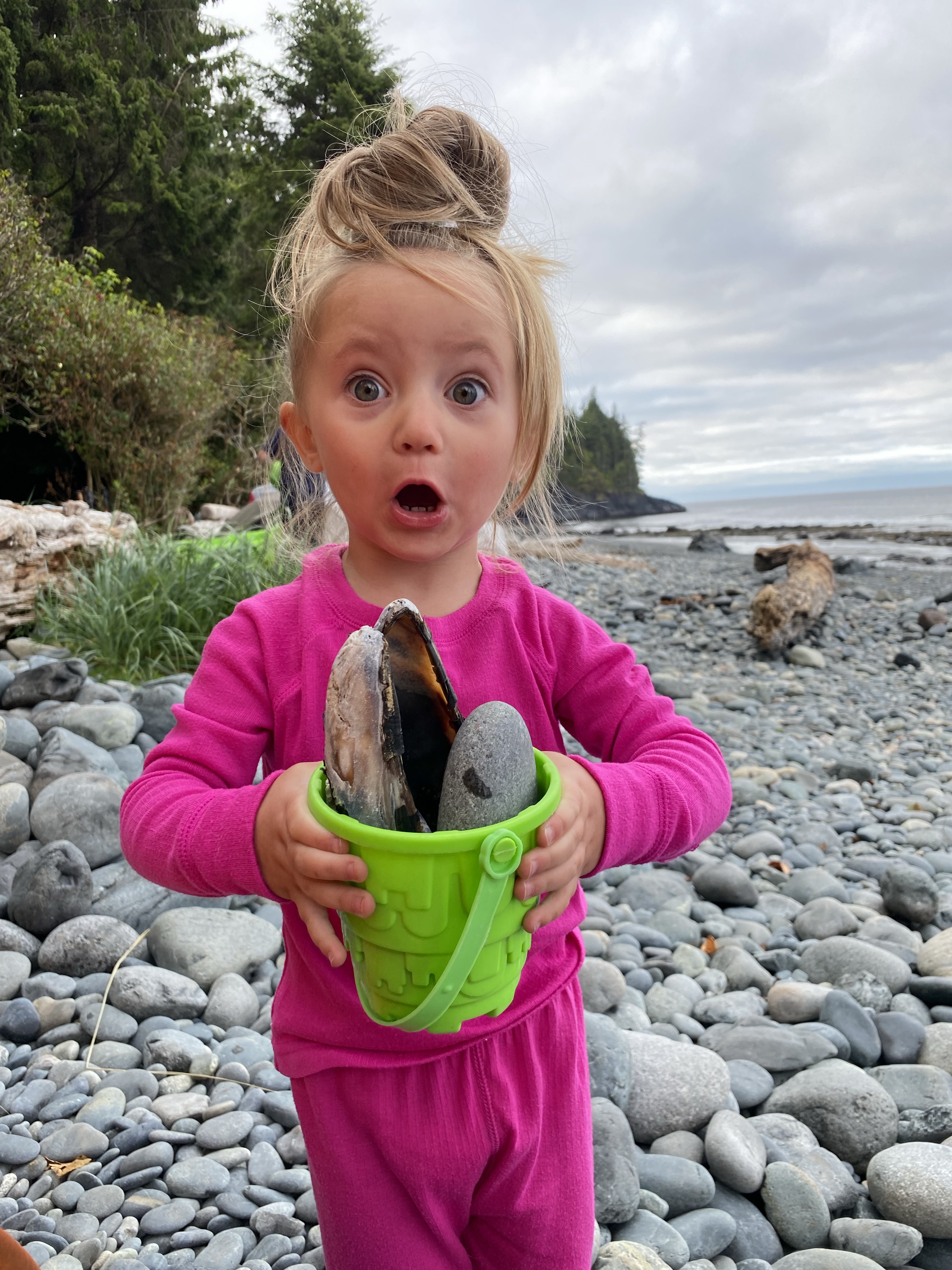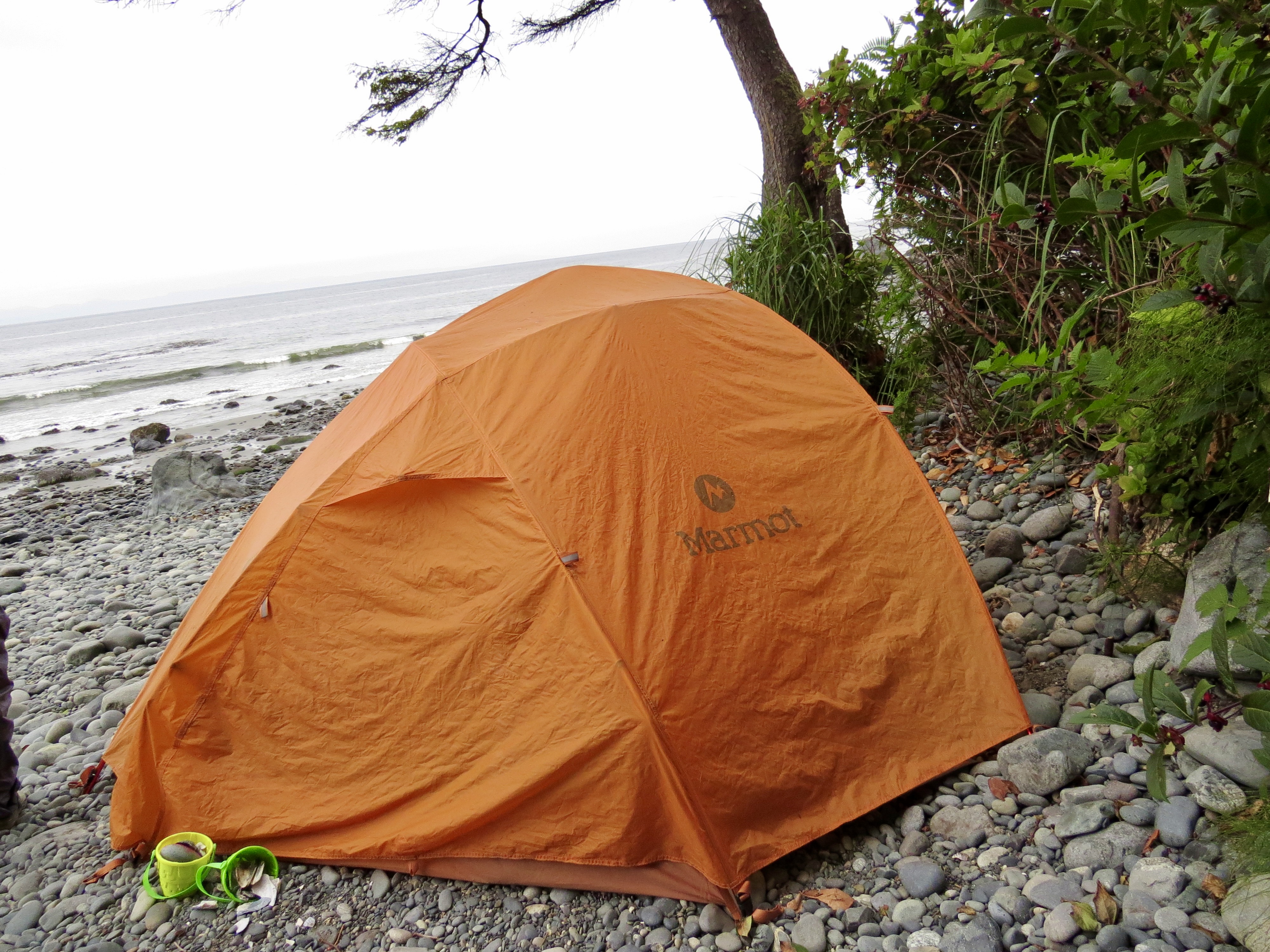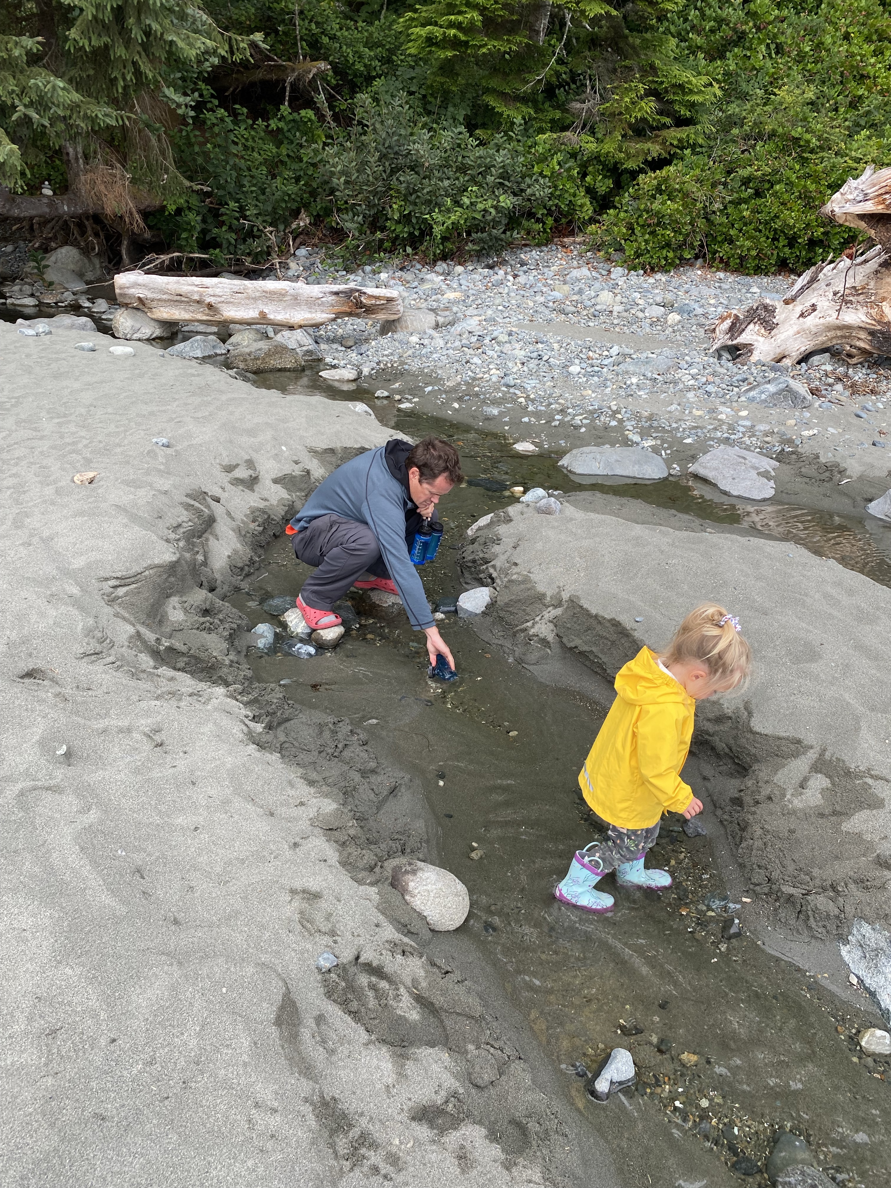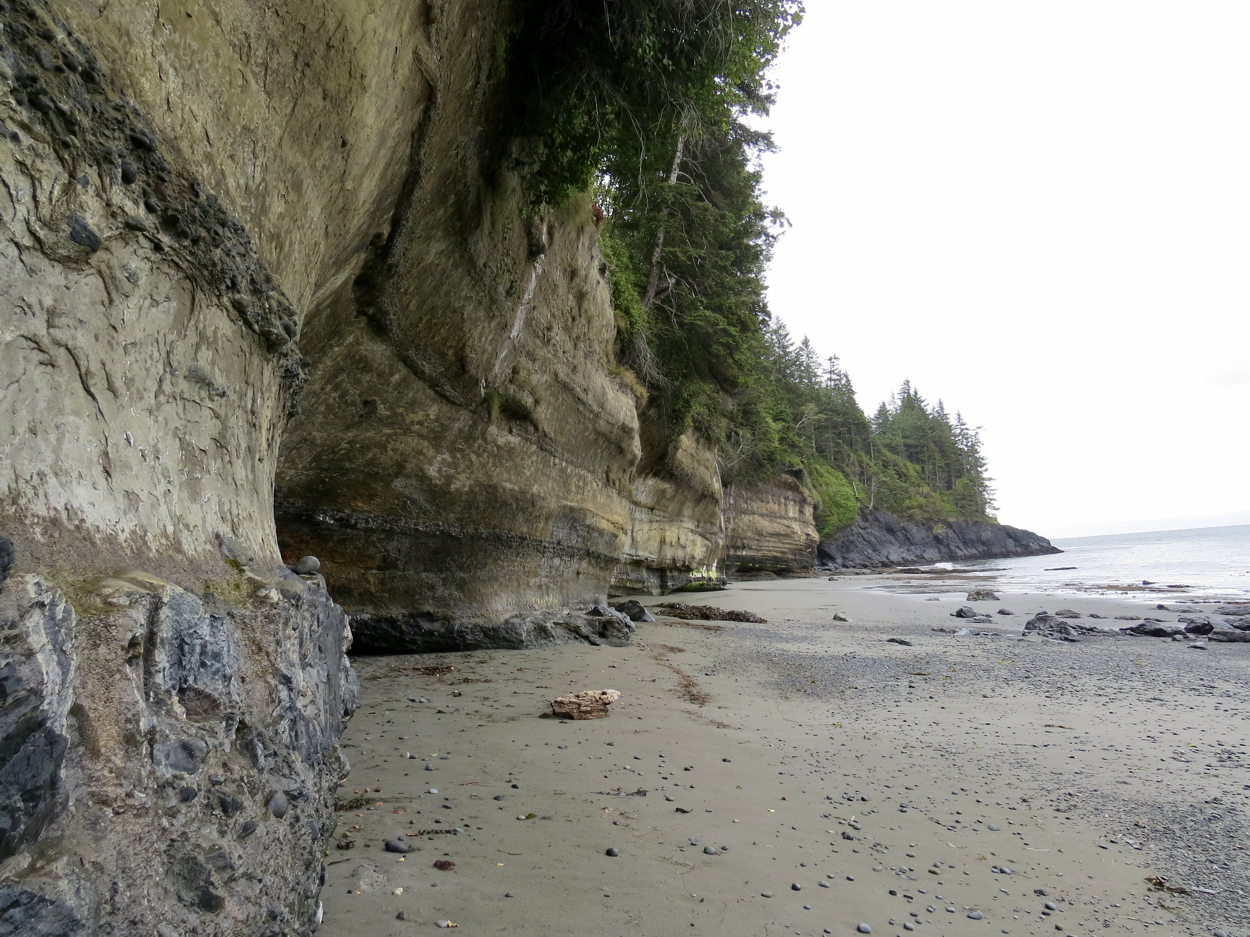 Rain in the area was lacking so this also maked drinking water a bit more challenging to get. Shannon did however find a small trickle that we could use once purified. With most of the day tourists gone by the late afternoon, Mystic beach was left to us to truly enjoy. We saw amazing waterfalls that would fall into the ocean with high tide. There was brightly coloured sandstone cliffs that had been eroded away over the years of weathering and small sea shells that the girls would collect with excitement. As the night crept on us so did the evening mist as we were soon covered in a blanket of fog. This was our sign to stow our food in the bear cache and settle into our tents for the night. China Beach parking lot is kilometre marker 0 and Mystic Beach is kilometre marker 2.