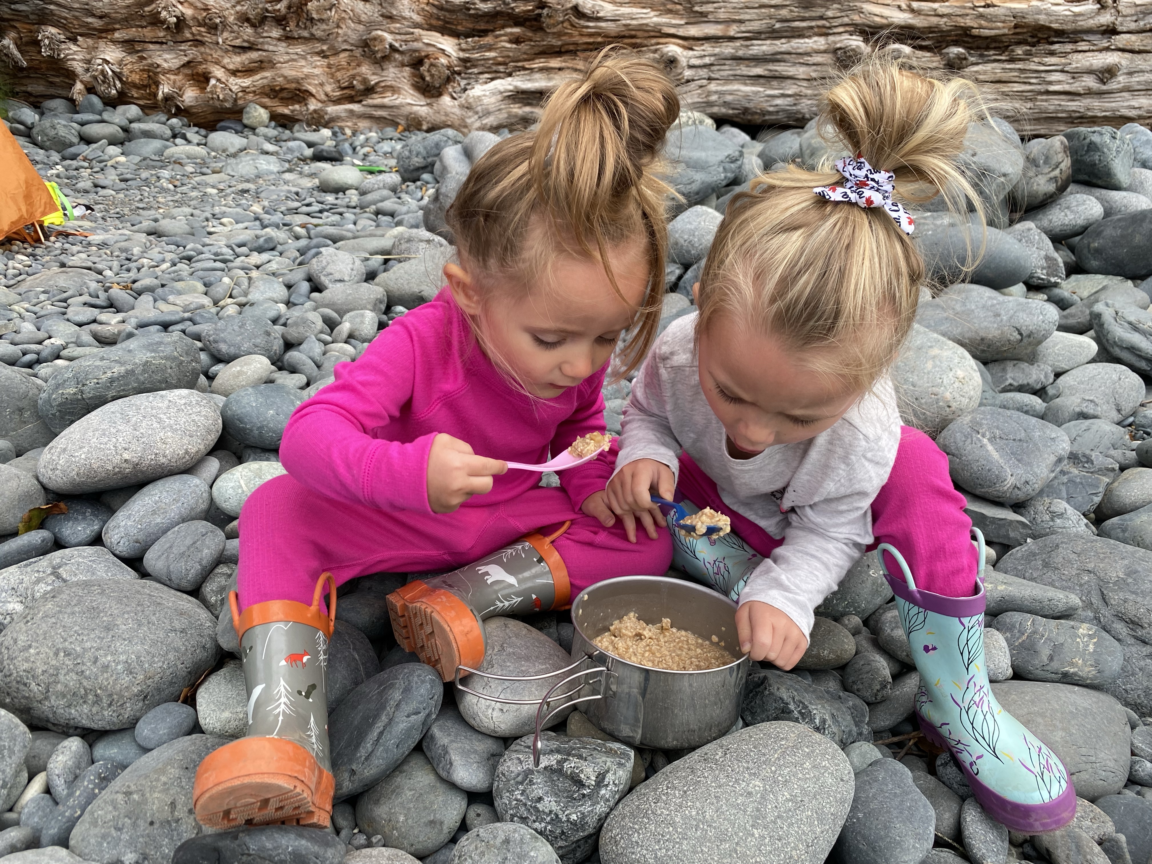 After easily locating a place for the tent with close proximity to the washrooms and food storage bins we had a bit of time to relax and enjoy our surroundings. We watched the tide go out, collected rocks with the girls and enjoyed the fresh clean sea air. Not too long after, we saw some familiar faces heading our way. Bexley and Lidija were ecstatic. As planned, our friends that we were to do the Berg Lake Trail with had now caught up to us and we had two little tent pads waiting for them. We have done a few other activities together in the past like the Twin Lakes Hike, some skating at the local pond and loads of neighbourhood gatherings. The three kids are amazing. Ever since our girls were born they have been involved in their lives. Back at home we would often hear a knock on our door asking if the girls were up from their nap yet and if they could come outside and play in the drive way. With all 5 of the littles entertained, us so called grown ups could relax, cook some meals and catch up with some stories.