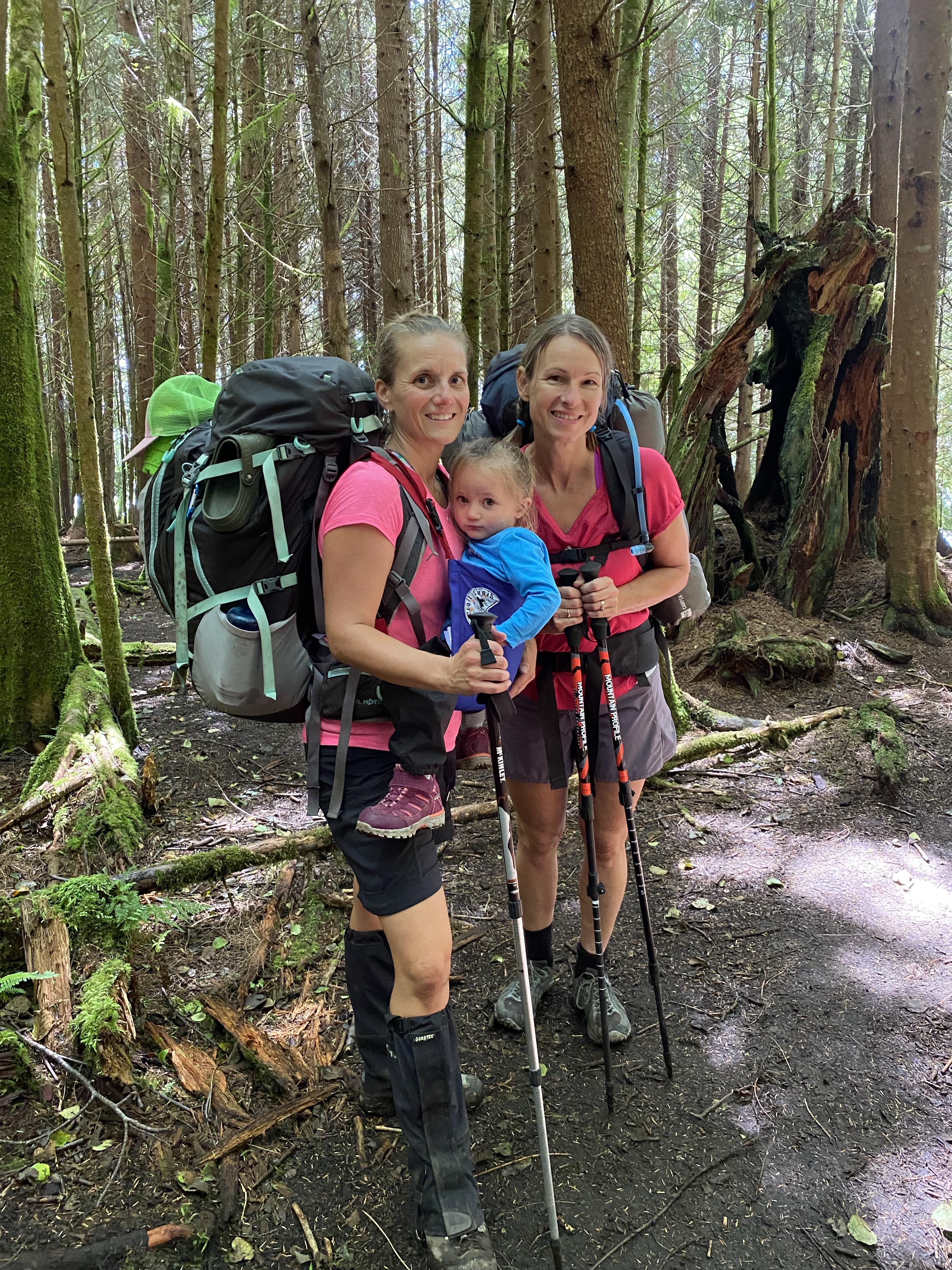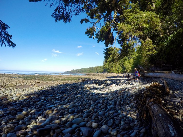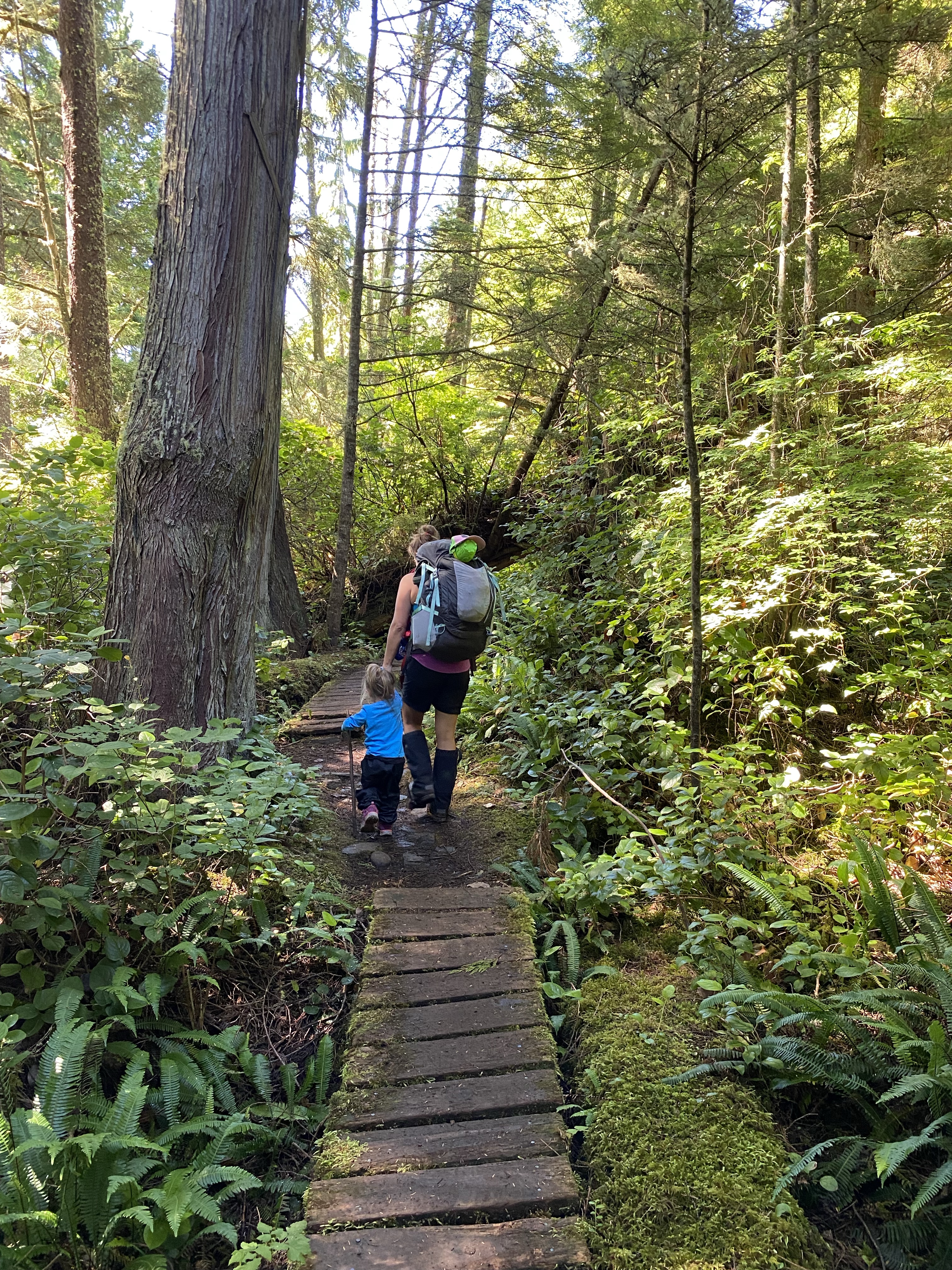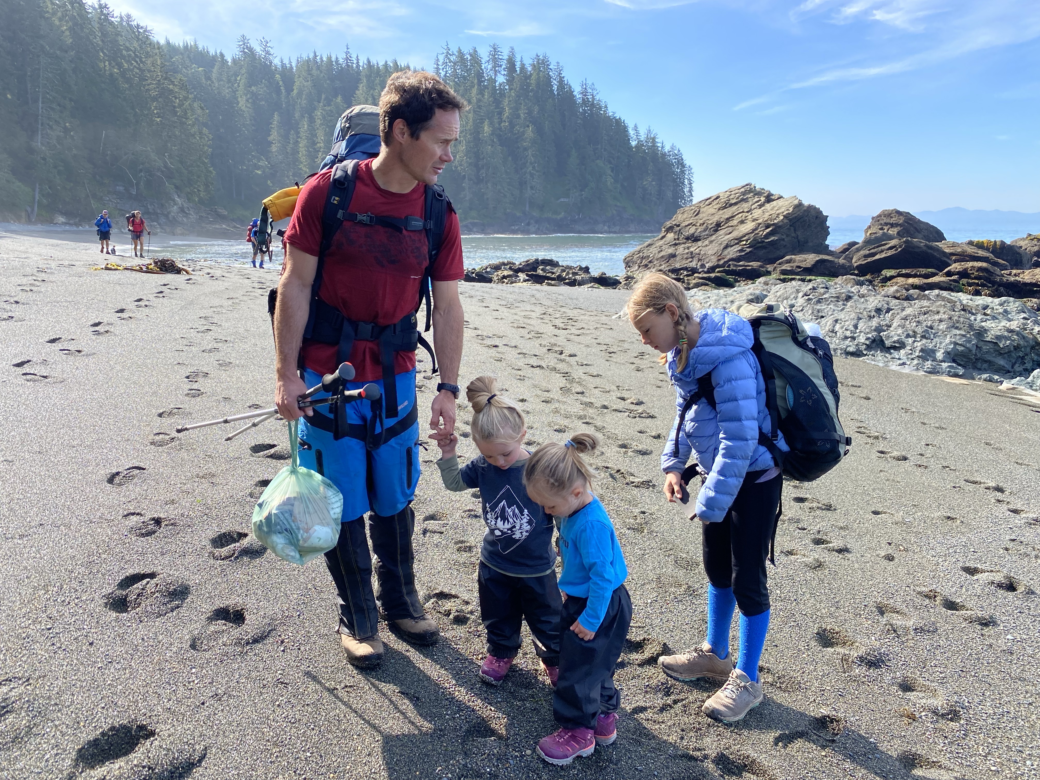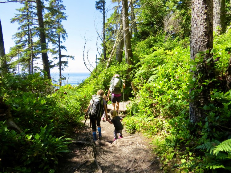 After a quick stop here for some much needed calories and hydration we pushed on down the line. We also started to notice evidence of bears in the area and came across a few other trekkers that warned us of a mom with her two cubs on the shore line. As we gazed through a small clearing overlooking the ocean we noticed 8 or so sea lions basking around on the rocks. This made the girls happy. A short while later we reached another gift on the trails. I believe it was an old surveying road that was wide and flat. We let the girls out to stretch their little legs and run down the line as we easily walked two by two next to each other. 300m further we had reached the Parkinson Creek Trailhead parking lot and almost felt in shock as we all realized it had been 5 days since we had seen or heard a vehicle. Leaving that noise behind we continued for another kilometre of this dream hiking trail before it changed back to its now predictable style we had become accustomed to.