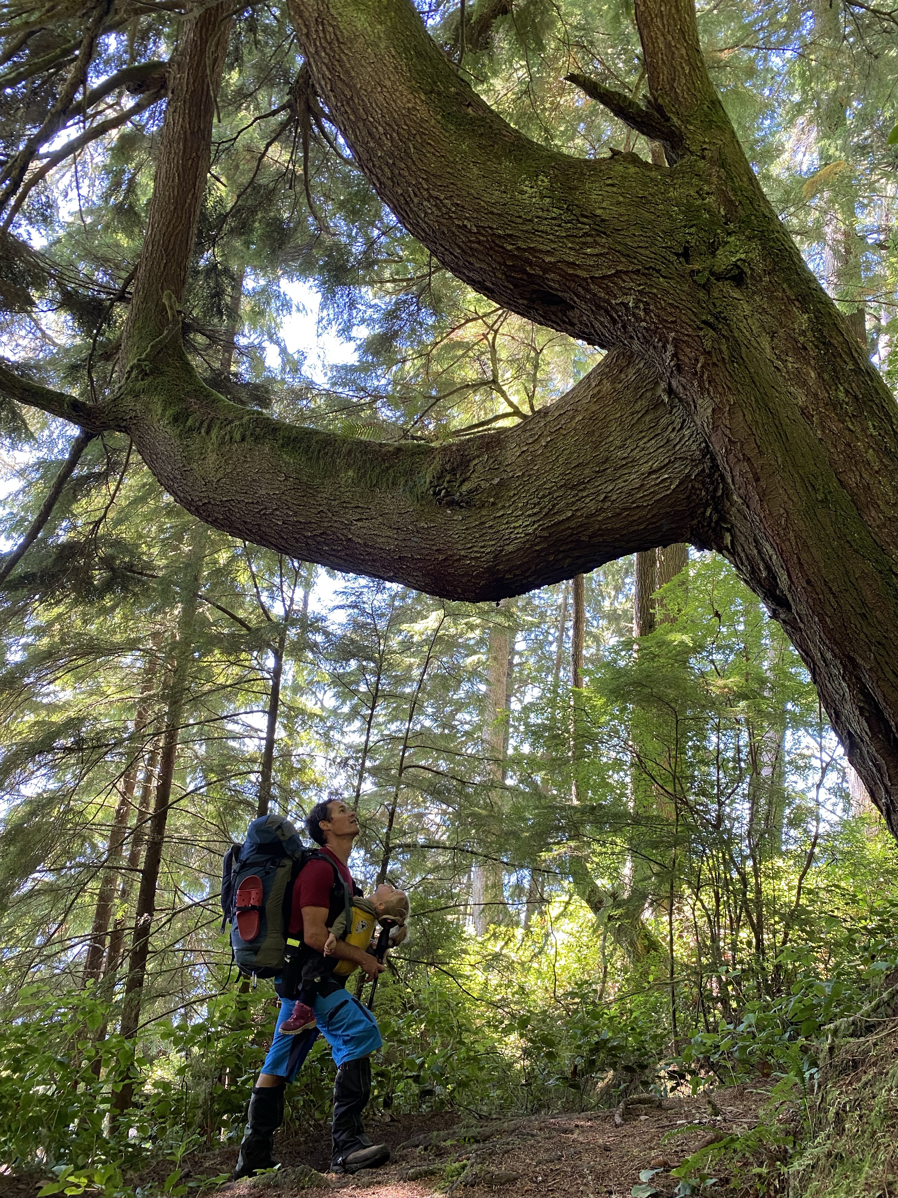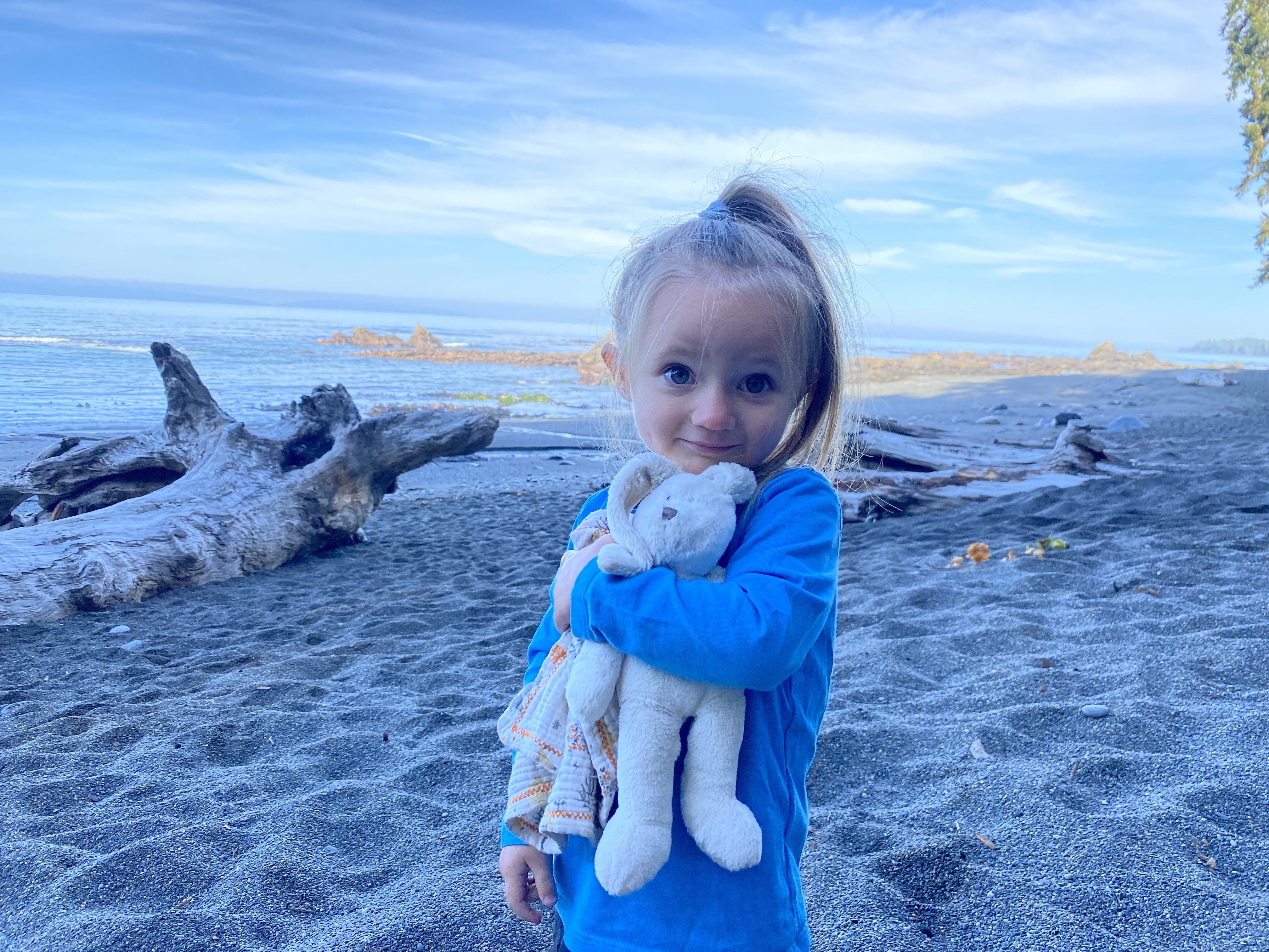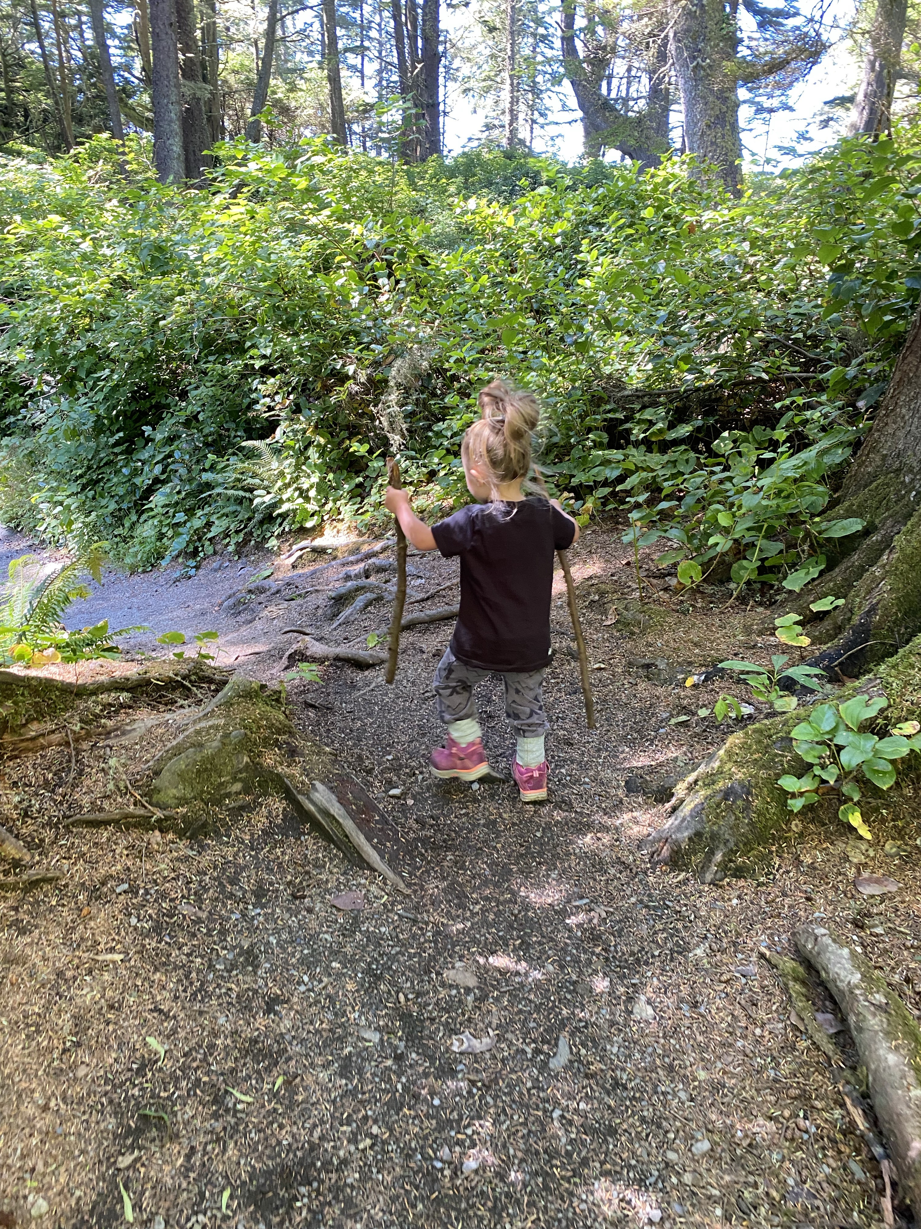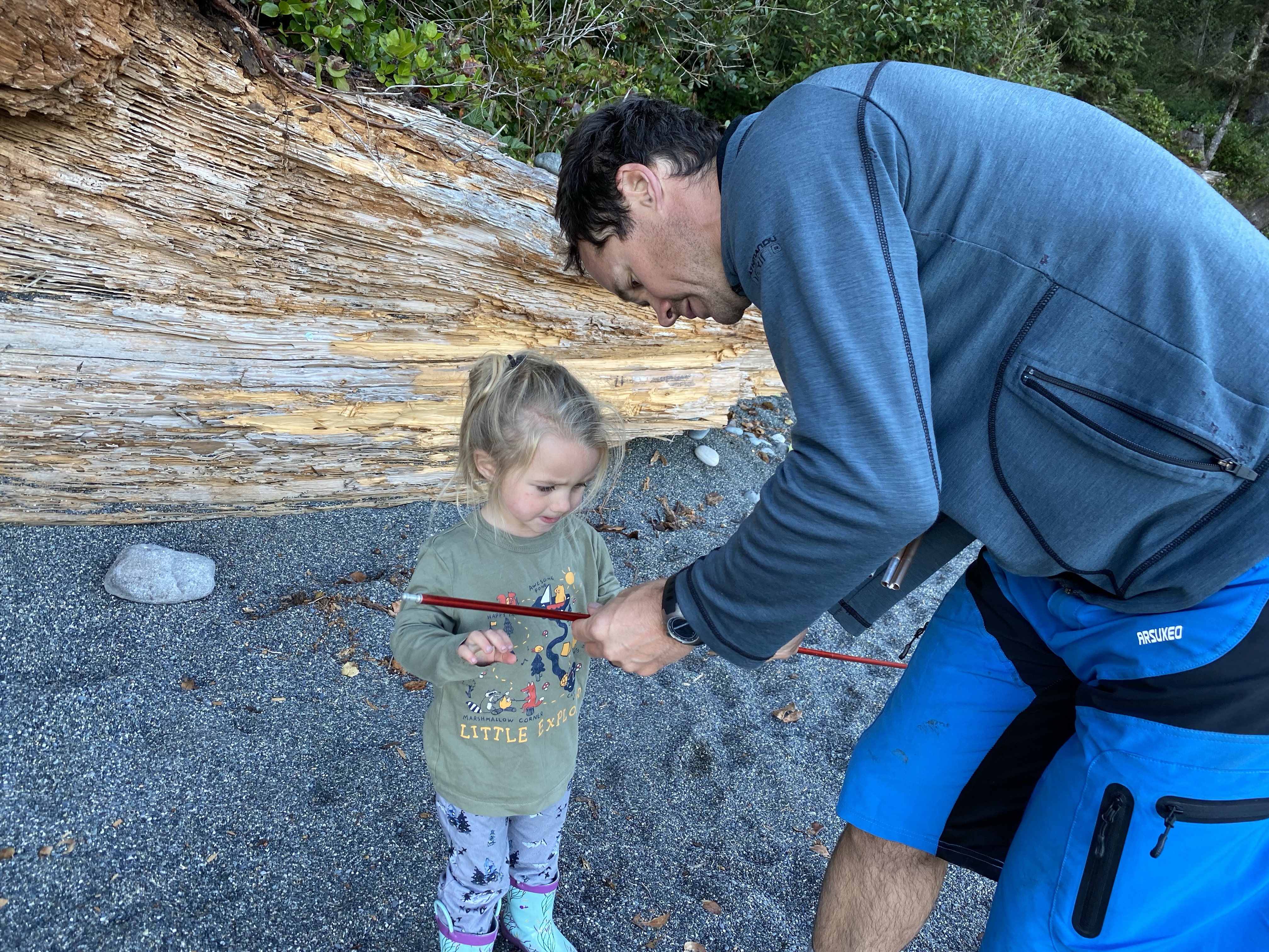 After a quick stop here for some much needed calories and hydration we pushed on down the line. We also started to notice evidence of bears in the area and came across a few other trekkers that warned us of a mom with her two cubs on the shore line. As we gazed through a small clearing overlooking the ocean we noticed 8 or so sea lions basking around on the rocks. This made the girls happy. A short while later we reached another gift on the trails. I believe it was an old surveying road that was wide and flat. We let the girls out to stretch their little legs and run down the line as we easily walked two by two next to each other. 300m further we had reached the Parkinson Creek Trailhead parking lot and almost felt in shock as we all realized it had been 5 days since we had seen or heard a vehicle. Leaving that noise behind we continued for another kilometre of this dream hiking trail before it changed back to its now predictable style we had become accustomed to.