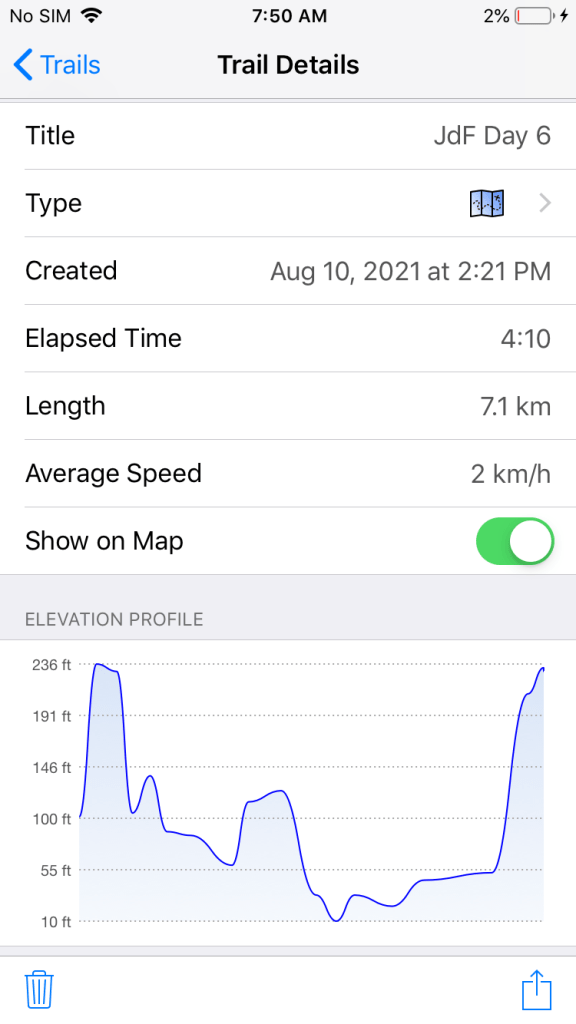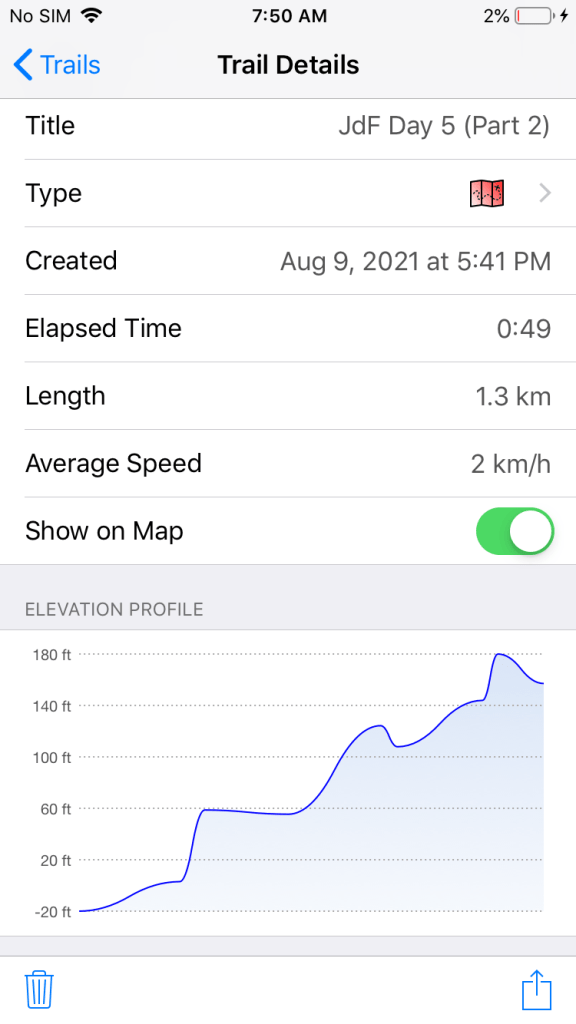 By now we have made it 45.5 kilometres with no incidents….. Just when you think you have it made, just when you are enjoying all your success and memories over the last few days accomplishment, it happens. While Shannon and Lidija were walking hand in hand over one of the more desirable on-ground wooded structures things shifted directions. Some of the nails sprung loose and the support gave way sending Shannon off balance. As she crashed her way to the ground this chain reaction brought Lidija off to the side and into the ferns as well. Luckily however they both make it back to their feet with some minor scrapes and a little blood seeping from Shannon’s eyelid. And just to top it off we were hiking at high tide so any chance of viewing the starfish and other aquatic life trapped in the tide pools was eliminated. This end of the trail excitement was not enough to have our heads hanging low. The two families made it to the 47km trail marking in the parking lot with smiles and feelings of accomplishment all around. Photos were taken and hugs were enjoyed over our little victory. Payzant at trail marker 40 to Botanical Beach parking lot at marker 47 with a max elevation of 72m over the 7 kilometres.