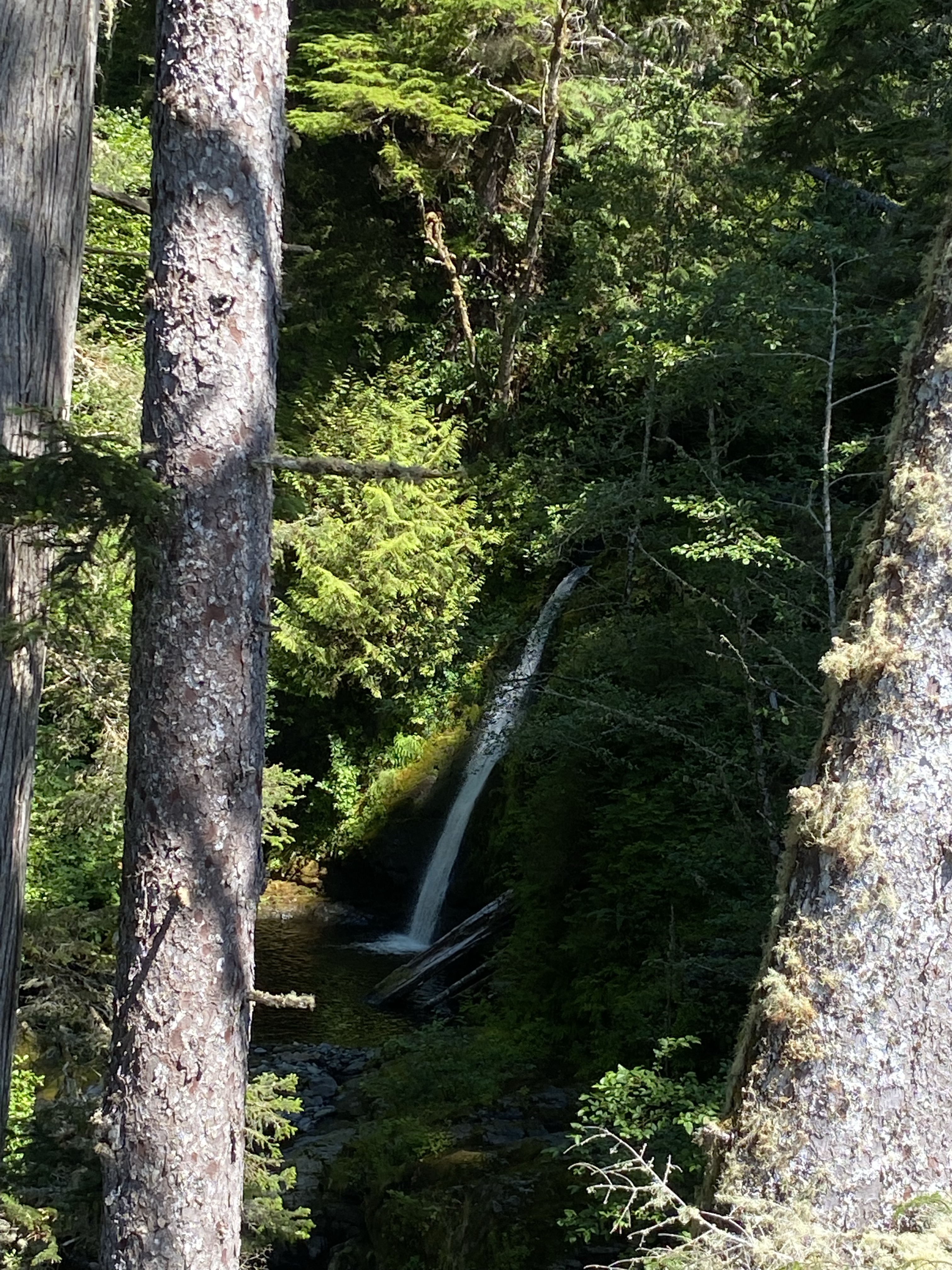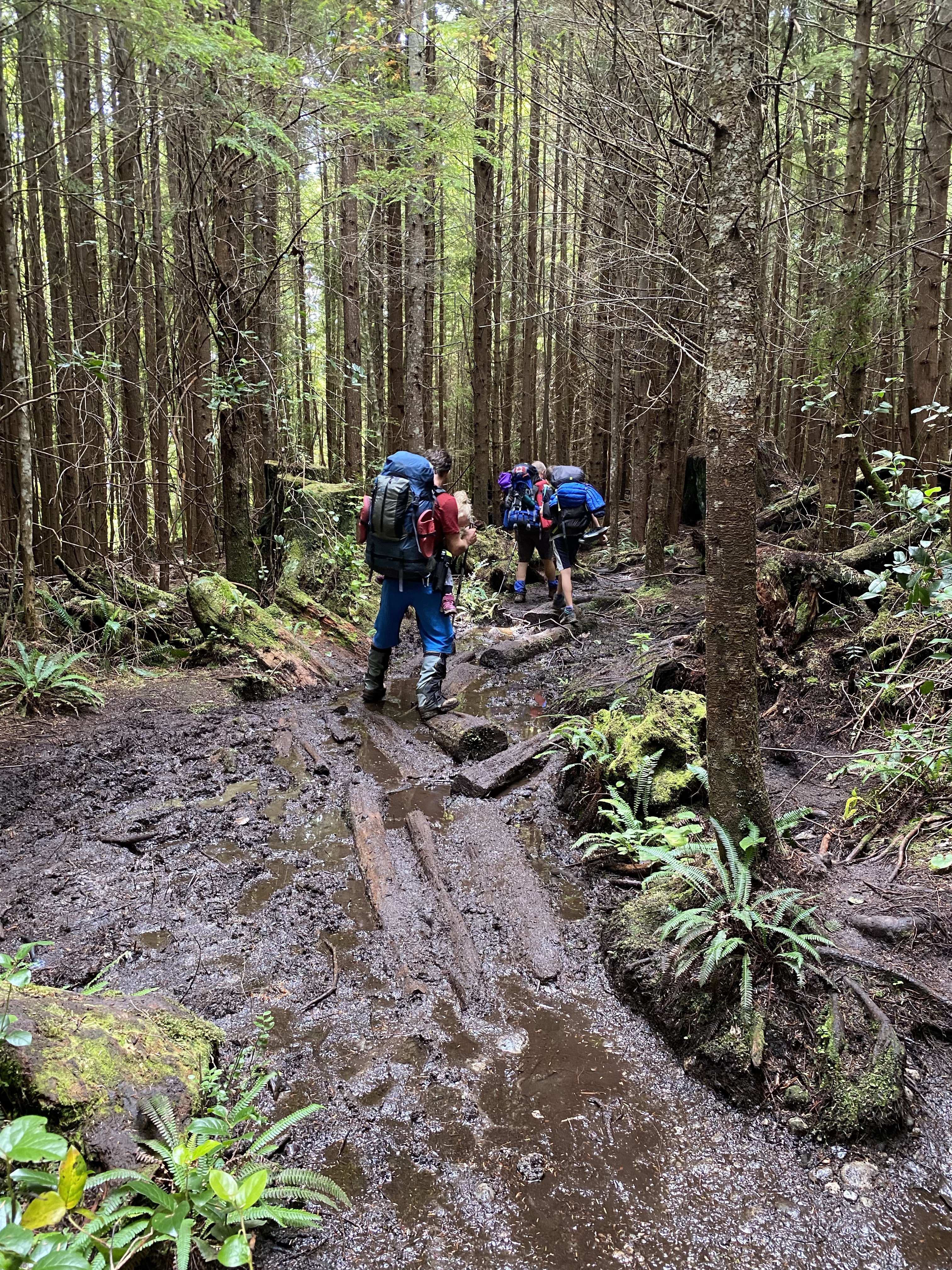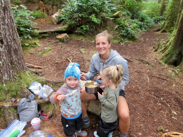 Like Little Kuitshe Creek, Payzant Creek is not on the ocean side. They have 8 or so designated camping spots so space is limited. Our two families managed to claim some of the last pads and as other groups were coming in from both directions I am unclear on what their situation was for the night. Being in the rainforest the trees were so dense that you could not even just find a space tucked in the trees somewhere. We started our routine. Tent was set up, changed into some dry warm clothes, twins off with the others to play in the woods, Shannon started on dinner and I went in search of water. Just as we entered the camping area we crossed over a bridge so that is where I started. After talking with some others this was the only location. Walking down to the creeks edge you couldn’t help but notice the beauty in the three tiered cascading waterfalls buried in the canyon surrounded by ferns and lush greenery. I also couldn’t help but notice the small trickle of beige tinted water that was now our drinking source. But luckily, after full and non-upset stomachs we all managed to fall asleep peacefully for the night, a touch earlier this time as the darkness settles in much faster when you are buried in the trees.