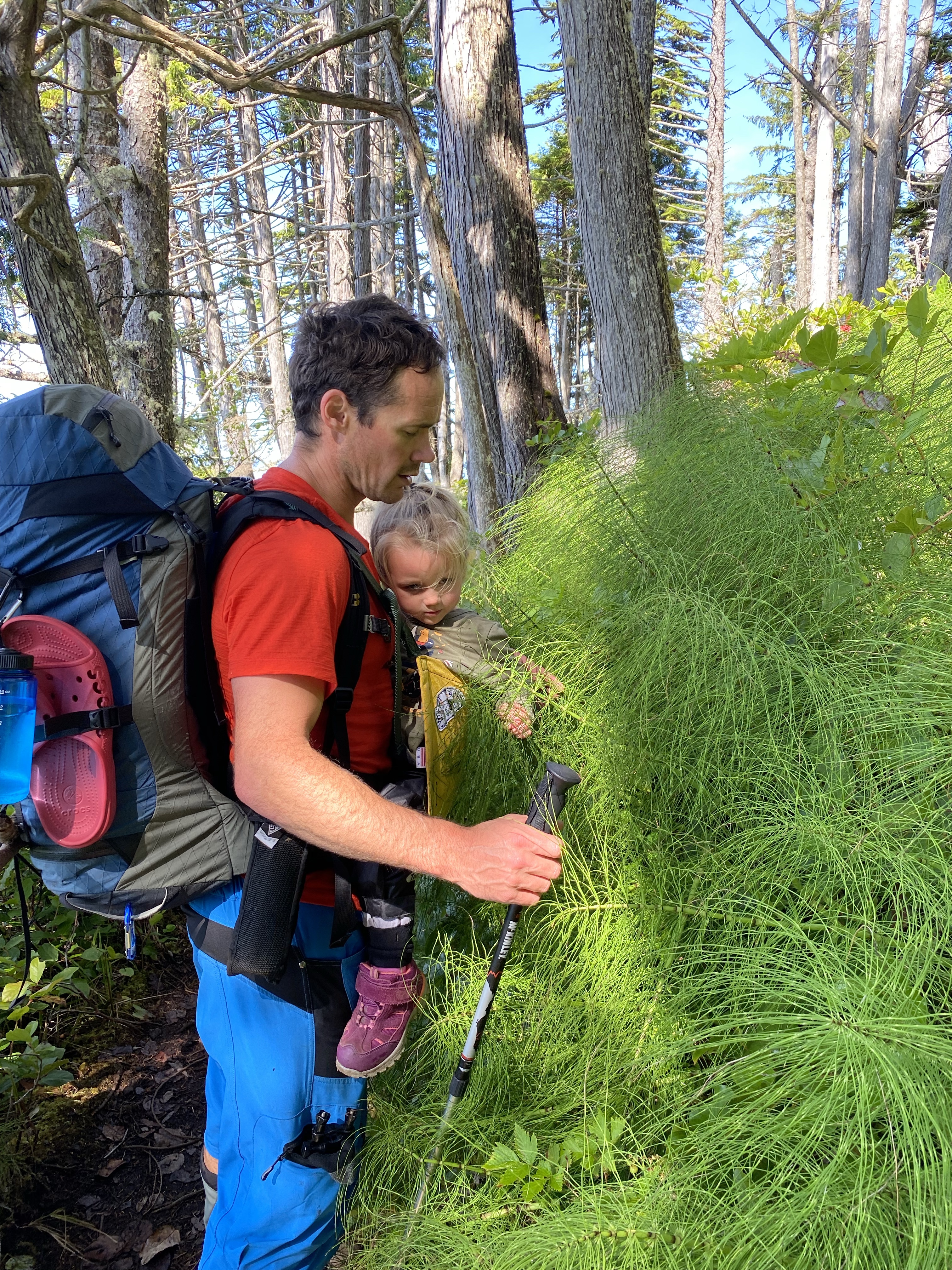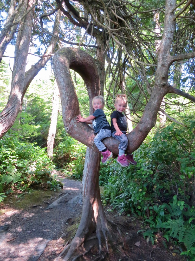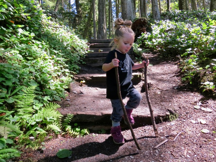 Slightly after five kilometres in for the day we reach a trail junction. Turn right and you return directly to the parking lot. Continue straight and you cruise the Botanical Beach Loop along the coast with its tide pools and marine life before returning to our awaiting truck. Beach loop it was. The girls had been out of the carriers by now and leading the way down the line.