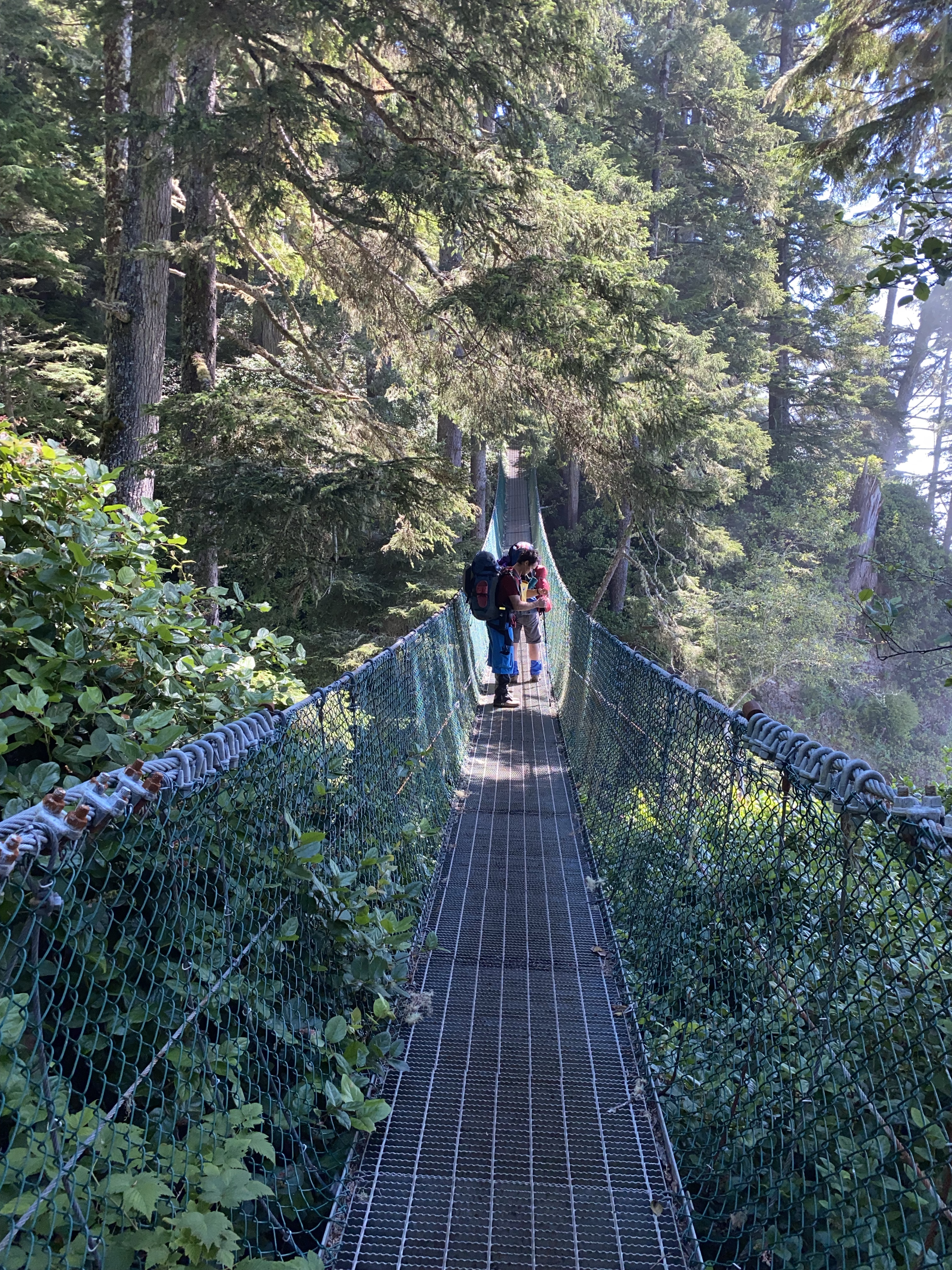 The nine of us continued on down the beach. The tide however was working in our favour and the beach bypass was available. We continued down the shore taking in as much of the coast line as we could. Then came the moment where we saw the hanging orange and white bouys and were forced back inland and through the rainforest. According to the BC Parks map this section of the route is rated at a “Moderate” and it was definitely showing. After the previous sections of the trail it was much easier hiking but still not just a walk in the park. The trail is still heavily used and proper maintenance is expensive and ongoing. I am guessing that BC Parks is lacking in both these categories. We still came across broken wooden structures, missing steps, steep climbs and muddy sections. A few kilometres in we came across another suspension bridge. As per previous bridges, the girls wanted out for a run and bounce.