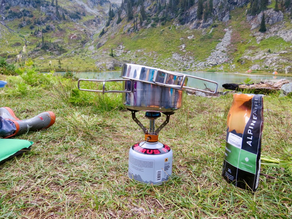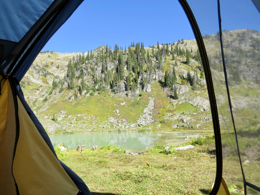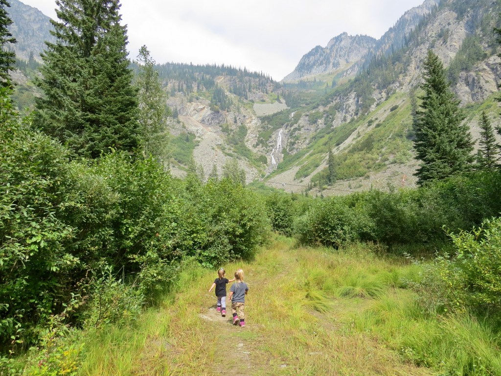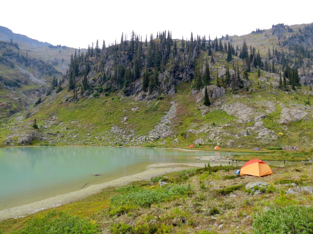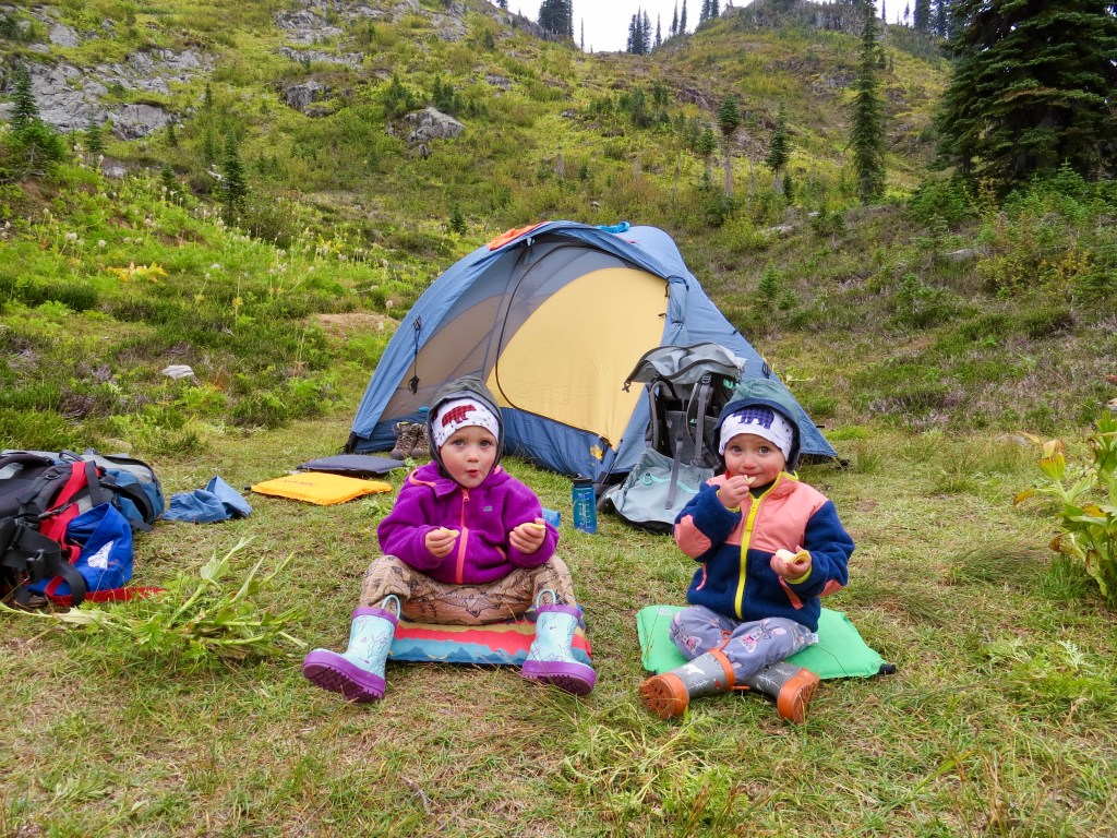 The trail flattened out at 2000m above sea level and home to three glacier fed lakes with amazing mountain views to stimulate our senses. We crossed the drainage creek on the right where we circled on the right side of the lakes and found the perfect spot next to the second lake to set up camp for the next few nights. This is a BC recreation site area so there are no designated tent pads and any facilities like toilets and bear caches are non existent. There were however a few clusters of trees next to us that we could use to hang our food in the evenings. We started on a spaghetti dinner as the girls raced around and smelled every wild flower they could get their eyes on.