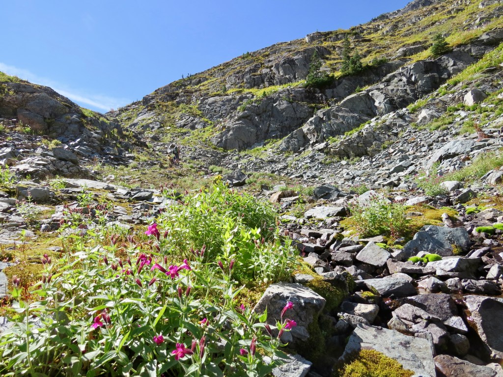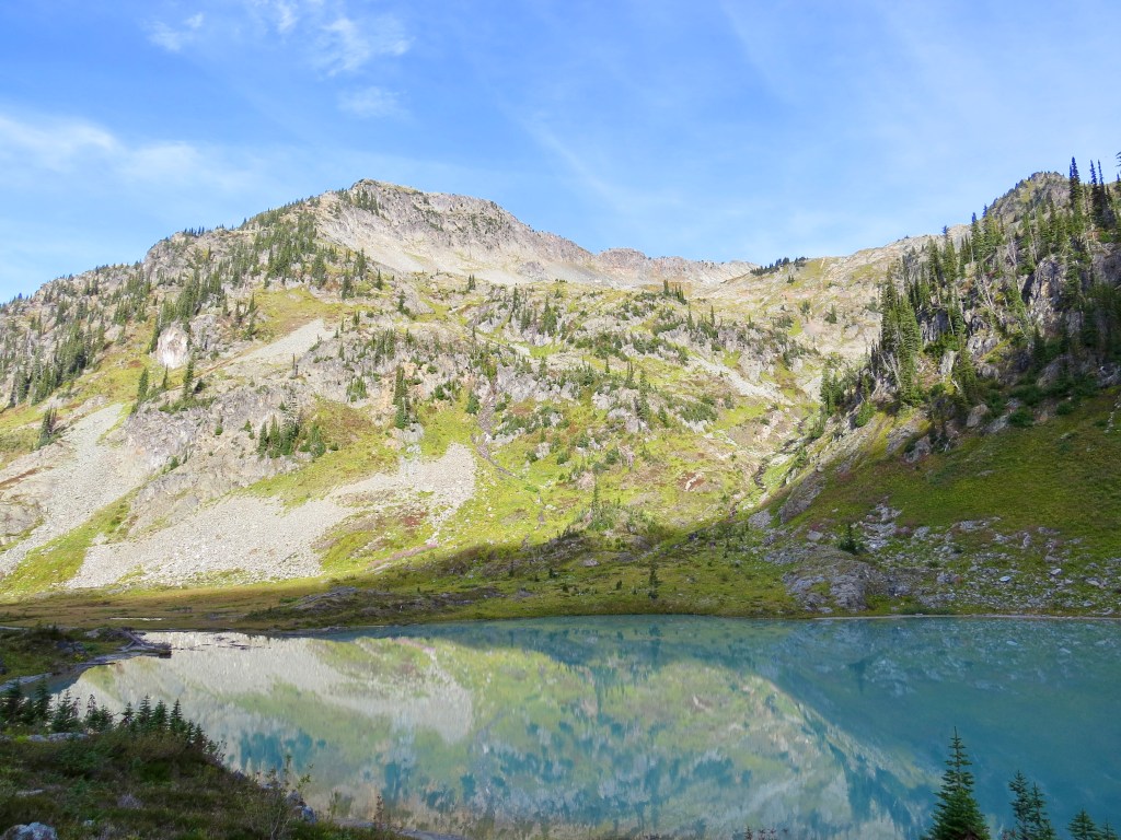 The single track started again and we twisted our way through a mix of pine and cedar trees for the next couple kilometres. We then met up with another old mining road where we turned left on this gradual incline for a handful of minutes. The trees started to open up as we entered the basin and some old mining cables came into view overhead. You loop around under the cables a second time then the trail turns back to a single track and begins a gradual climb for the remainder of our hike to the lakes. The views were forever expanding the higher we climbed and shade got more limited. We circled our way up the valley on a well groomed trail with the odd downed tree and rock slide area.