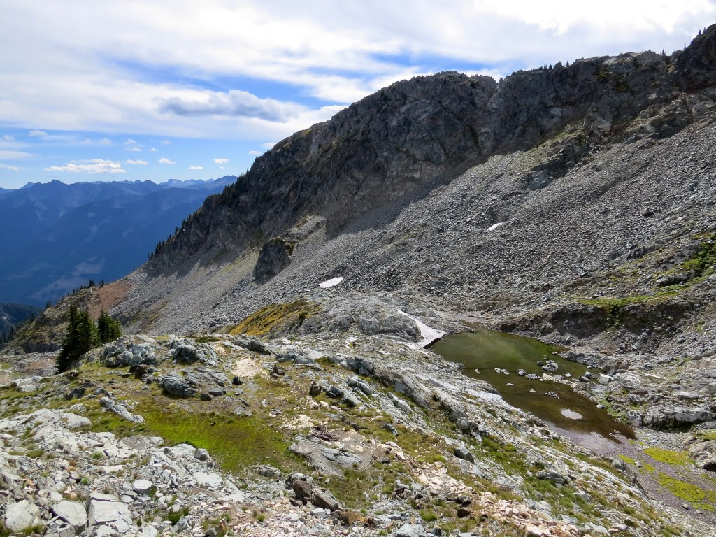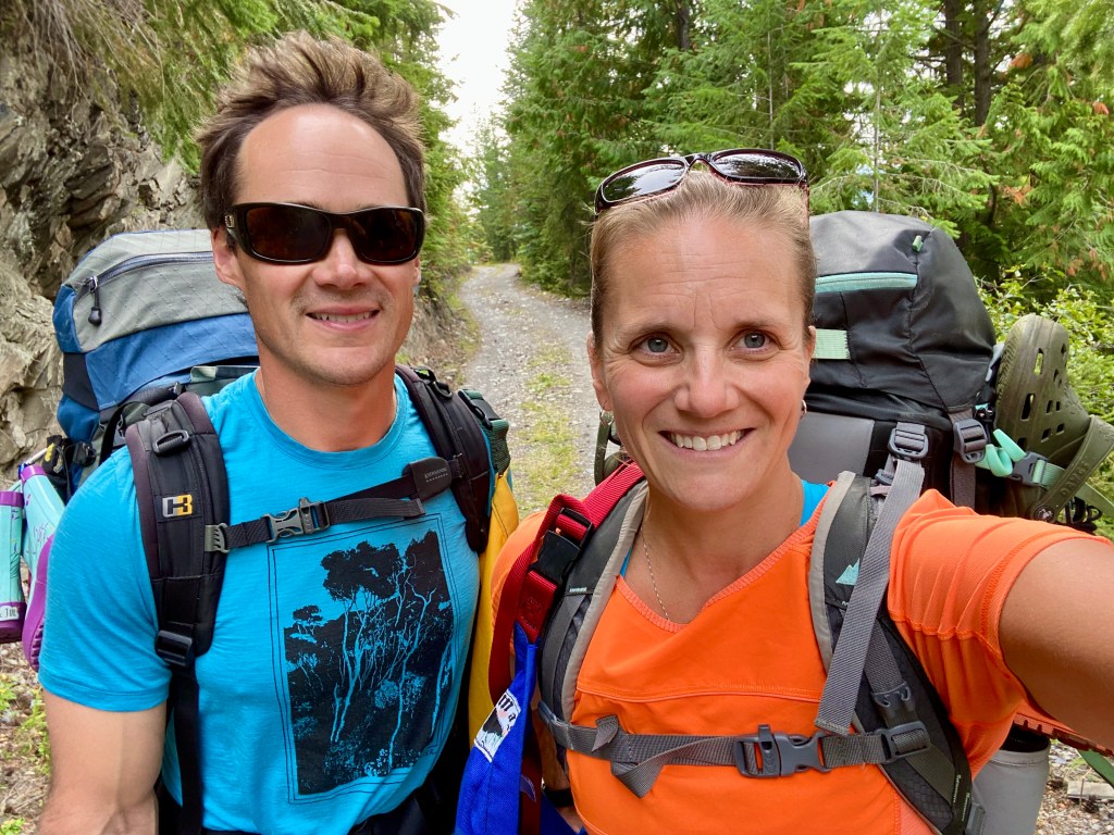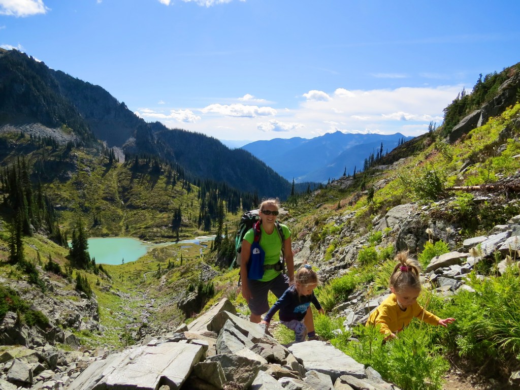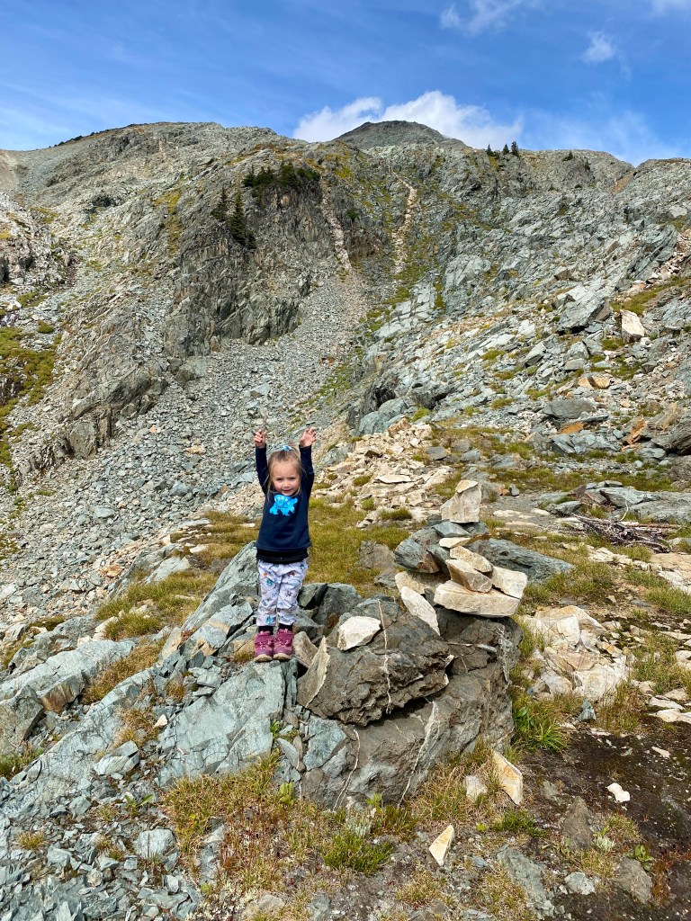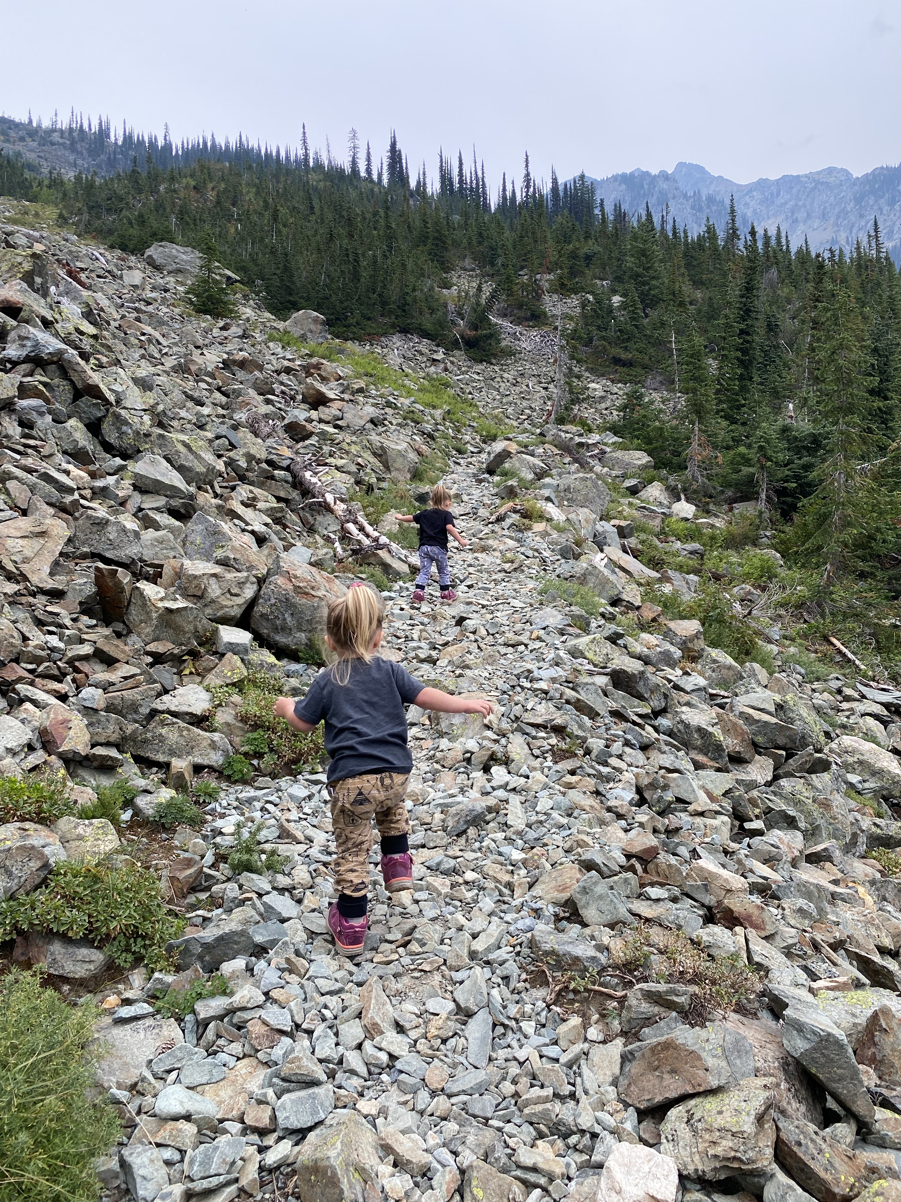 We meandered passed a mountain lake, then one more. From here we chose to make a stop for lunch and the day. As we turned our backs on mount Brennan, we looked down on our tent below and the amazing colours of the lakes. We could see Kootenay lake far in the distance and the Purcell mountain range beyond that. The wind was a bit chilly so we took shelter behind some rock ledges and covered up with our jackets. The days 2 hour climb took us up 350m in 1.8kms and the girls hiked every step.