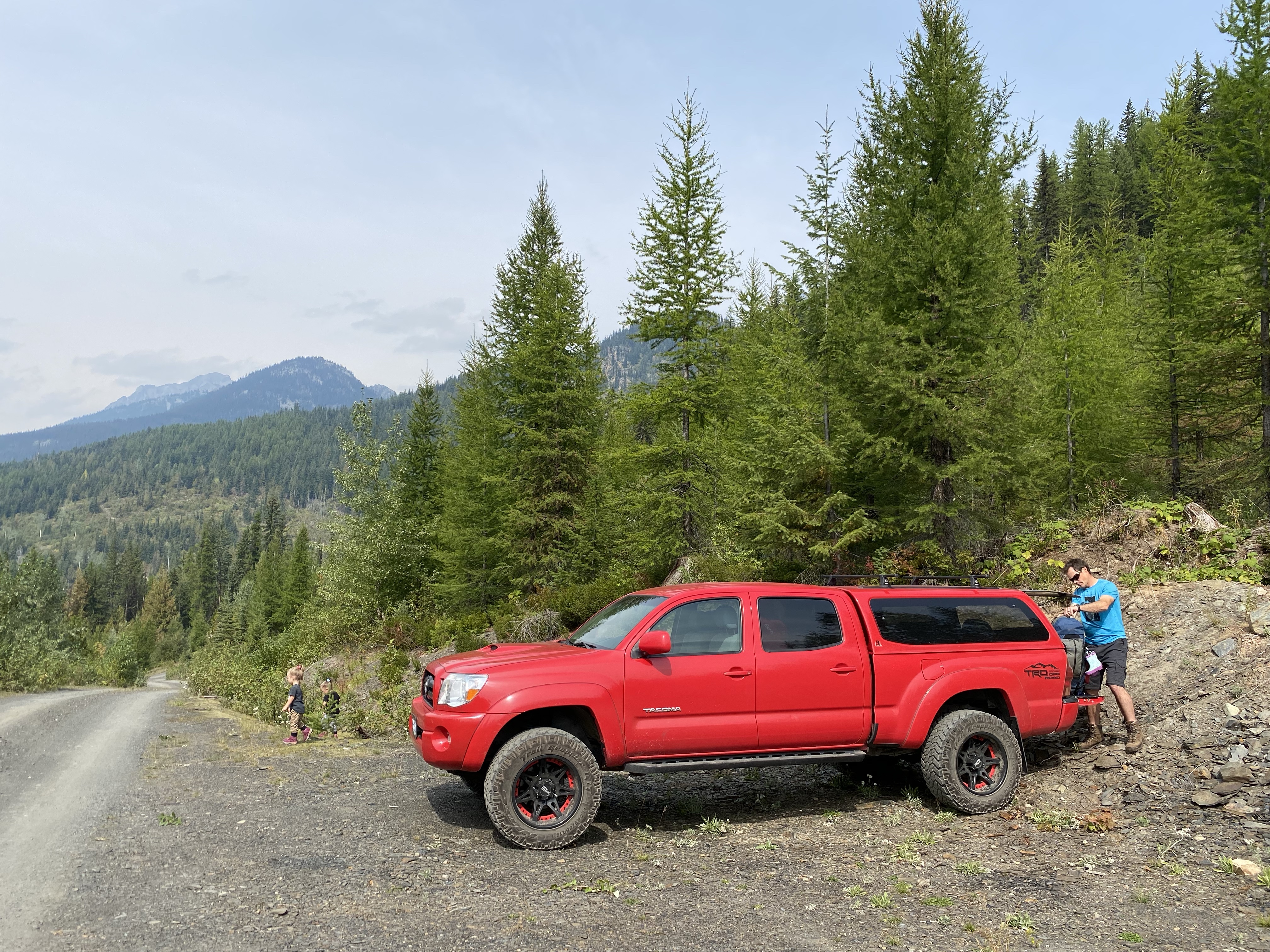 The truck tires started rolling at 7:00 am with the west Kootenays being the destination. Driving east, crossing the Needles cable ferry, passing through New Denver and half way to Kaslo we took a turn north up the Rossiter Creek Forest Service Road (FSR). After an easy 7km drive the road widens to make for a more than ample parking lot. Being 11:30 now we enjoyed a tailgate lunch in the sun and forest fire smoke with the four of us eager to get moving.