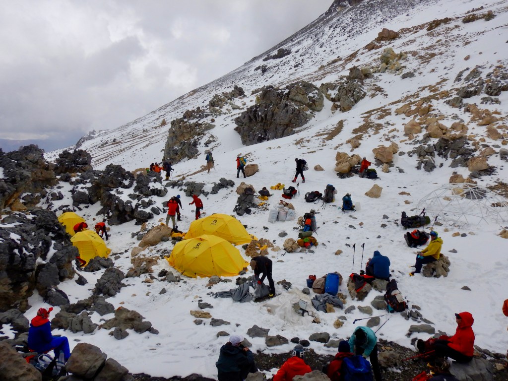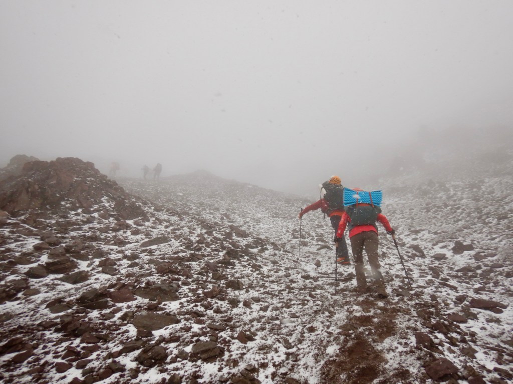 Camp 1 was only 2.5 hours this time, as our acclimatization had shaved off half an hour from the previous trip. By the time we approached camp the tents were pitched and covered in snow. We quickly set up our sleeping arrangements and climbed inside. The guides served snacks, water, tea and dinner for us at our tent door so all we had to do was relax. The storm lasted a short while longer with more snow and wind and a few claps of lightning. Eventually the skies cleared and a calming soft blanket of snow covered the mountain side.