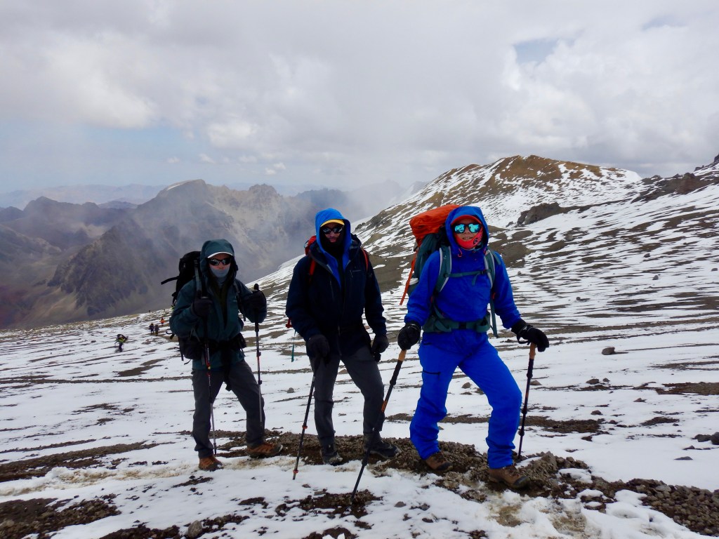 Day 12 – Rest day at Nido de Condores (5560 m, Camp 2).  The morning sun peered through the clouds while we ate breakfast. By mid morning half of us decided to head out for a walk so we wandered down to the lake across camp to fill our main jugs. With nearly 30L of water between the crew we casually returned to the tents.  Just after arriving the clouds rolled in and the snow started to blow.  The guides asked us to go back to our tents and rest until the conditions improved.  With the snow came more thunder and lightening and the safest place for us was in the tents.  We played cards and relaxed while being served hot drinks and lunch to our doors.